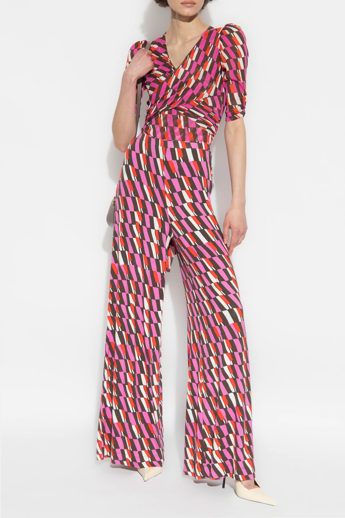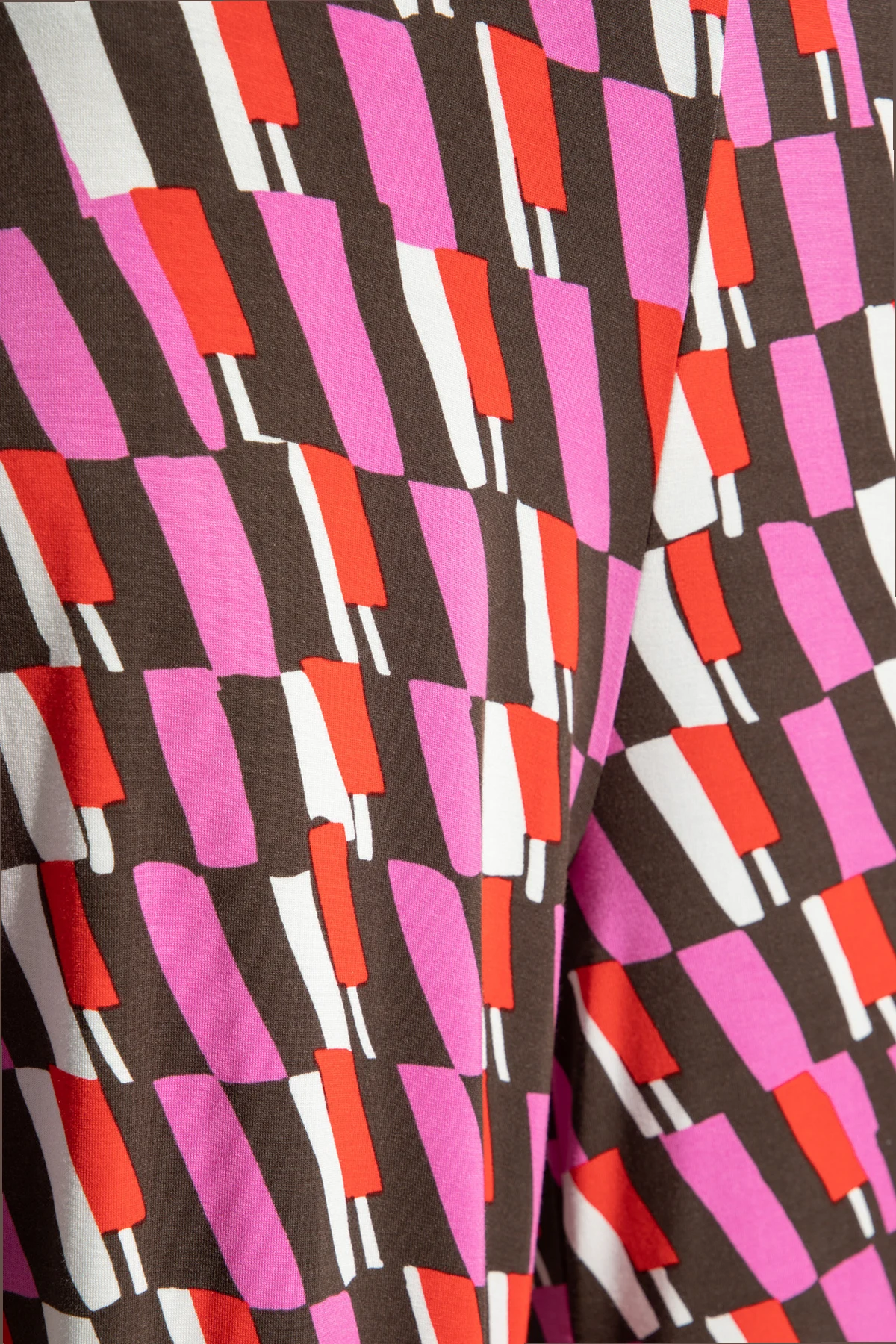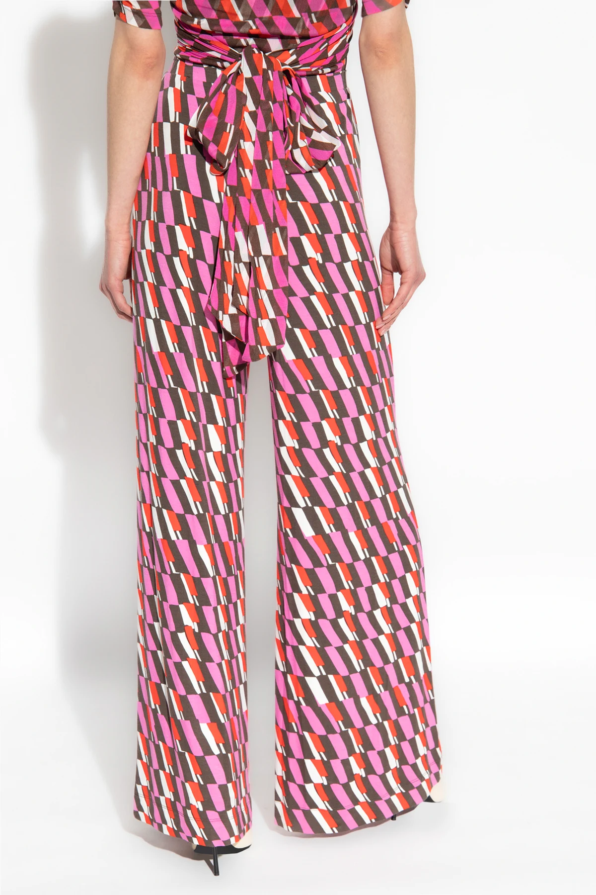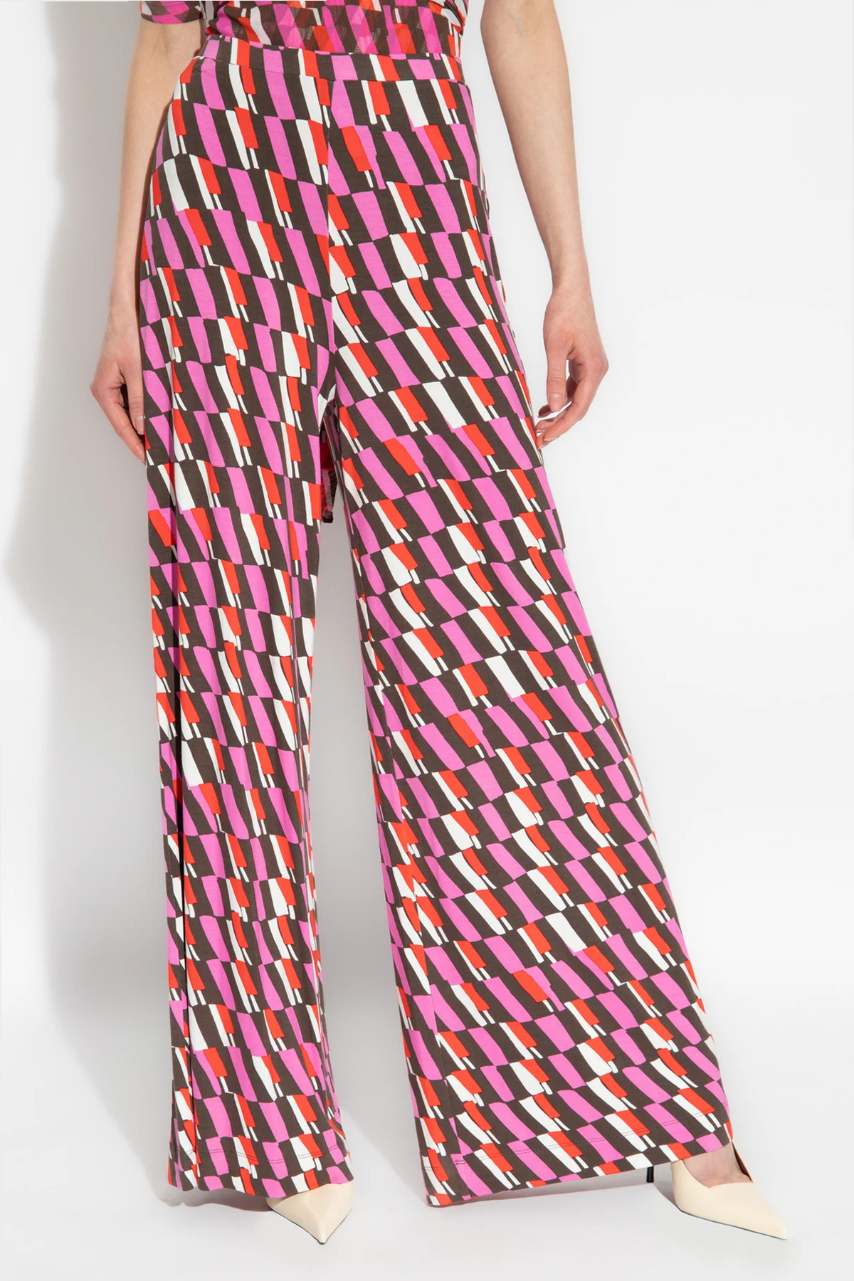 Multicoloured ‘Holly’ trousers from Diane Von Furstenberg. Embellished with a geometrical pattern, this pair falls with wide legs and features an elasticated waistband.