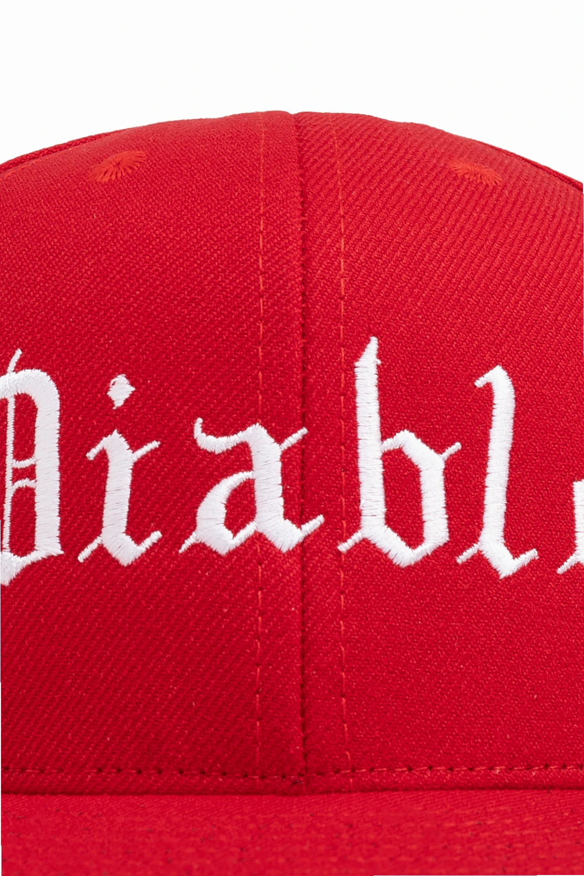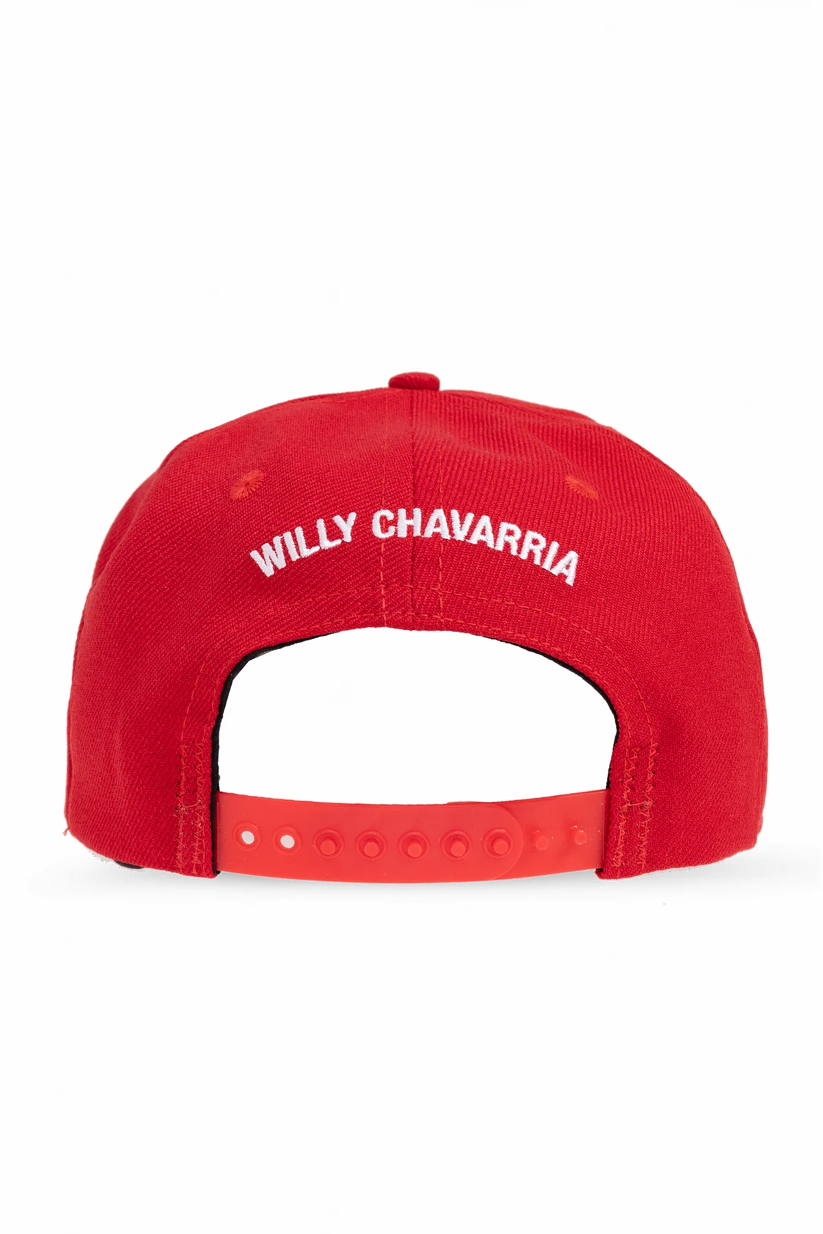 Experience unparalleled sophistication with this striking snapback cap, impeccably designed by Willy Chavarria. Crafted from robust cotton fabric with a refined diagonal weave, this accessory boasts a bold, monochromatic crimson hue for an unmistakable statement. The front presents an artfully embroidered \"Diablo\" logo in contrasting white Gothic script—both distinctive and artistically refined. The rear features the designer’s name, WILLY CHAVARRIA, emblazoned in crisp white thread. The structured, straight front panel and impeccably flat visor epitomize contemporary elegance, while the signature red snapback adjustment ensures a tailored fit and lasting comfort. Why choose this product? Meticulously crafted from high-quality cotton fabric Exclusive, artful details from a renowned designer Adjustable snapback for a perfect fit Bold Gothic embroidery ensures unmistakable distinction A premium accessory for elevating any ensemble