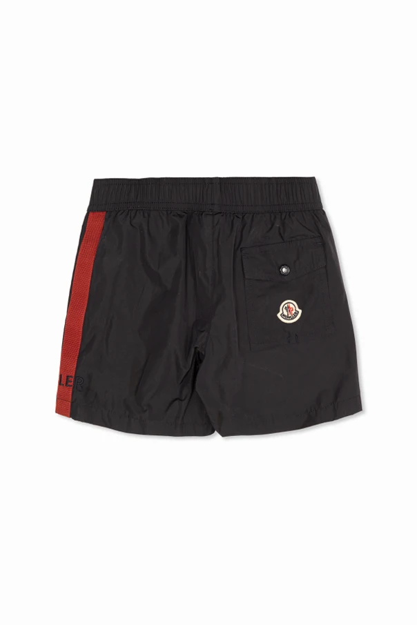 Imbued with a refined sporty allure, these Moncler Enfant swim shorts in radiant red fuse contemporary aesthetics with elevated functionality. The classic short silhouette features a smooth, quick-drying synthetic fabric, offering both enduring comfort and a hint of luster for a sophisticated beach or poolside look.