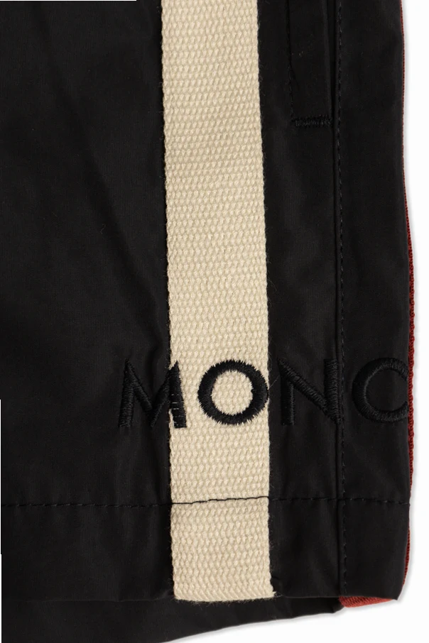 A distinctive vertical band in contrasting hues graces one leg, adorned with the partially revealed, exquisitely embroidered designer name, lending a touch of exclusivity. Complementing the front, the back showcases a practical flap pocket with a button closure, elegantly accented by Moncler's signature logo patch for unmistakable branding.