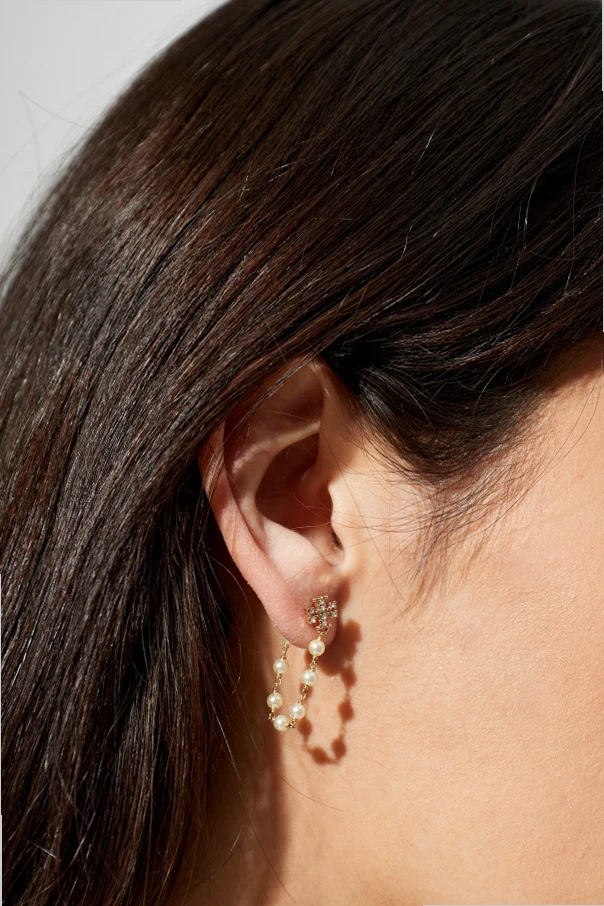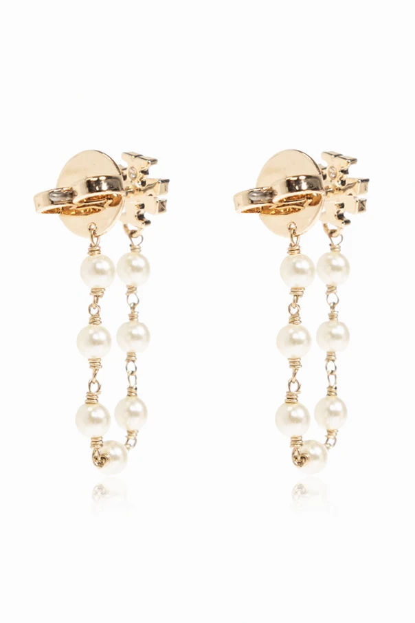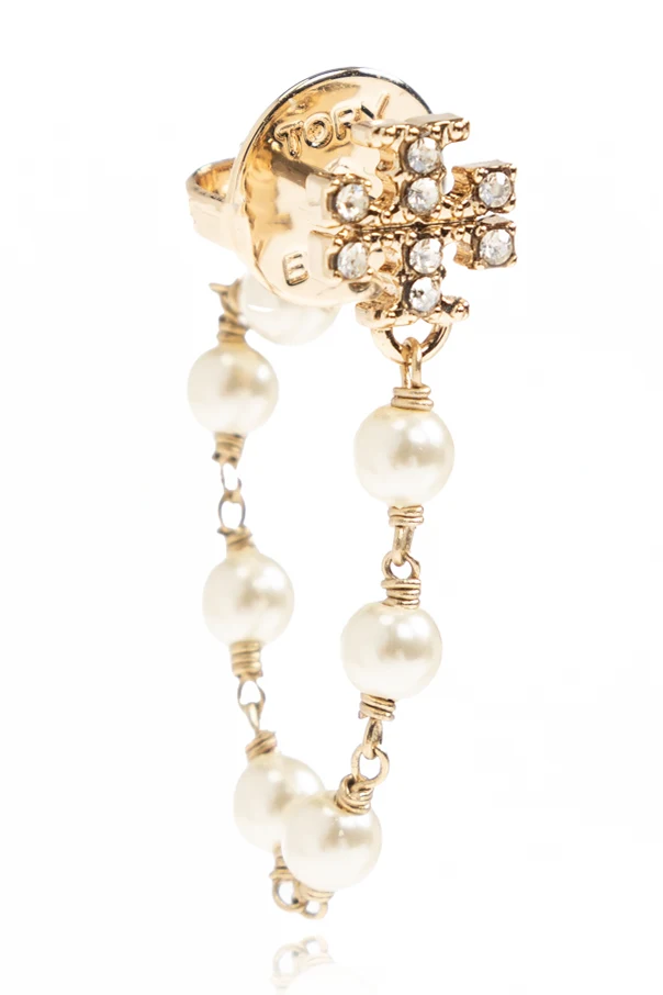 Elevate your ensemble with the exquisite sophistication of these Tory Burch earrings , designed in an alluring gold tone . Radiating refined charm, each earring features a pair of delicate chains adorned with lustrous glass pearls that sway gracefully with every movement.