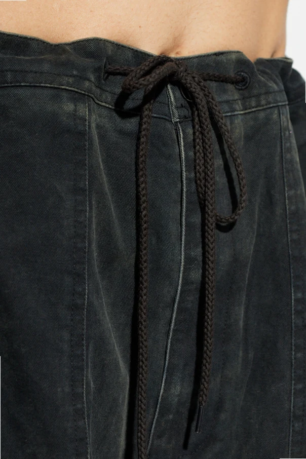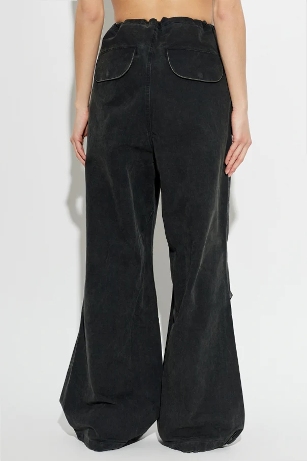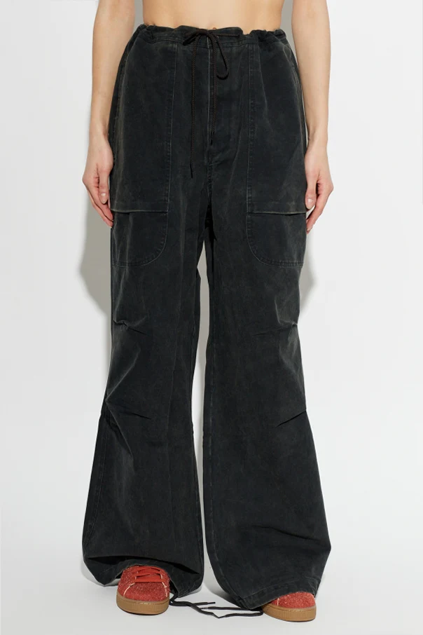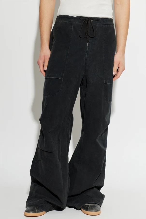 Distinctive construction sets these trousers apart, with an adjustable drawstring waist replacing traditional fastenings for effortless comfort. Oversized patch pockets on the front thighs combine with rear flap pockets, while striking vertical and horizontal topstitching imparts a bold, industrial sensibility. Their minimalist design, free of ornamentation, ensures versatility for any refined casual ensemble.