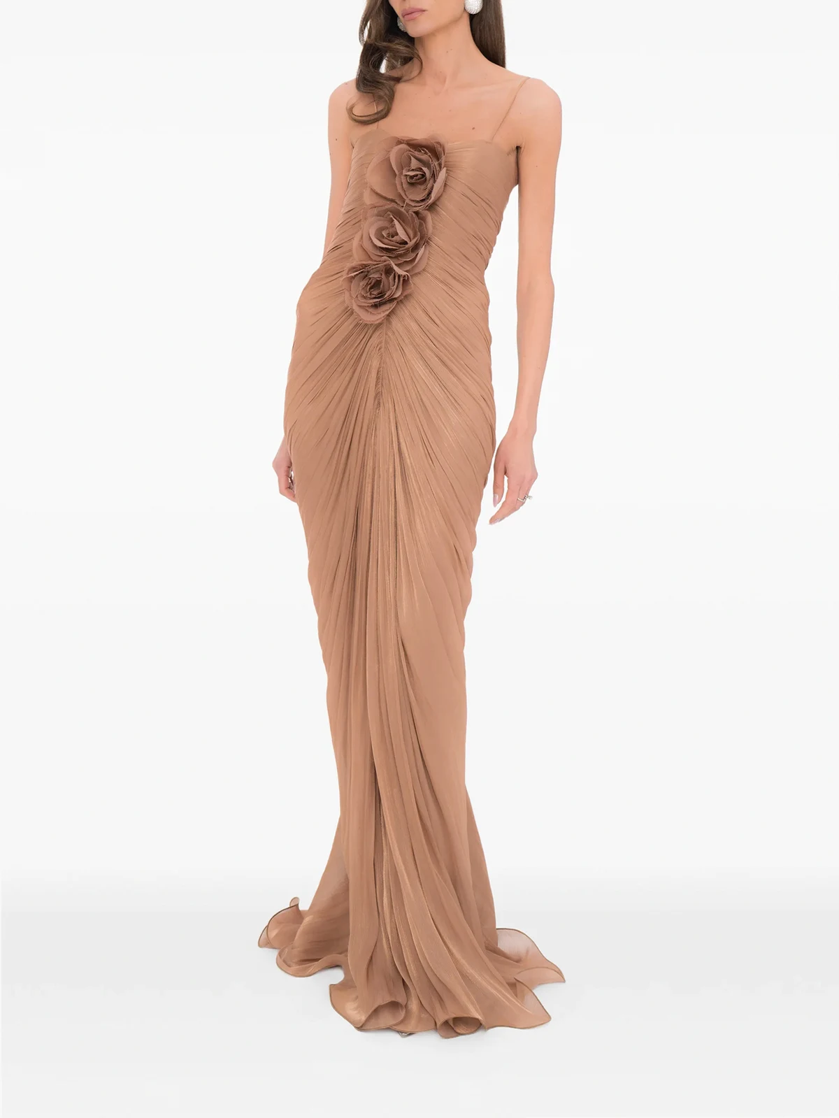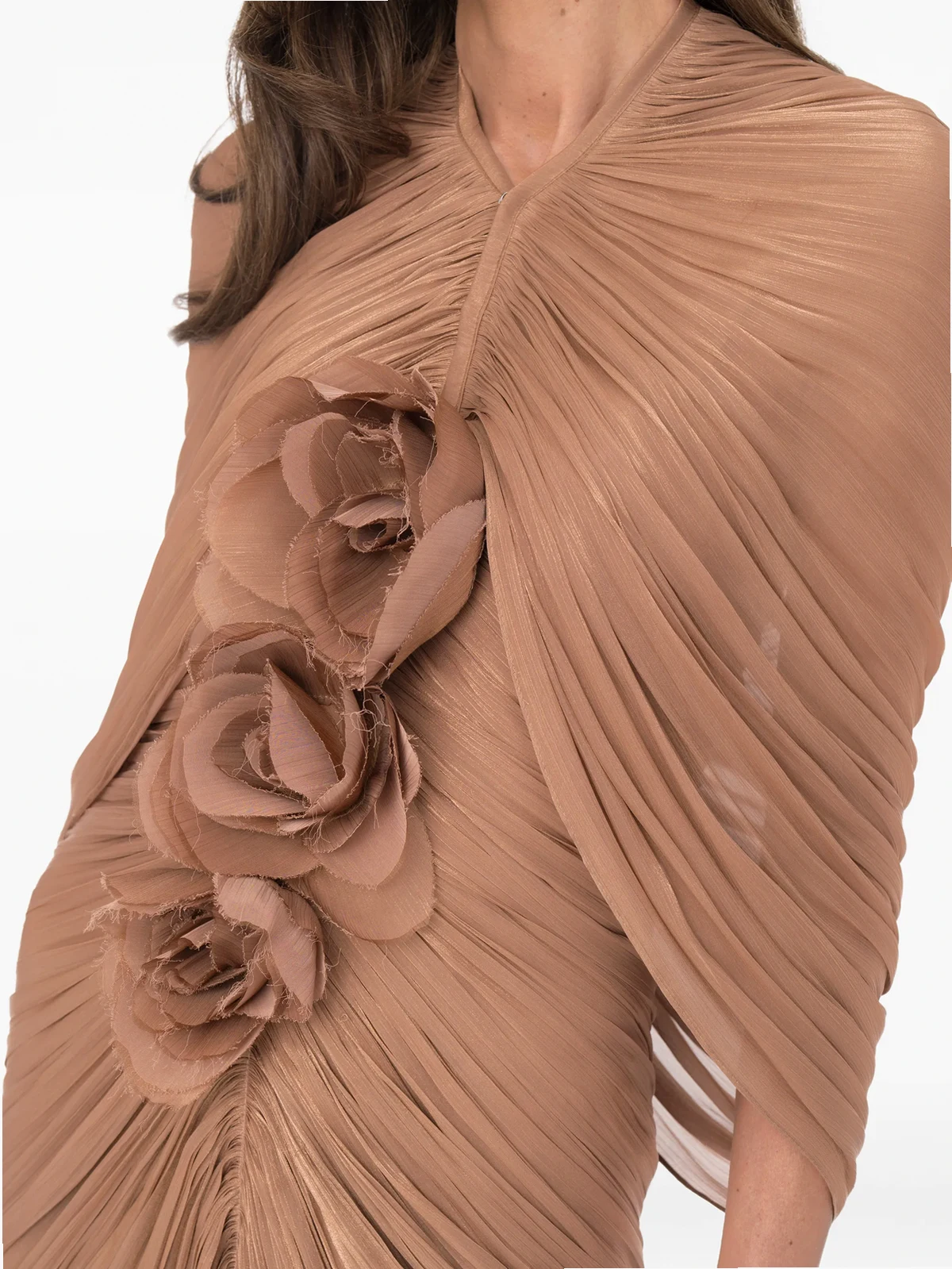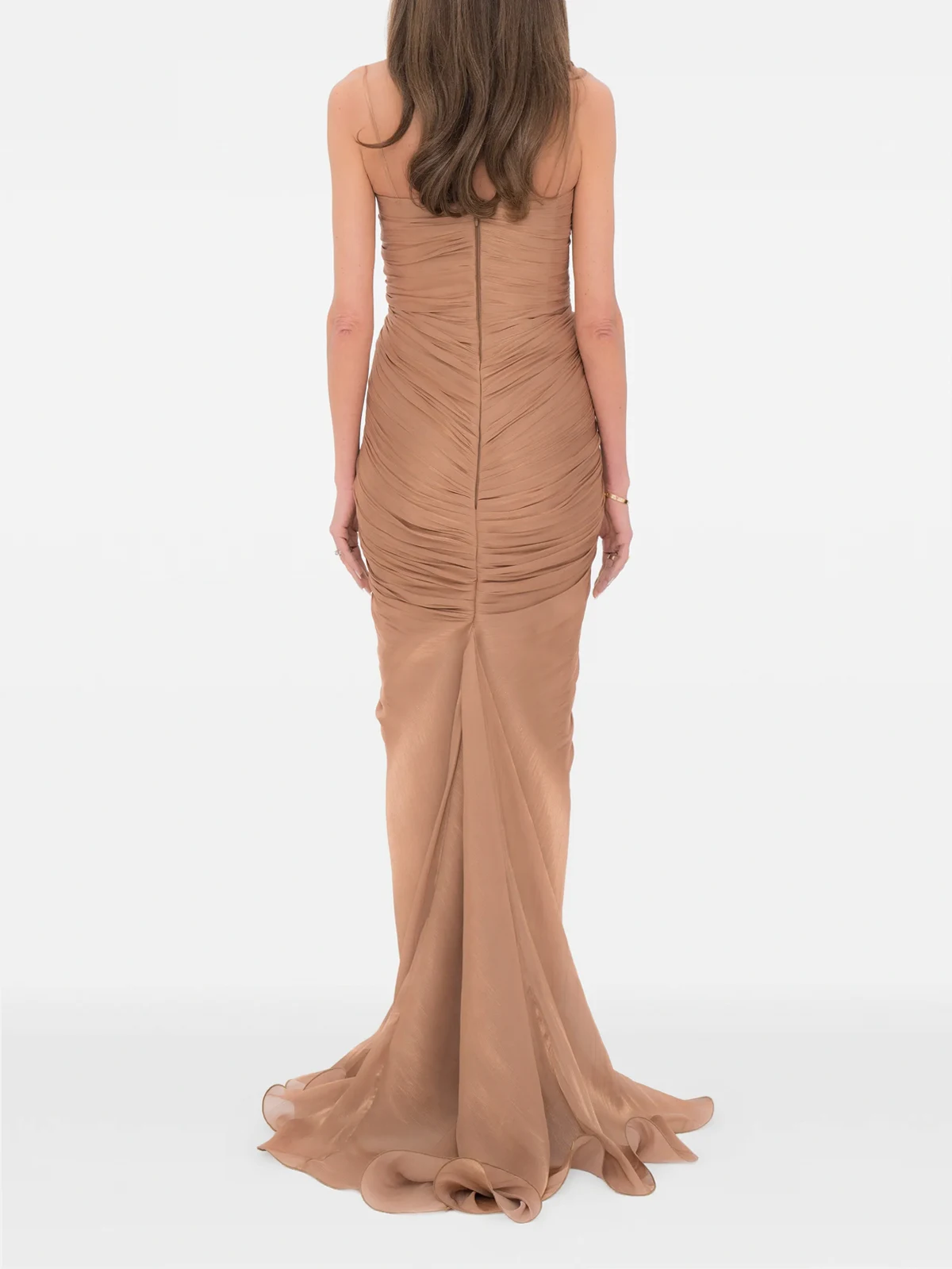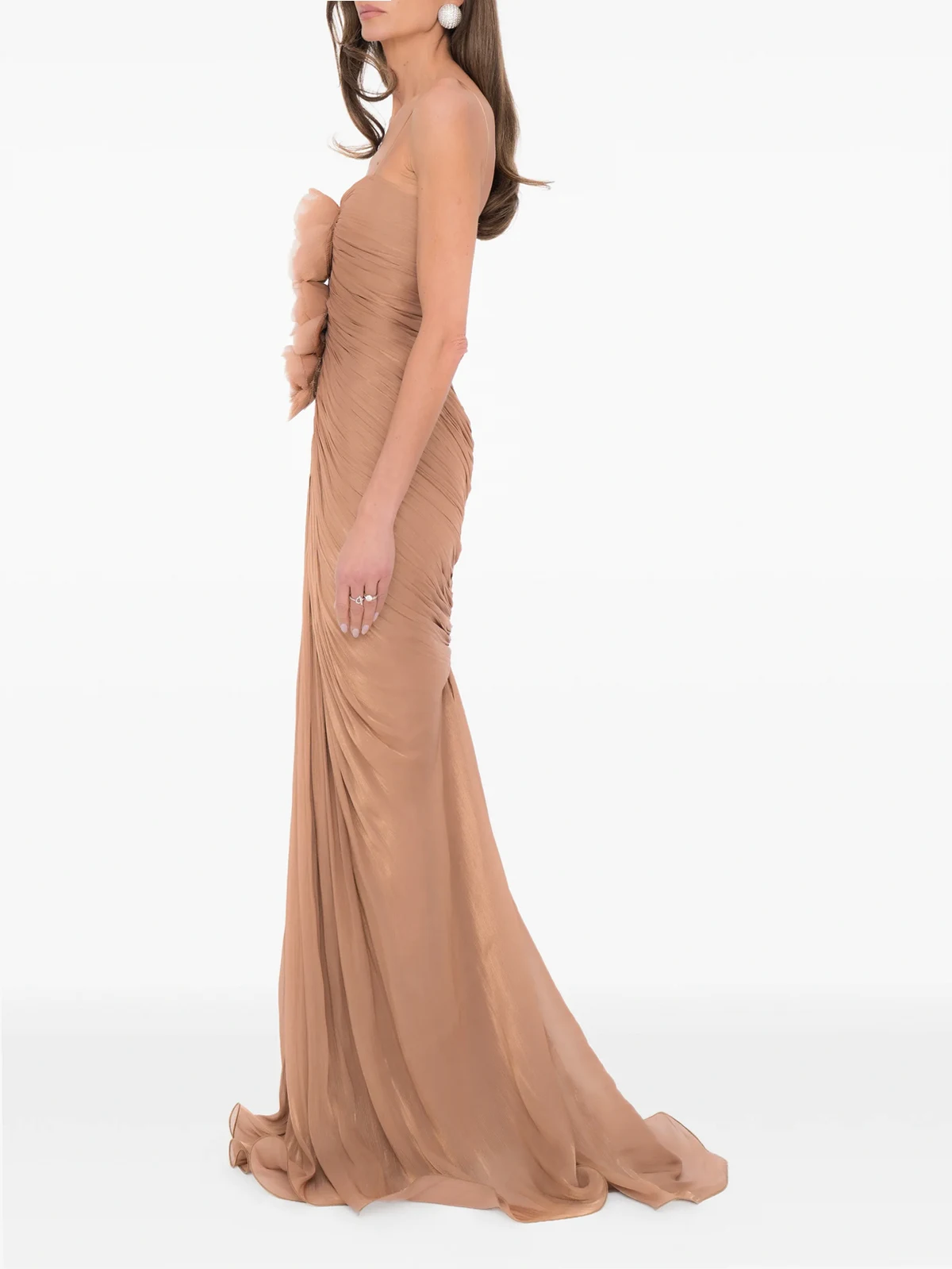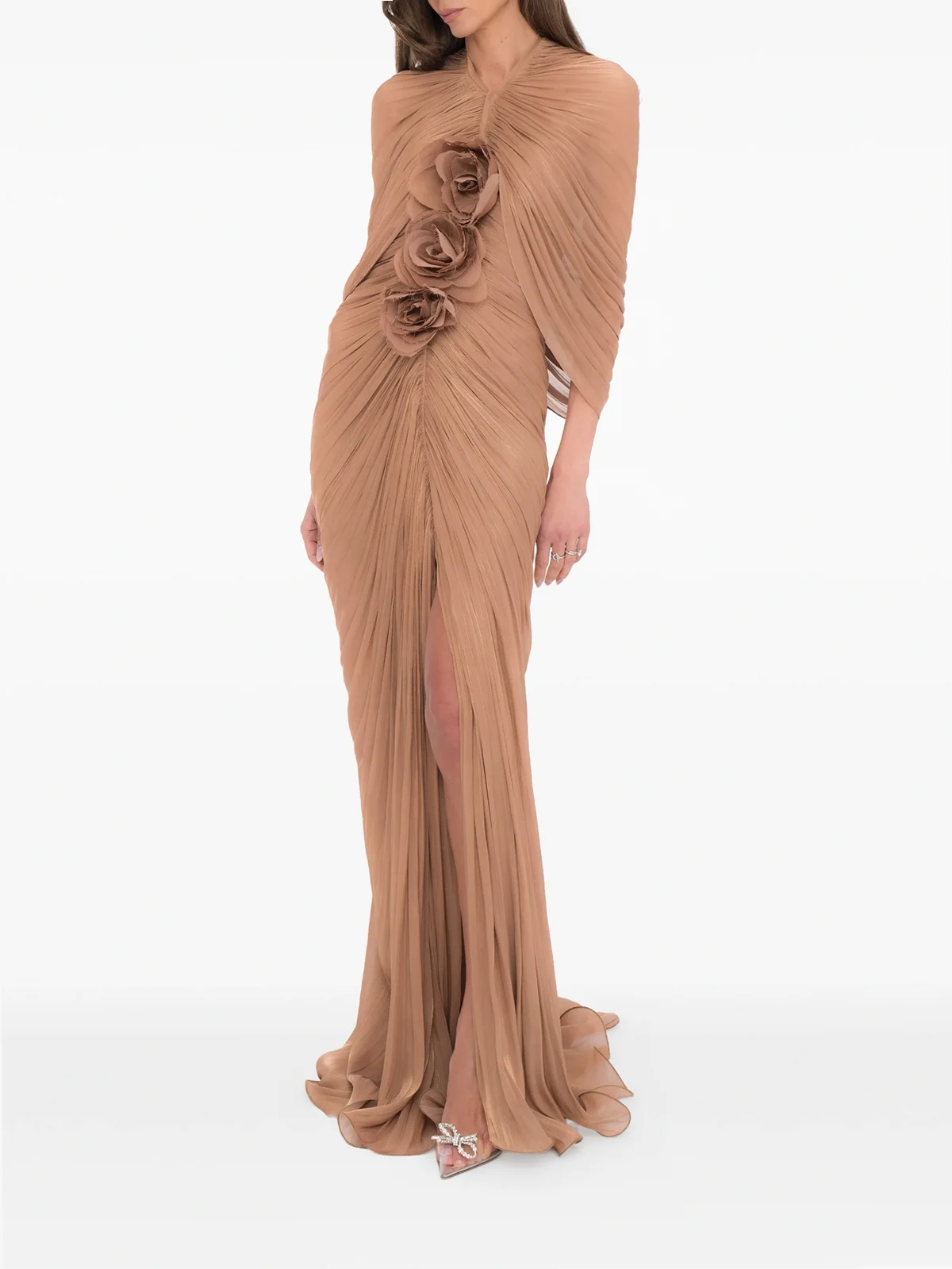 Women's Chiffon Ruched Illusion Raglan Sleeve Ruffled Gown