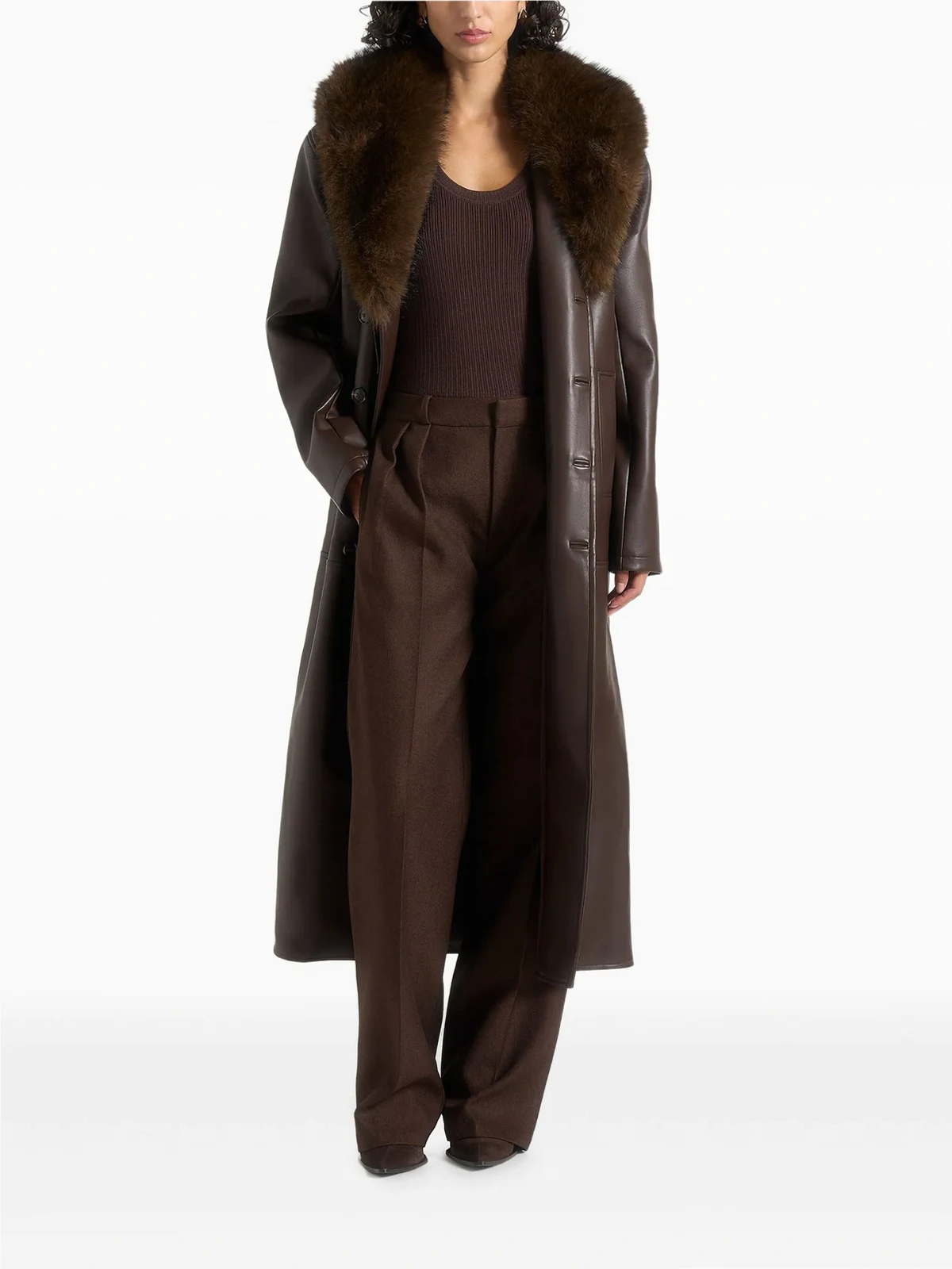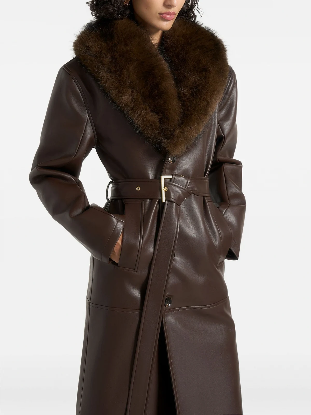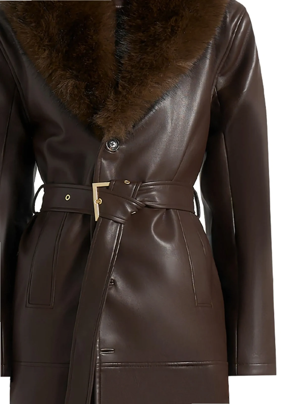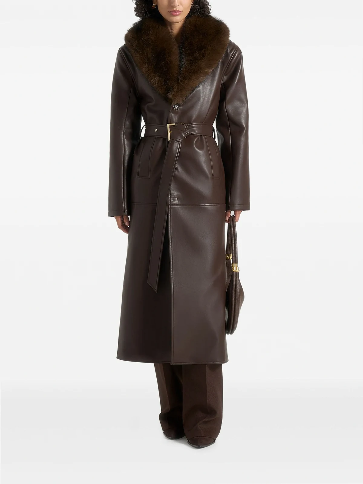 Cenya faux fur-collar faux-leather brown belted coat
