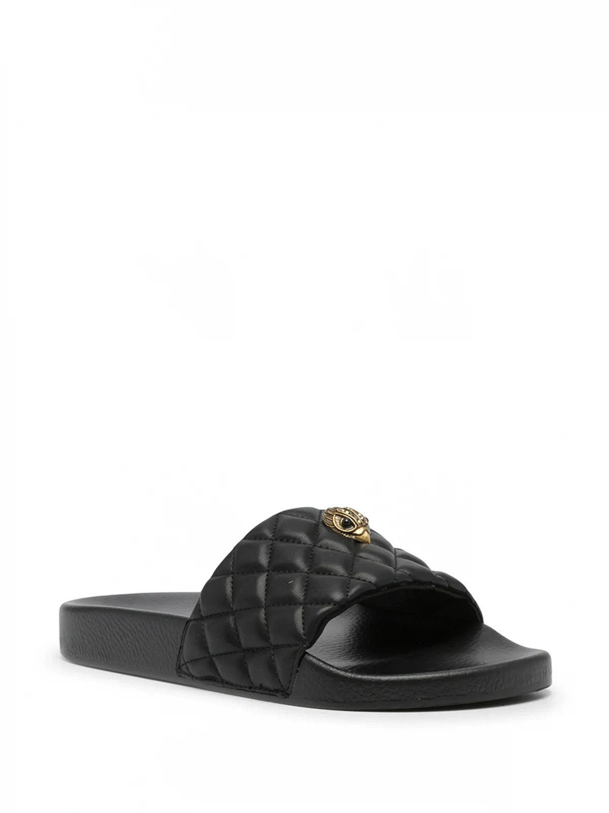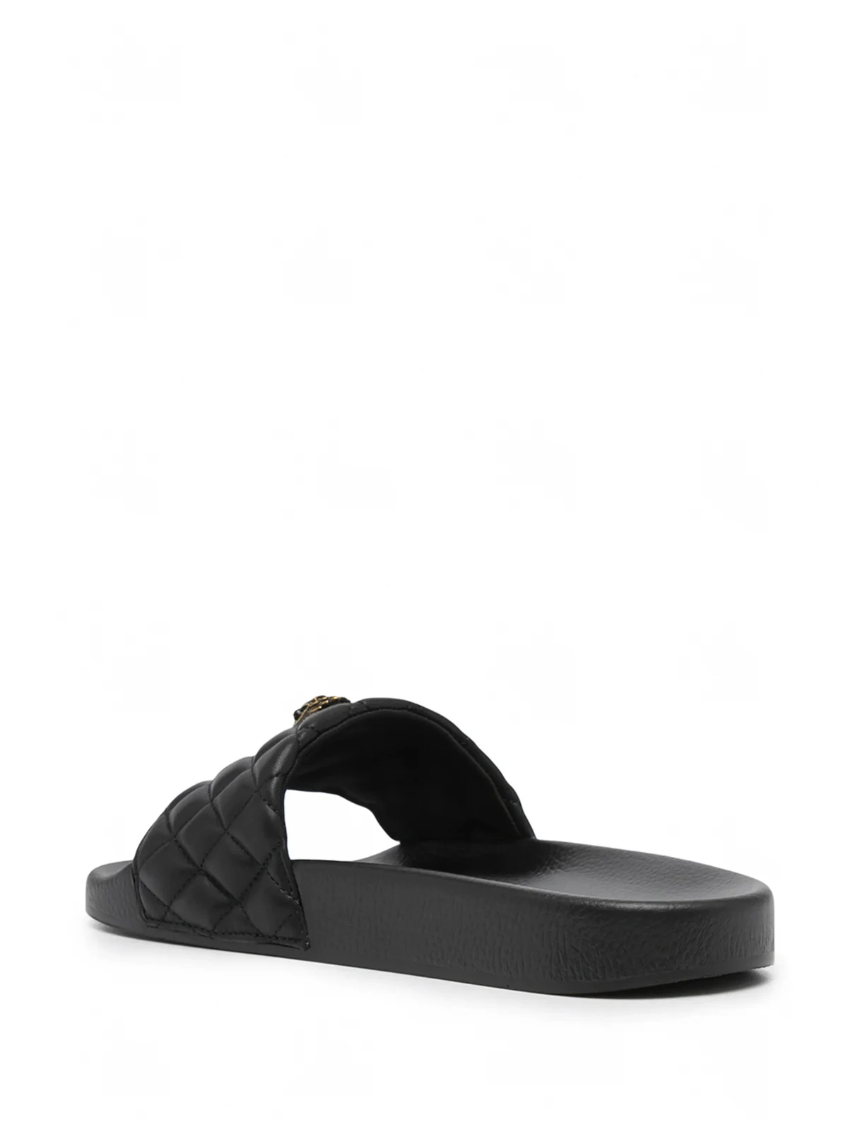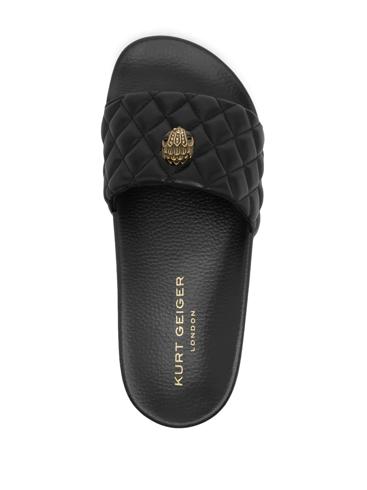 black quilted open toe gold-tone logo plaque flat rubber sole