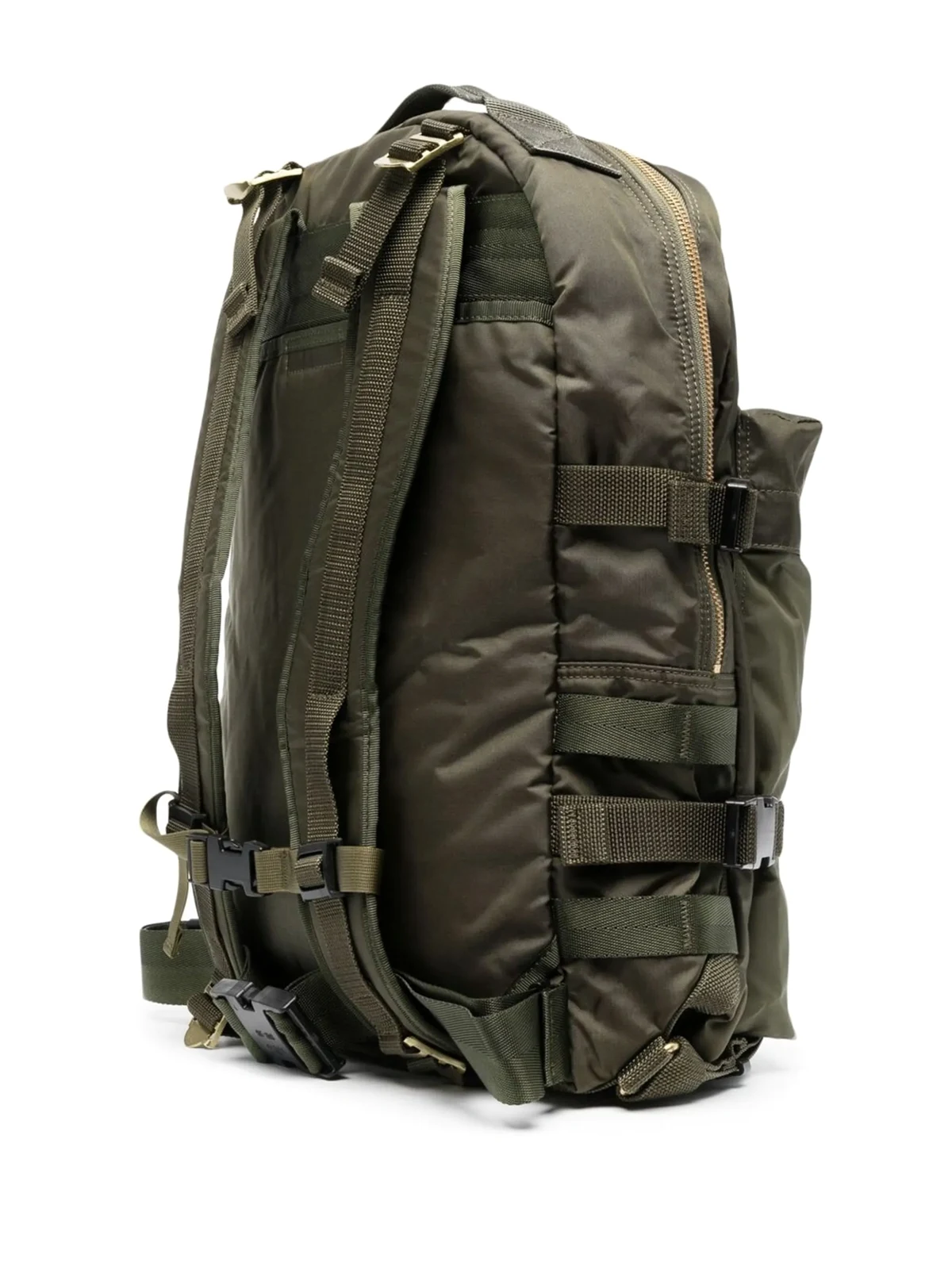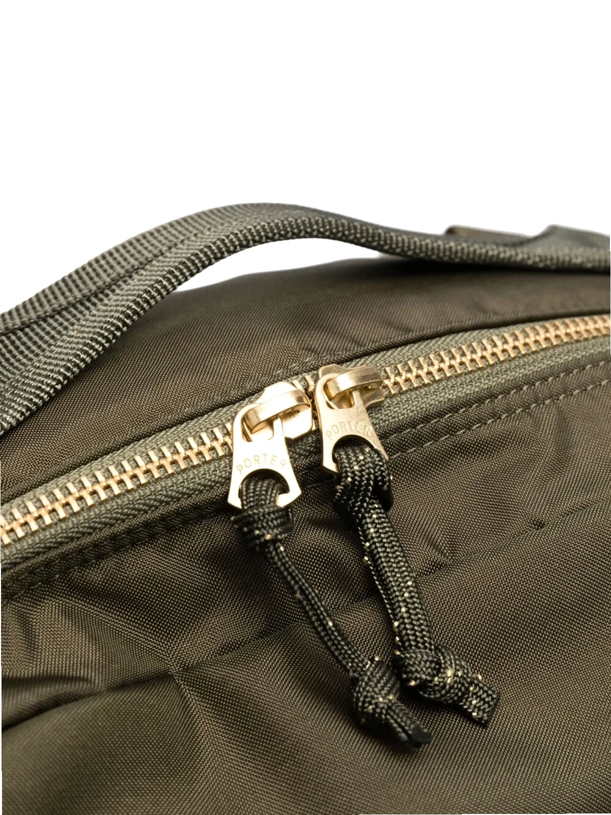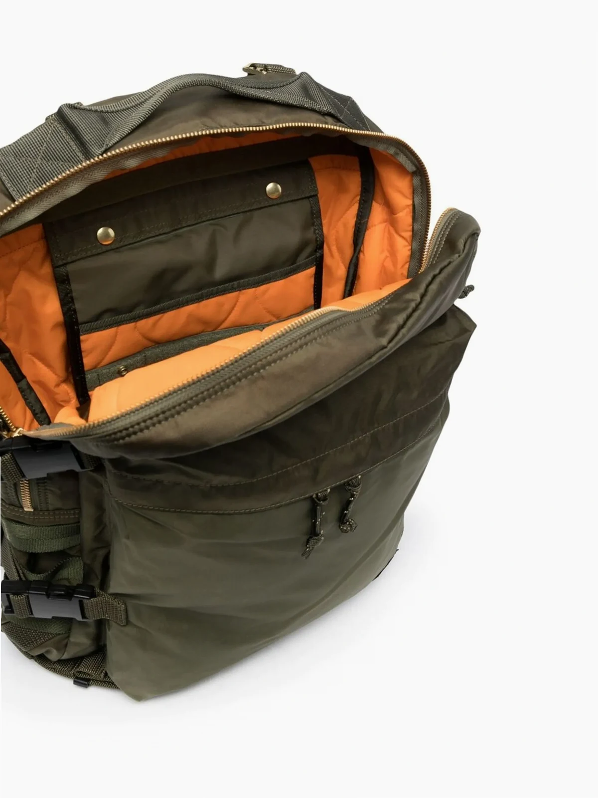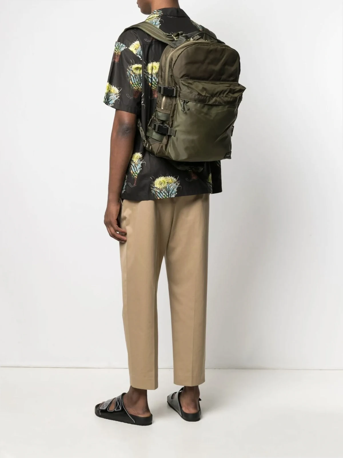 olive green fabric top zip fastening two adjustable shoulder straps single top handle main compartment multiple internal slip pockets front zip-fastening compartment