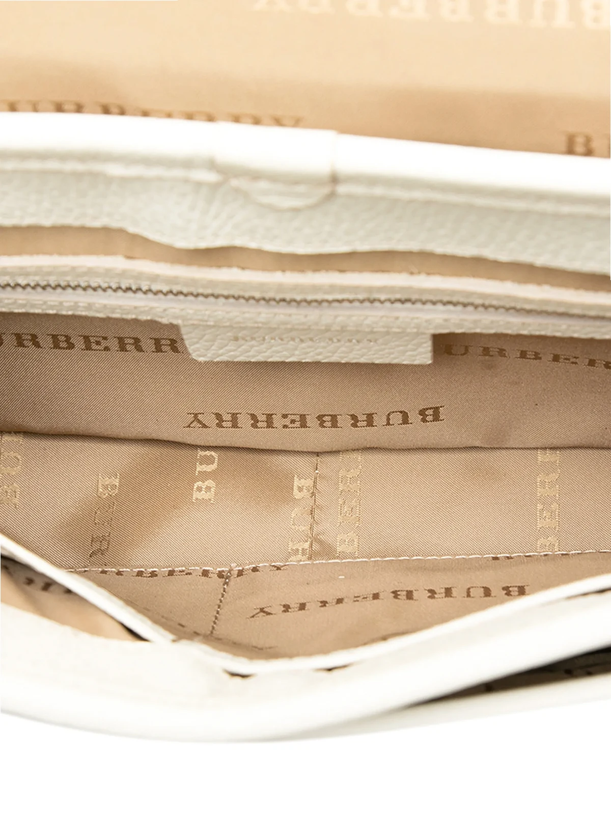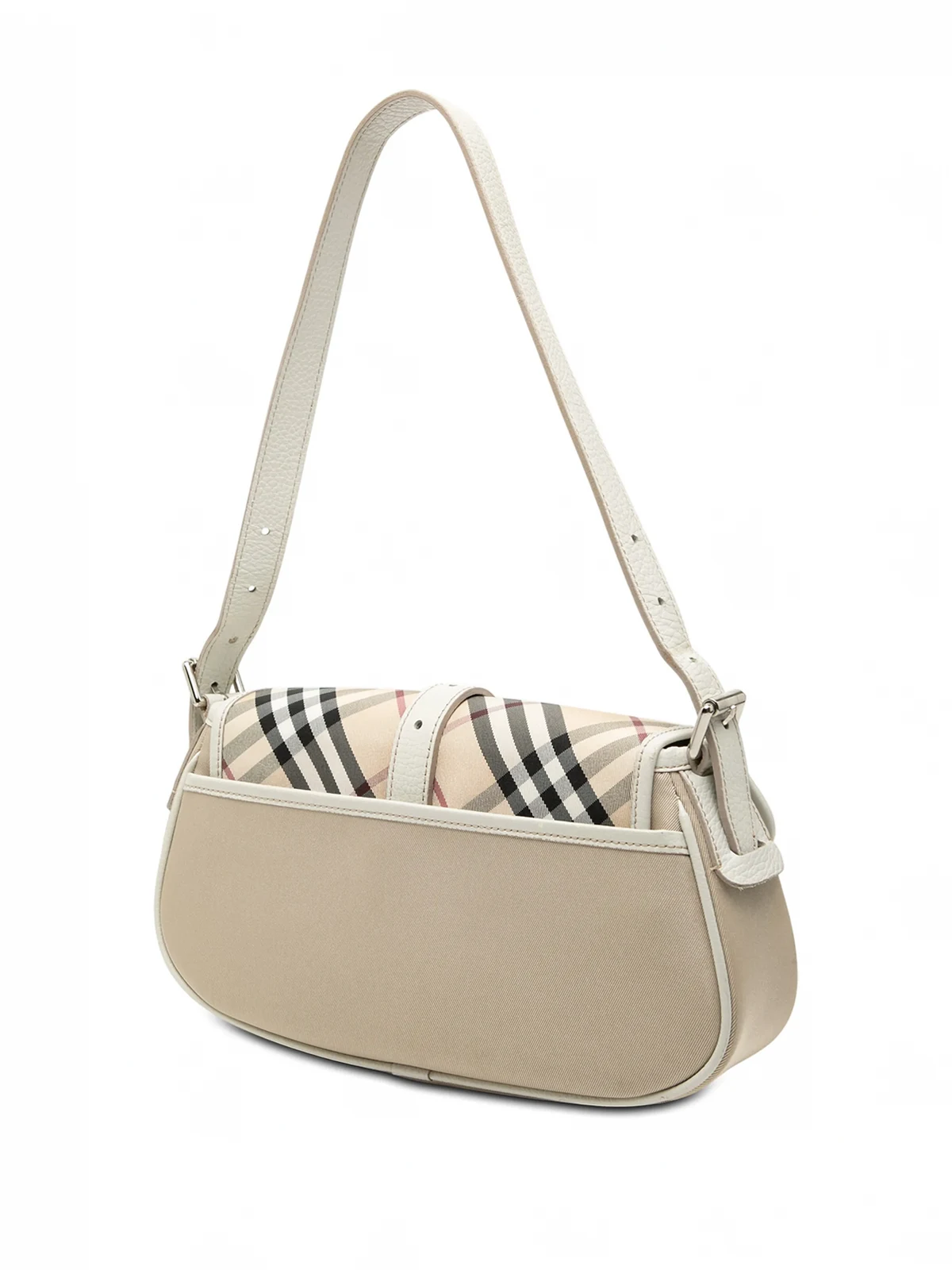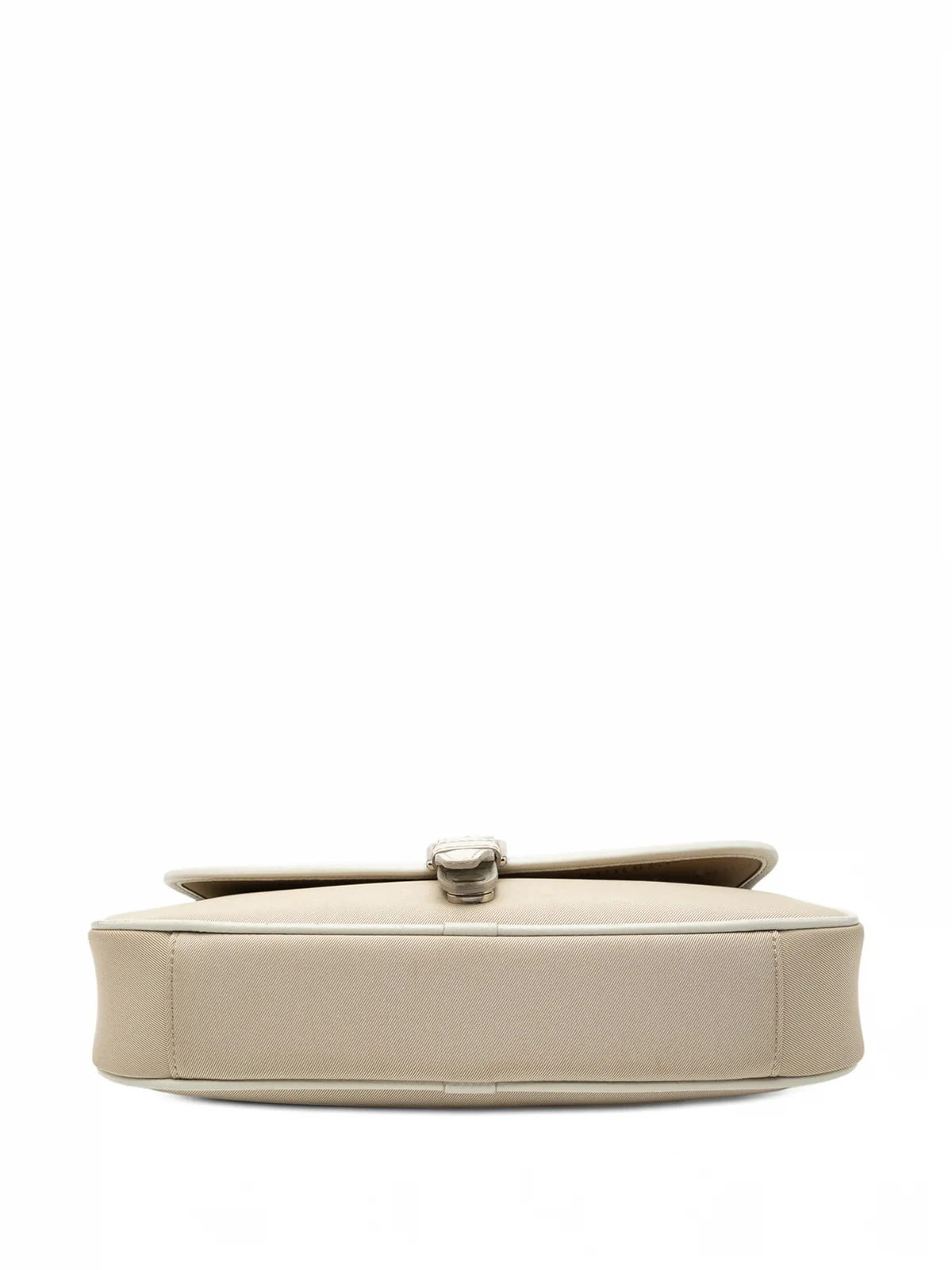 This shoulder bag features a canvas body with leather trim, a flat leather strap, a top flap with buckle closure, and interior zip and slip pockets. Brown. This item has no inclusions. Condition: GOOD. This previously owned and used item is in good condition with minimal signs of use. This may include fading of material or plating and scratches. Declared Damages: Closure Feature(s) Moderate Scratches. Please refer to the photos on this product page for a detailed view of the item, including any damages declared.