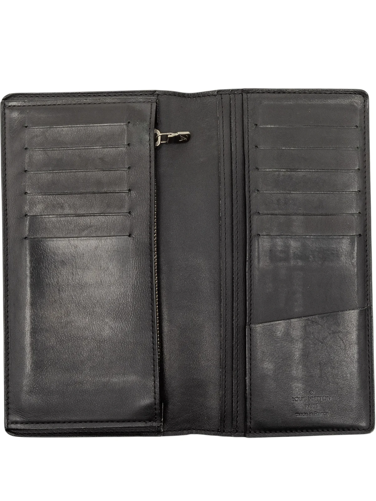 The Brazza wallet features a damier infini leather body and interior zip and slip compartments. Black. This item has no inclusions. Condition: GOOD. This previously owned and used item is in good condition with minimal signs of use. This may include fading of material or plating and scratches. Due to the exclusivity of this item and its limited availability, processing and delivery might take longer than usual. Declared Damages: Exterior Side Feature(s) Minor Splitting. Please refer to the photos on this product page for a detailed view of the item, including any damages declared.