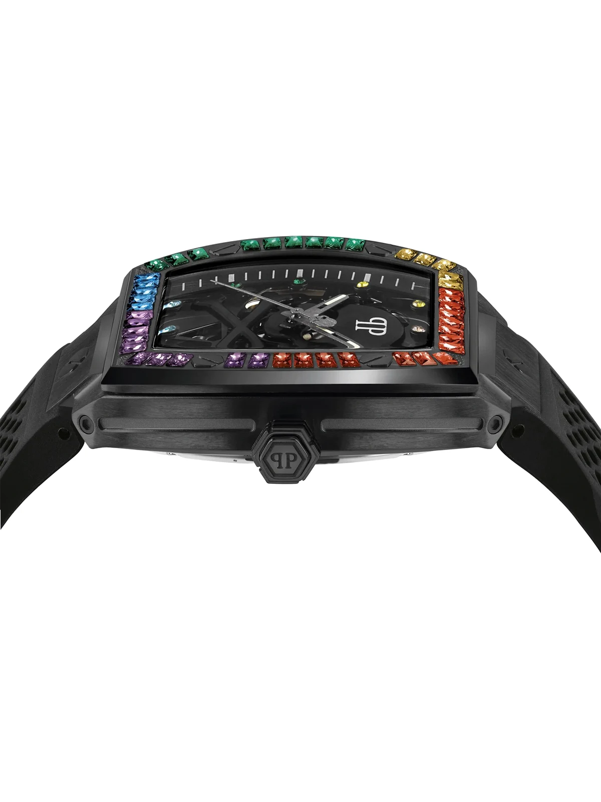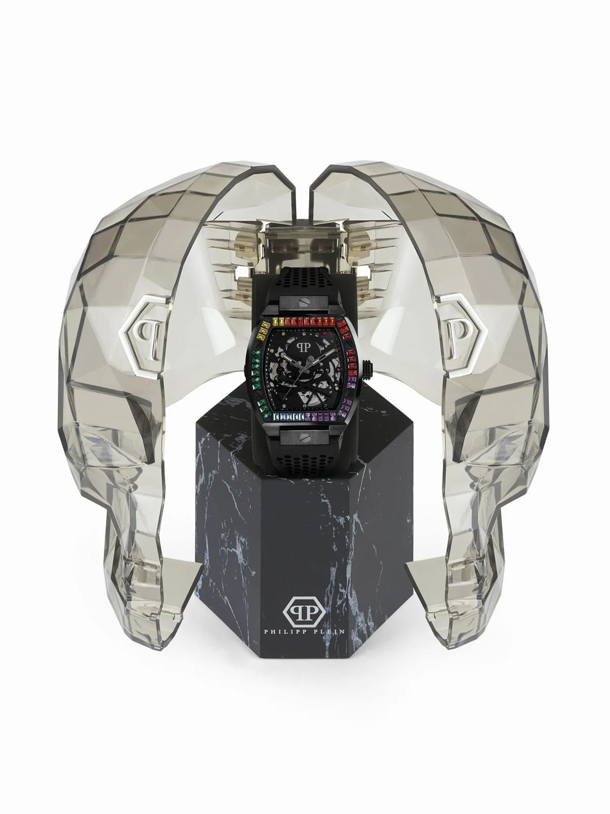 44mm stainless steel case automatic movement square face rhinestone dial skull appliqué rhinestone-encrusted bezel silicone bracelet pin-buckle fastening This item comes with a standard two-year warranty from the brand.