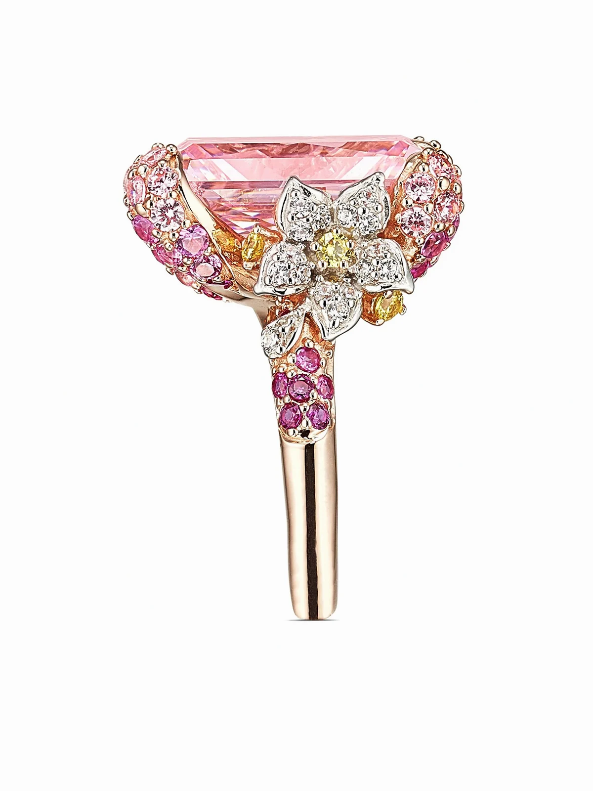 Lab-Grown Simulated Blush Rose Sapphire 100%, Lab-Grown Synthetic Fuchsia Pink Sapphire 100%, Lab-Grown Simulated Canary Diamond 100%, Lab-Grown Synthetic Pink Sapphire 100%, 18K Rose & White Gold & Rhodium Vermeil 100%, Lab-Grown Simulated White Diamond 100%