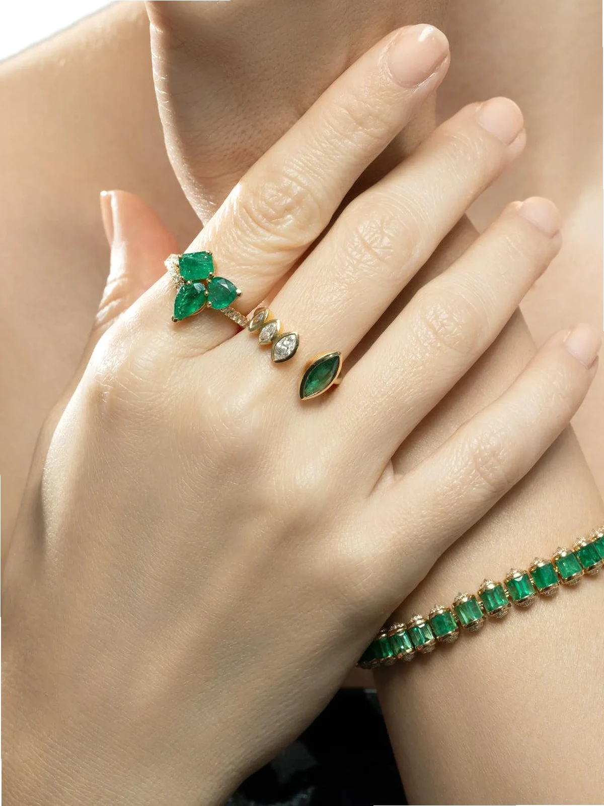 embellished emerald and diamond marquise open ring