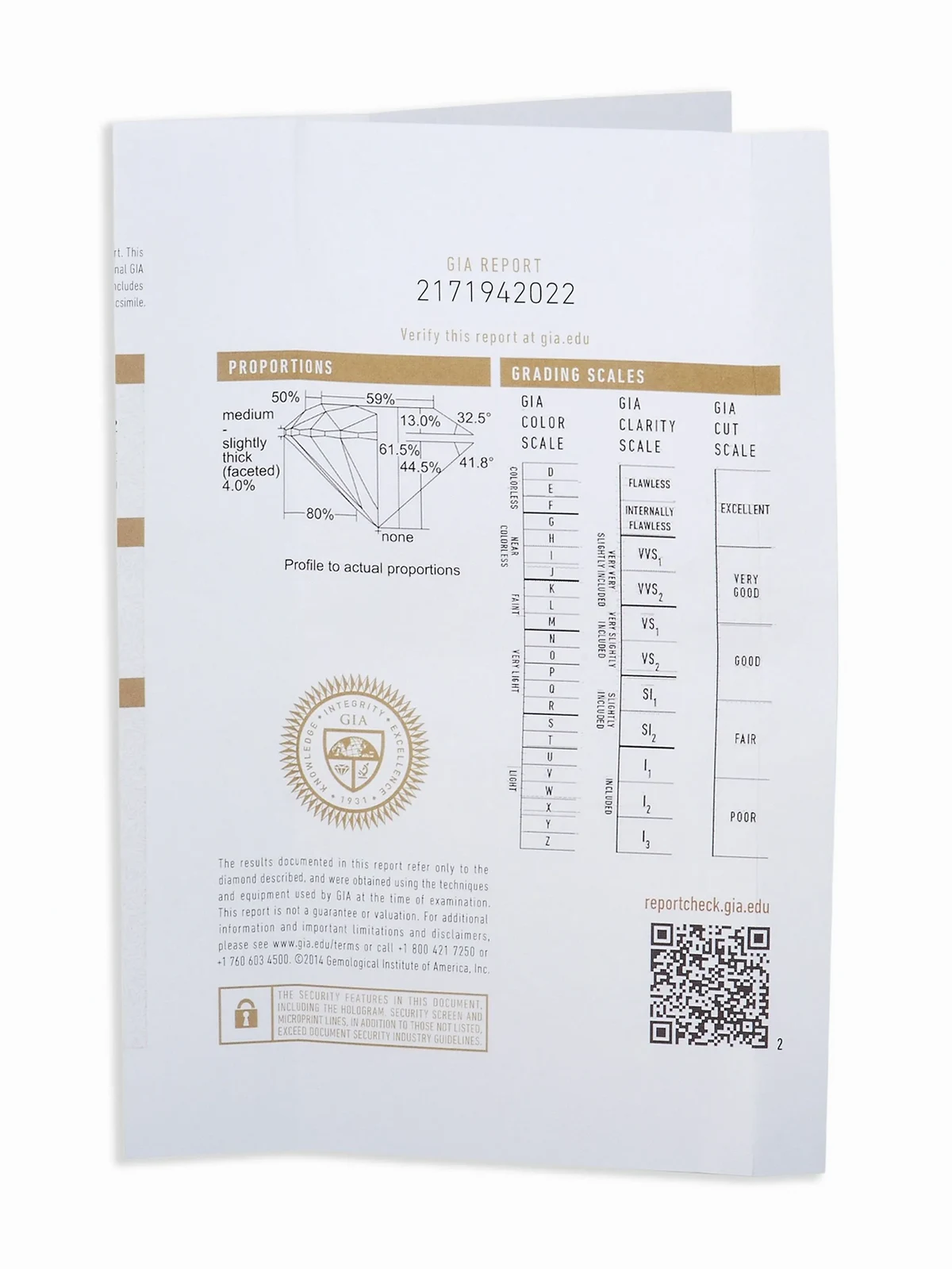 Includes a GIA report. This certification from the Gemological Institute of America assesses diamonds' authenticity as well as cut, colour, clarity and carat weight.