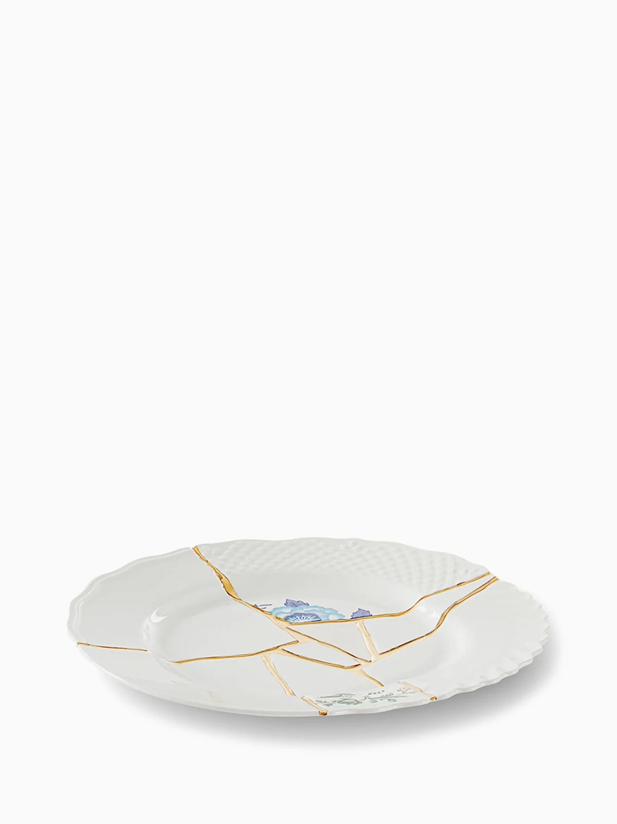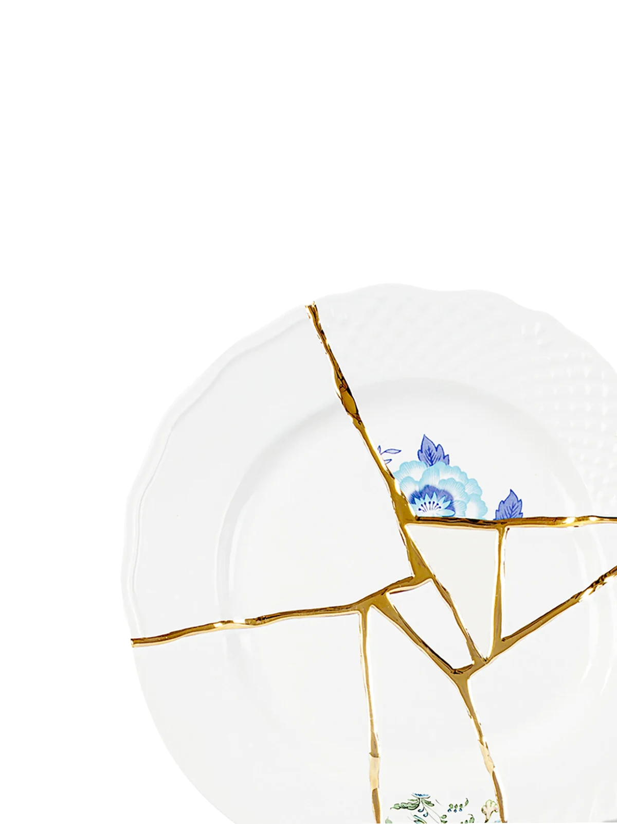 White/gold porcelain/gold Kintsugi No. 3 dinner plate (28cm) from SELETTI featuring cracked effect, floral print, asymmetric design, round frame, 24 carat gold, Height: 3cm, Width: 28cm and Length: 27.5cm.