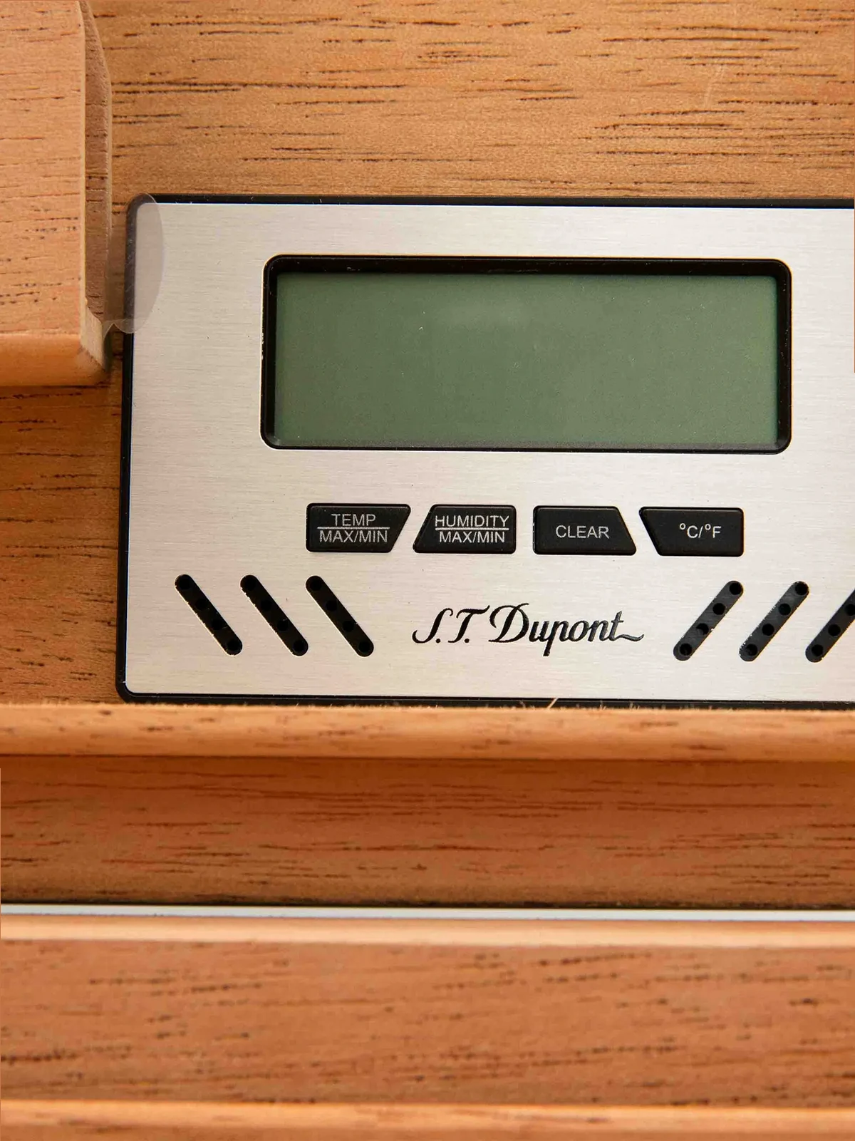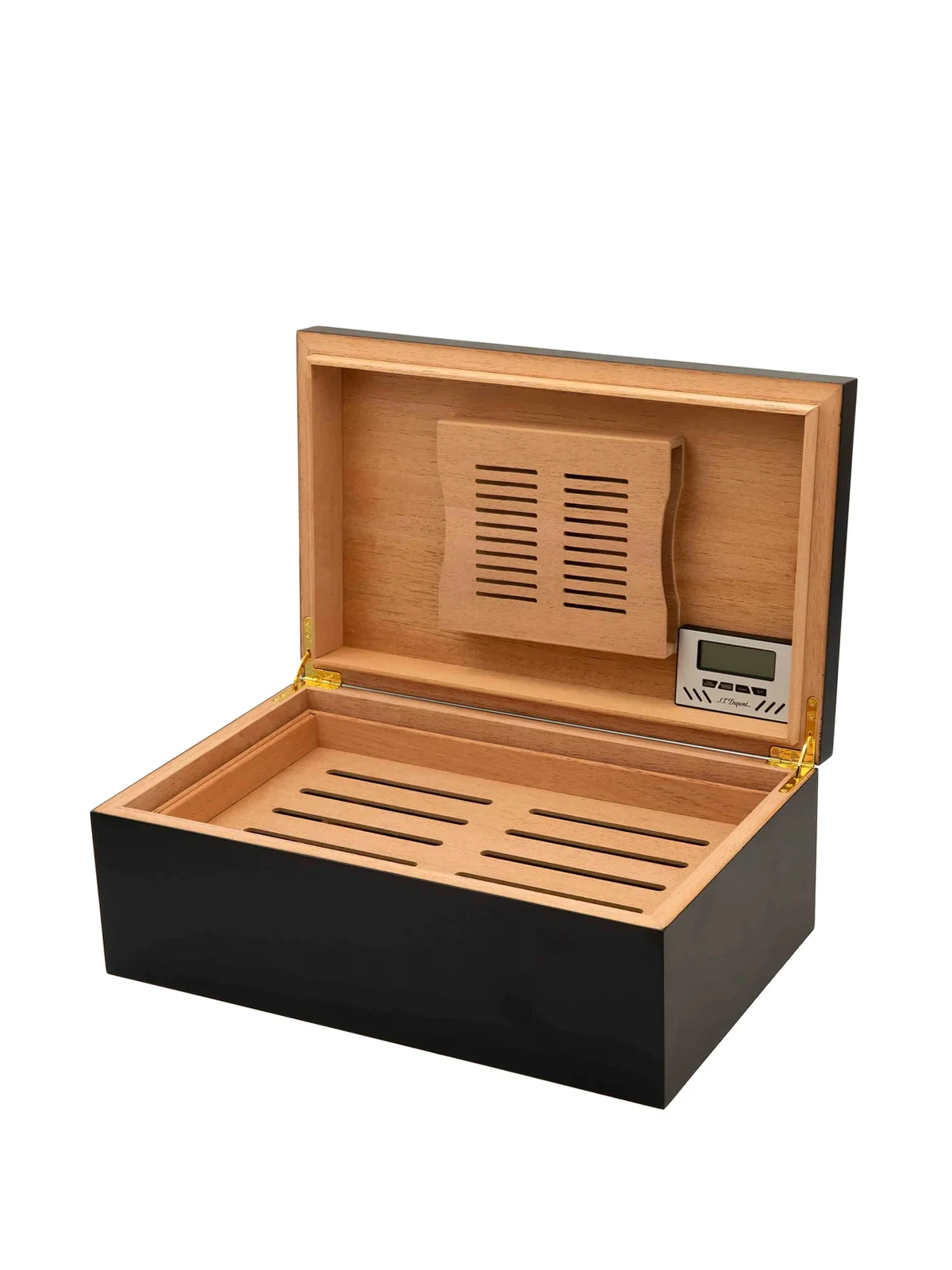 black wood lacquered finish logo stamp to the front digital hygrometer humidification system