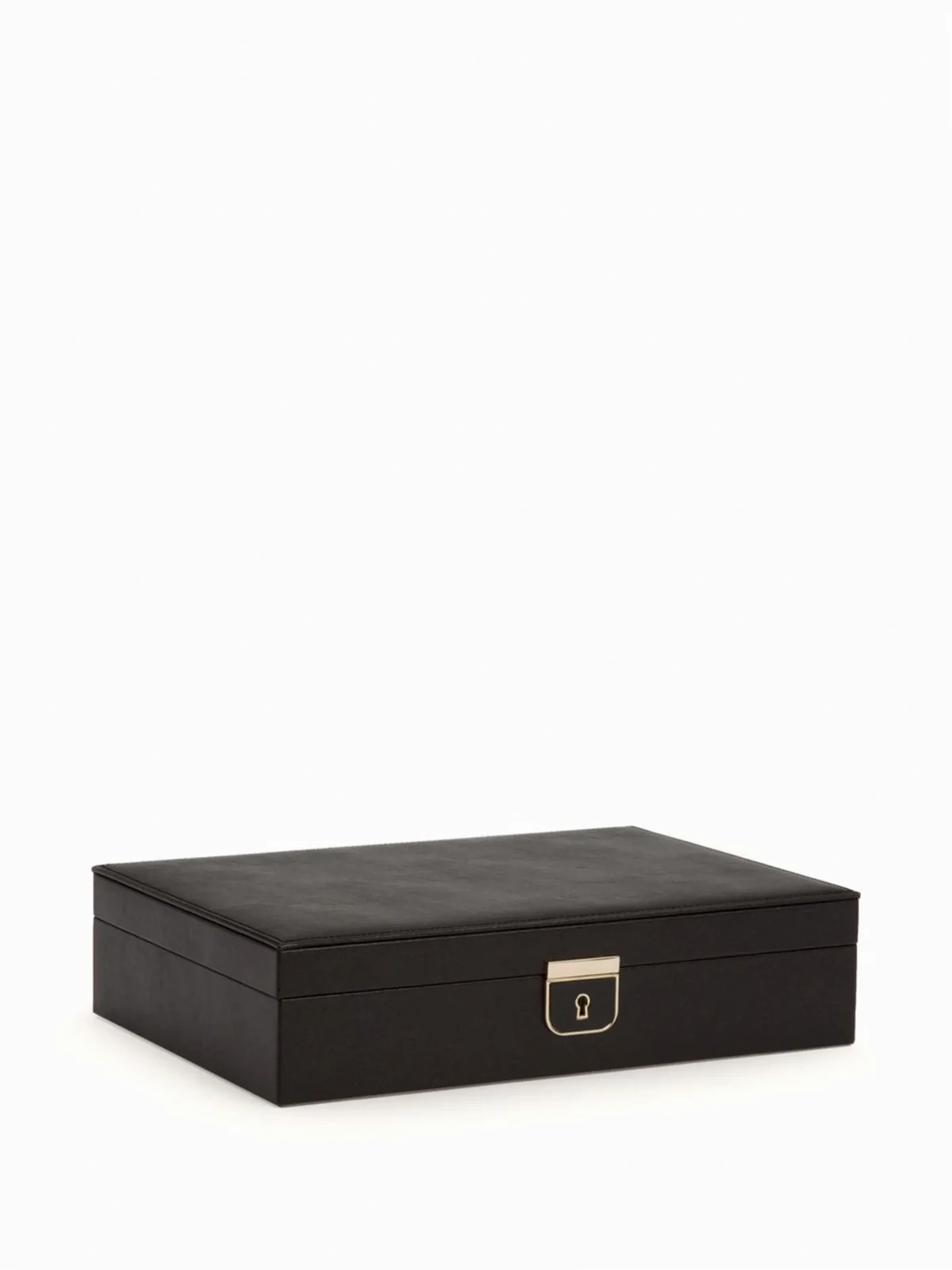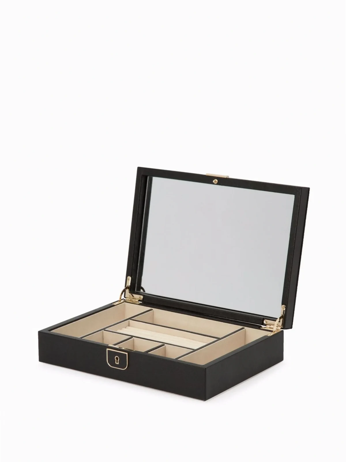 black leather 4 ring rolls 6 storage compartments full mirror LusterLoc™: Allows the fabric lining the inside of your jewelry cases to absorb the hostile gases known to cause tarnishing. Under typical storage conditions, it can prevent tarnishing for up to 35 years