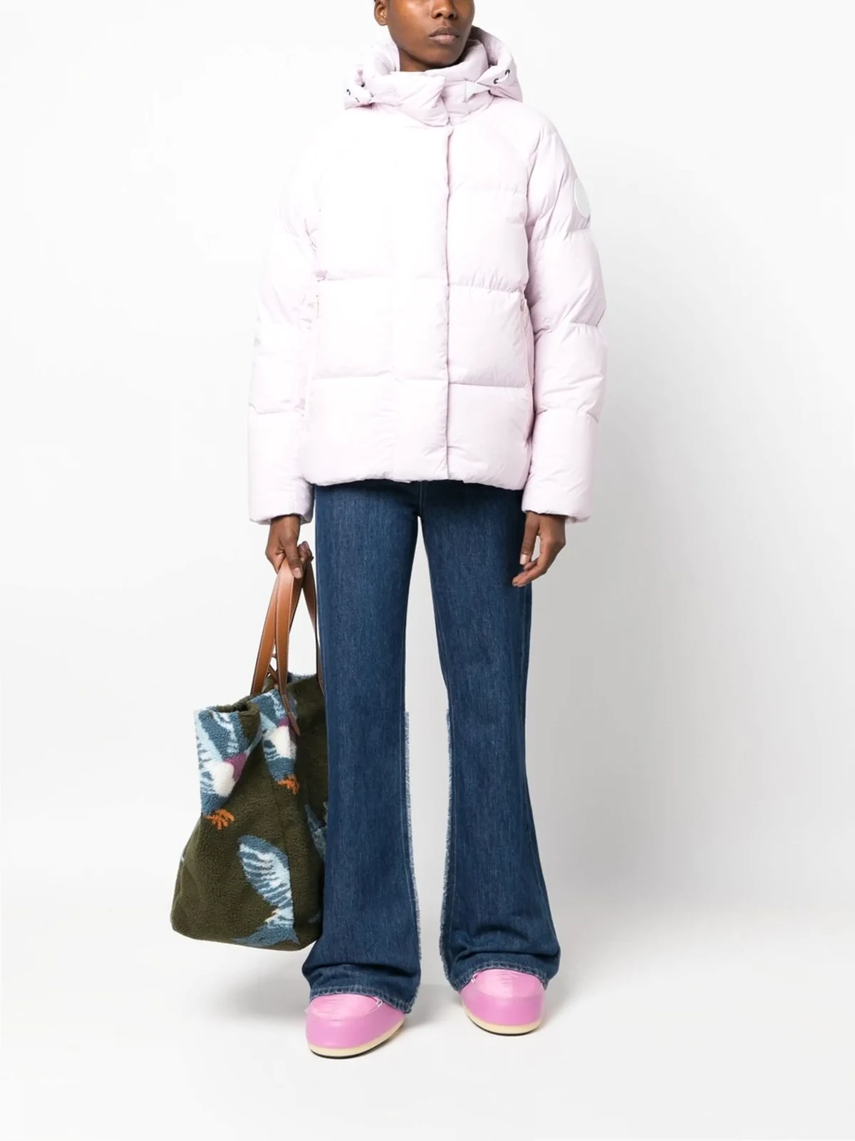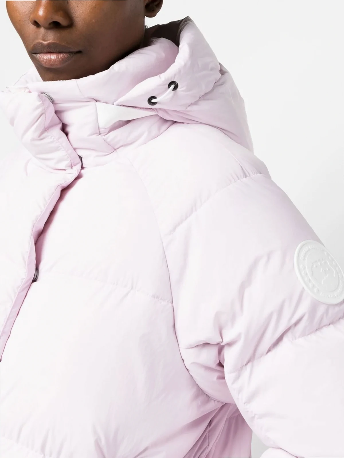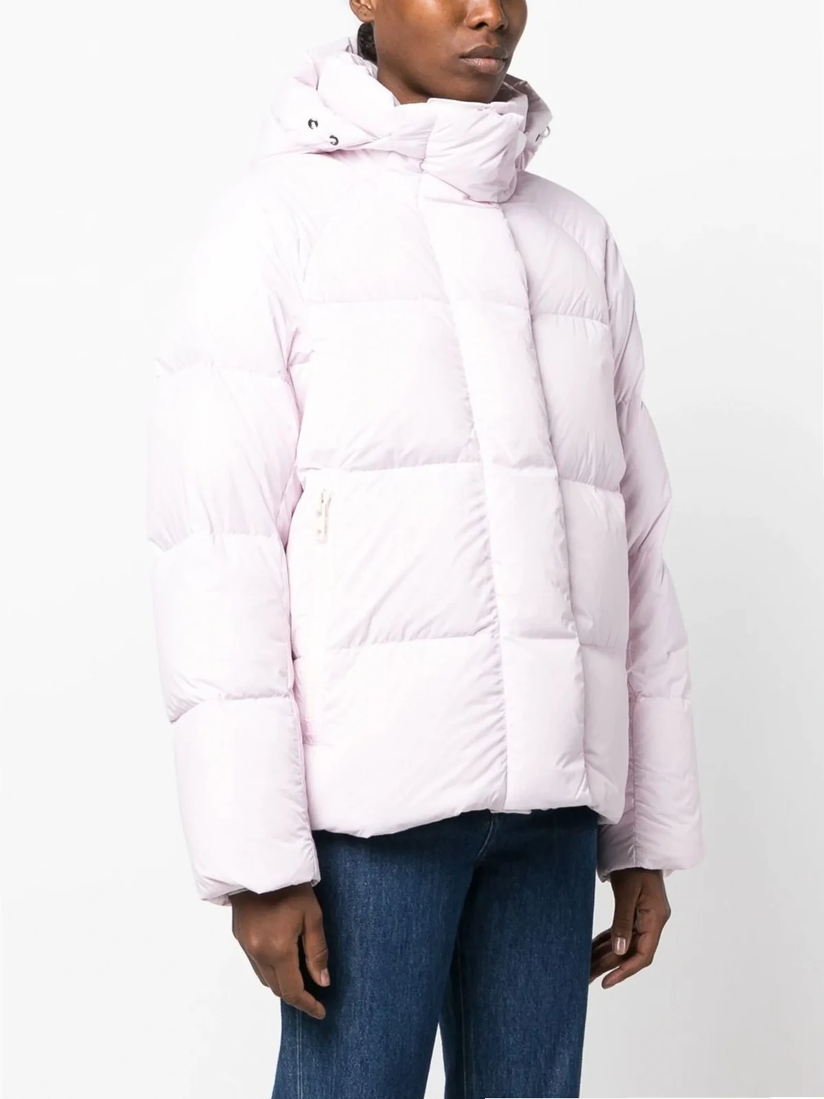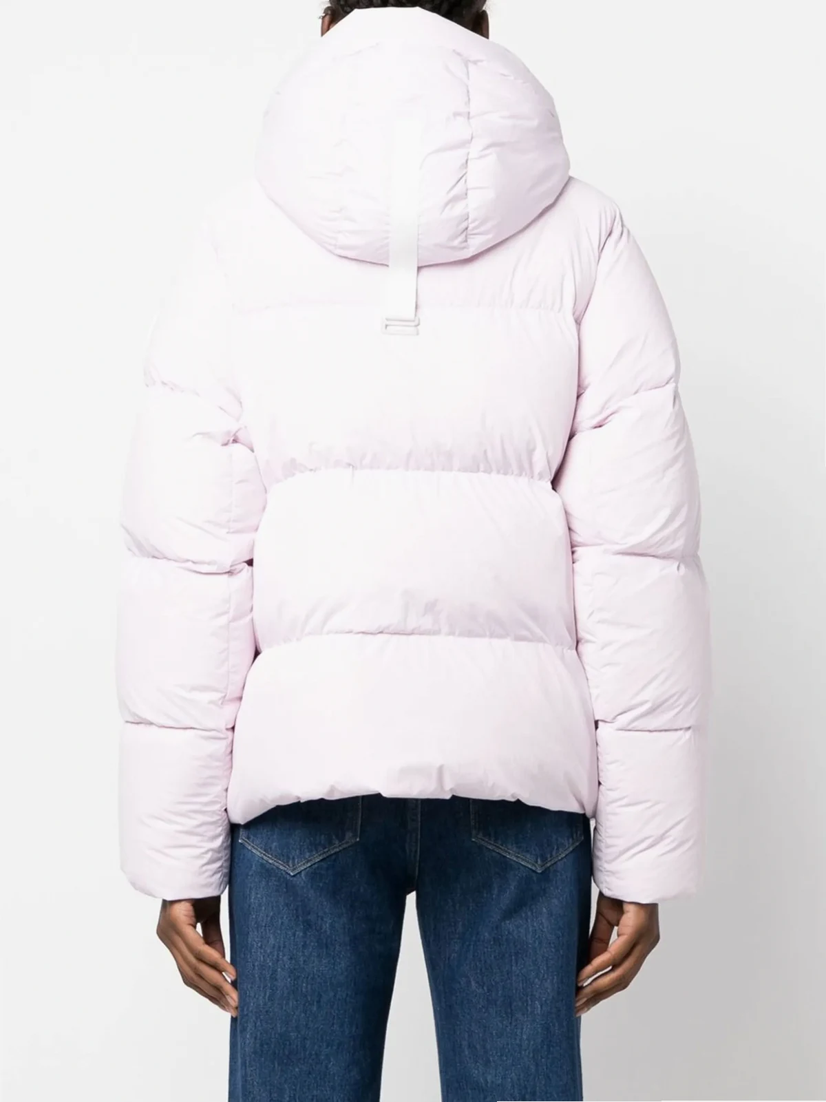 rose pink padded design logo patch at the sleeve funnel neck concealed front zip fastening long sleeves