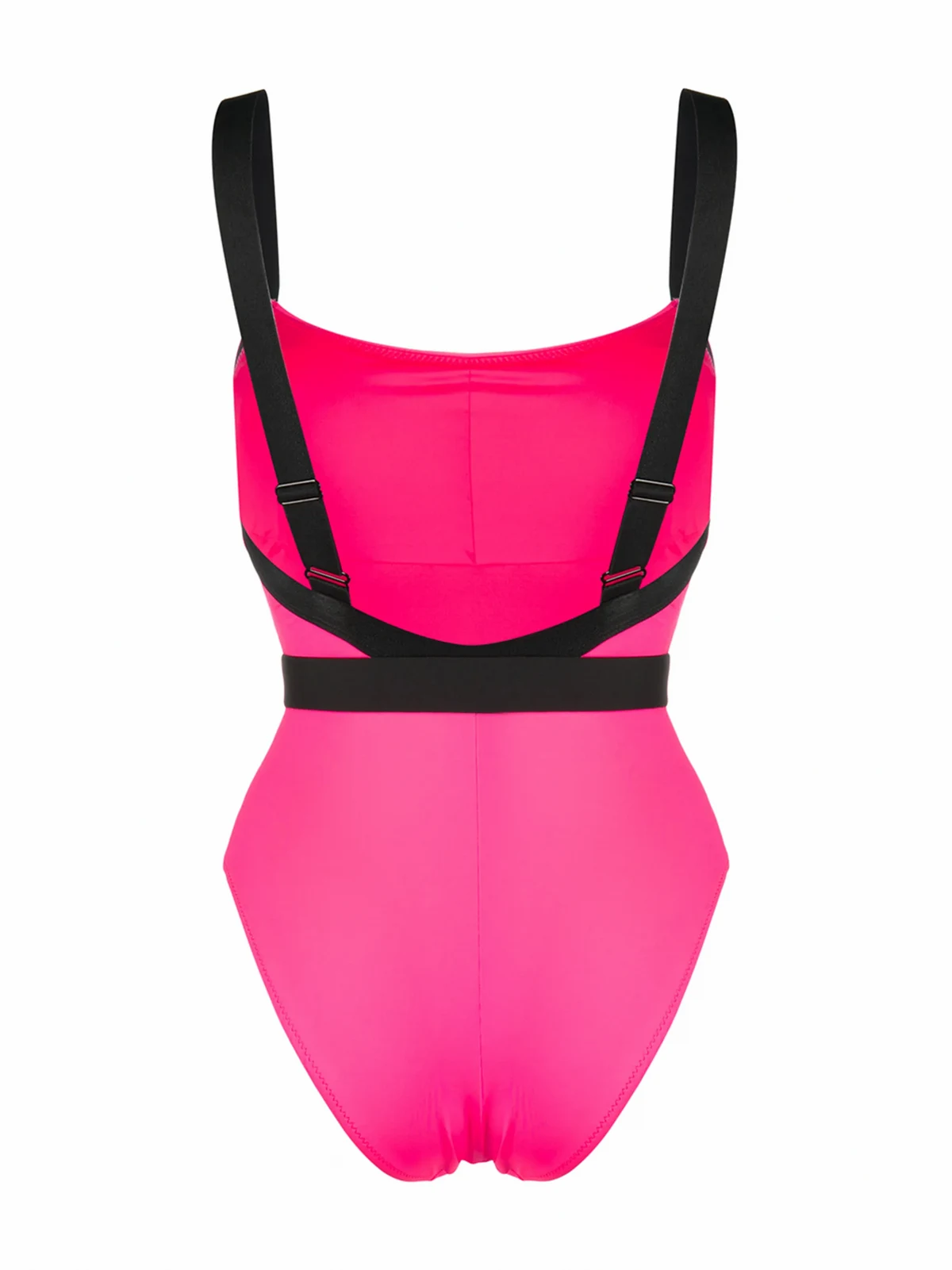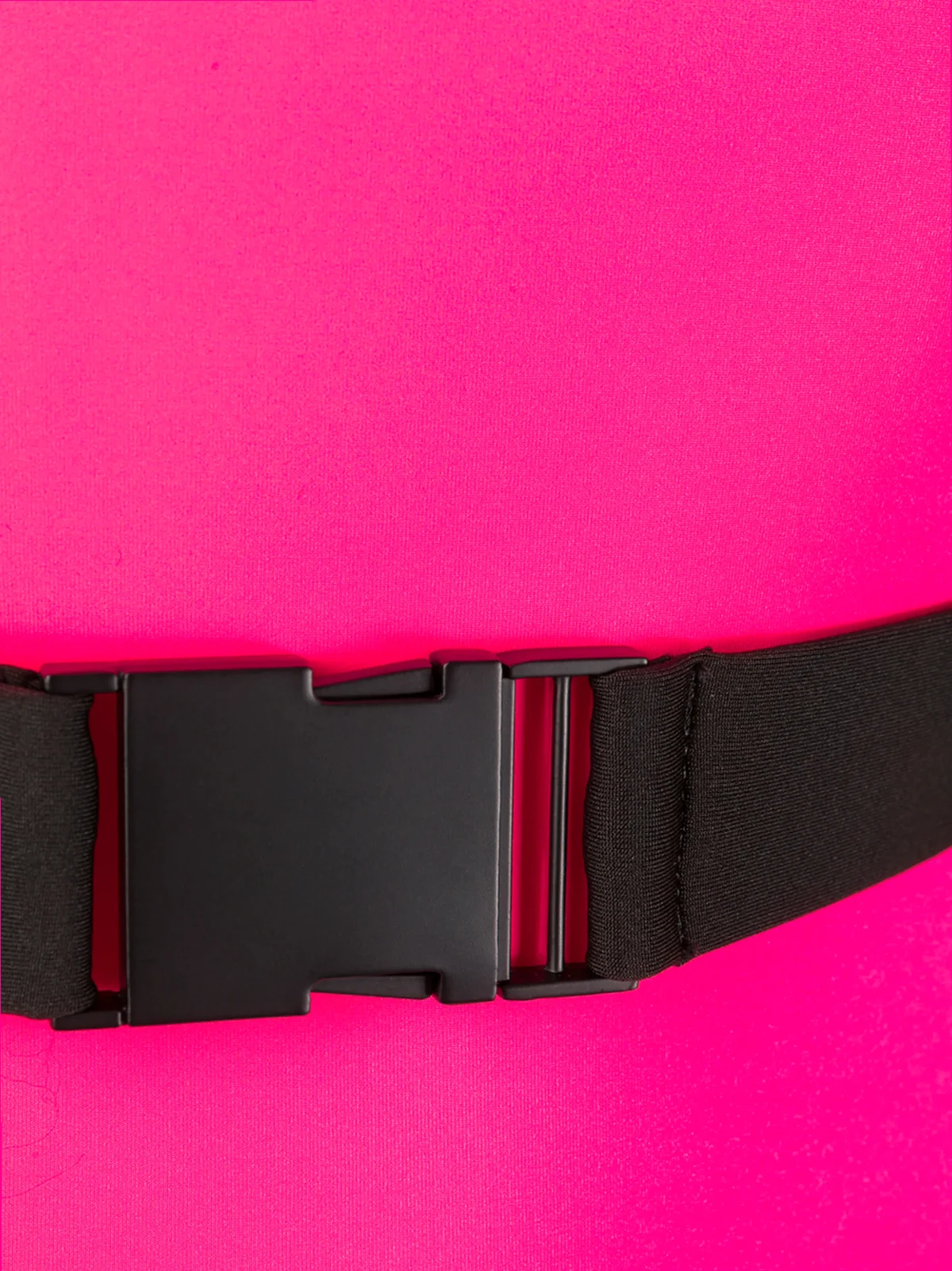 neon pink/black scoop neck contrasting panel detail two adjustable shoulder straps front buckle fastening scoop back high cut full lining Be mindful to try on swimwear over your own garments
