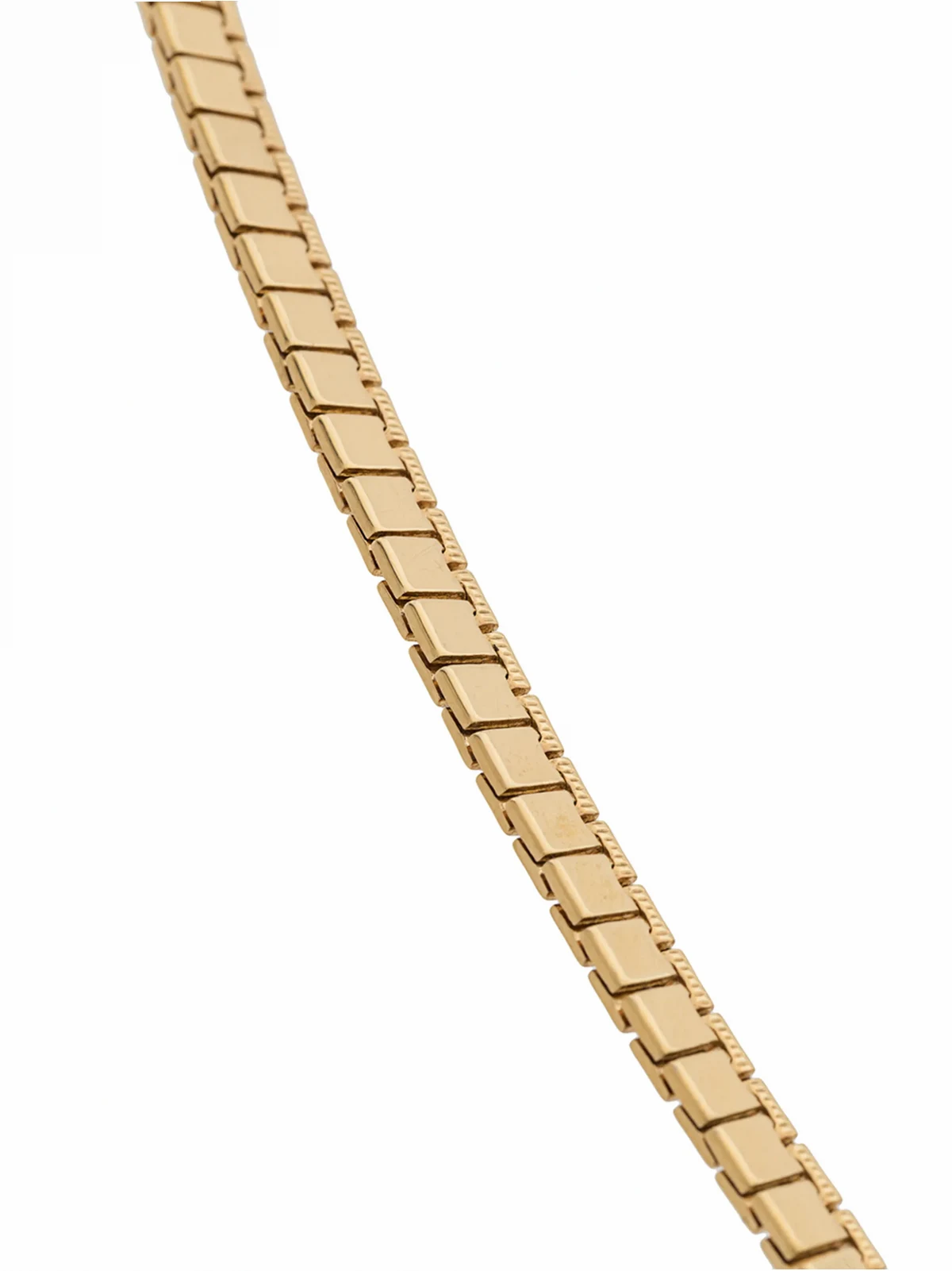 Gold plated metal '1970s square link necklace from Monet Pre-Owned featuring a fold-over clasp. Please be mindful that this piece has led a previous life, and may tell its story through minor imperfection. Purchasing this item continues its narrative, so you can be confident that you’re making a POSITIVELY CONSCIOUS choice for the planet.