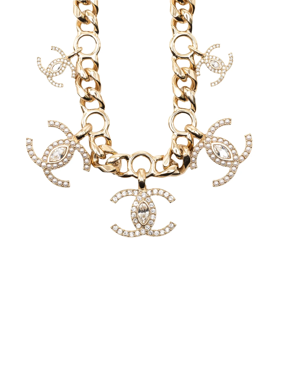- gold-tone pendant with faux pearls and rhinestone details