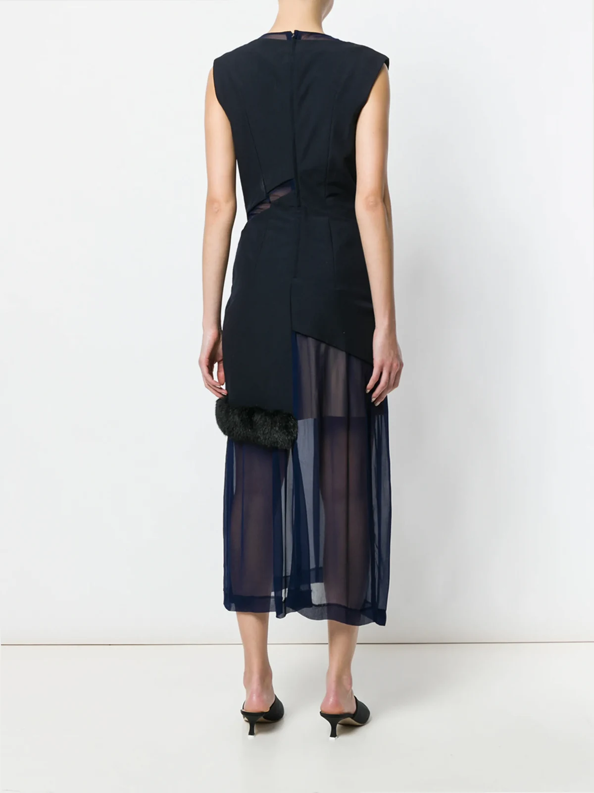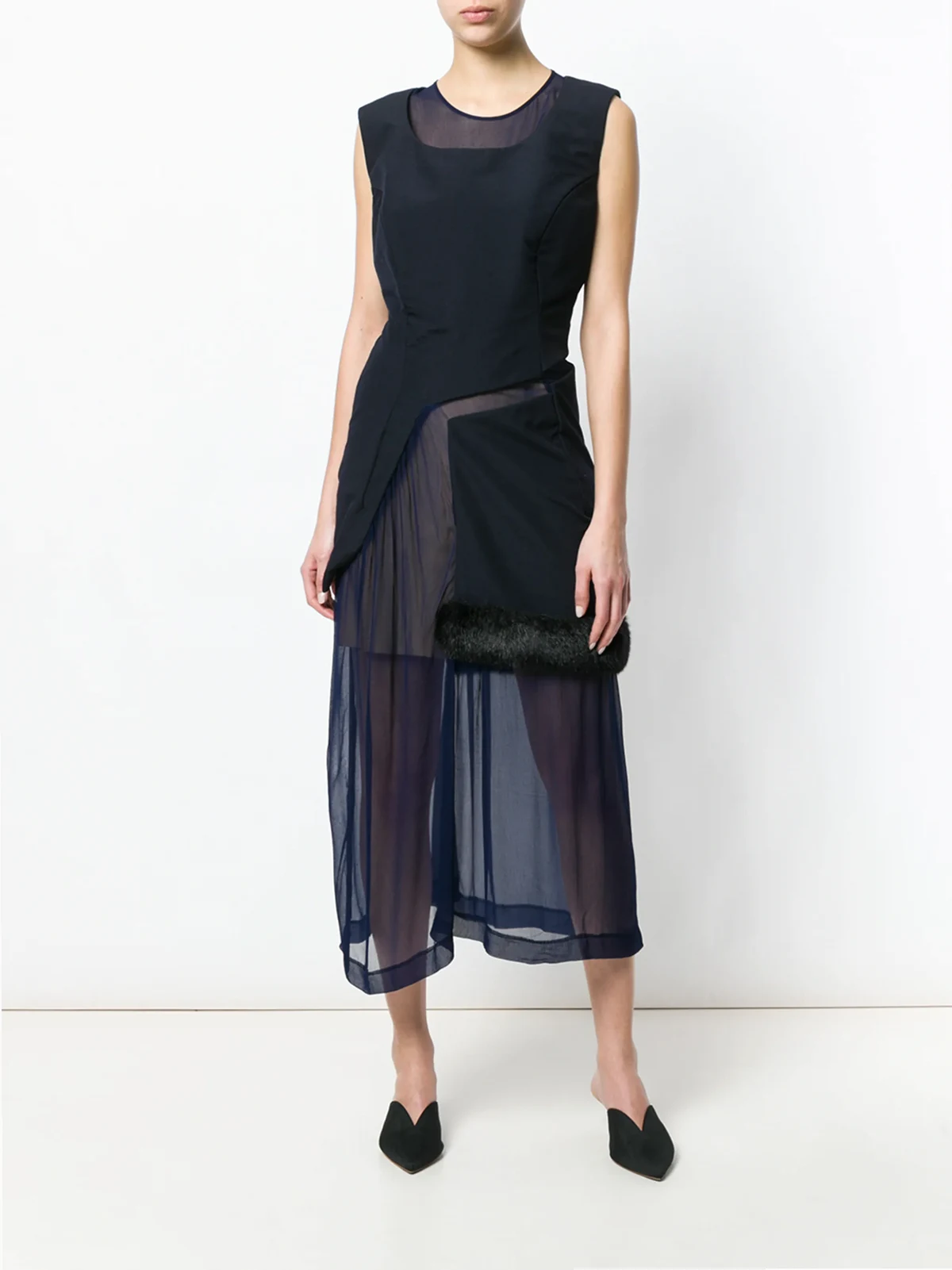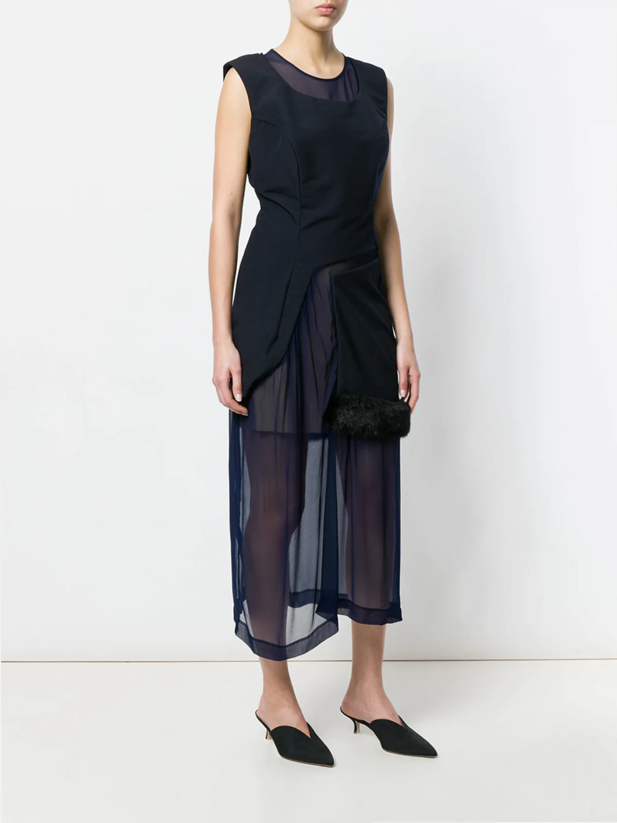 Inventors of defying silhouettes and reinvented techniques, challenging notions of beauty and aesthetics, Comme des Garçons recategorises what is called luxury fashion. In an exquisite sheer construction, this navy blue dress displays a lovely fur effect trim detailing topped over the fluttering long skirt. Crafted in '97, it features a round neck, an invisible back zip fastening, a sleeveless design, a fitted waist, a straight hem and a layered design. Please be mindful that this piece has led a previous life, and may tell its story through minor imperfection. Purchasing this item continues its narrative, so you can be confident that you’re making a POSITIVELY CONSCIOUS choice for the planet. Condition: EXCELLENT. This previously owned item is in near-perfect condition with no signs of damage or use.