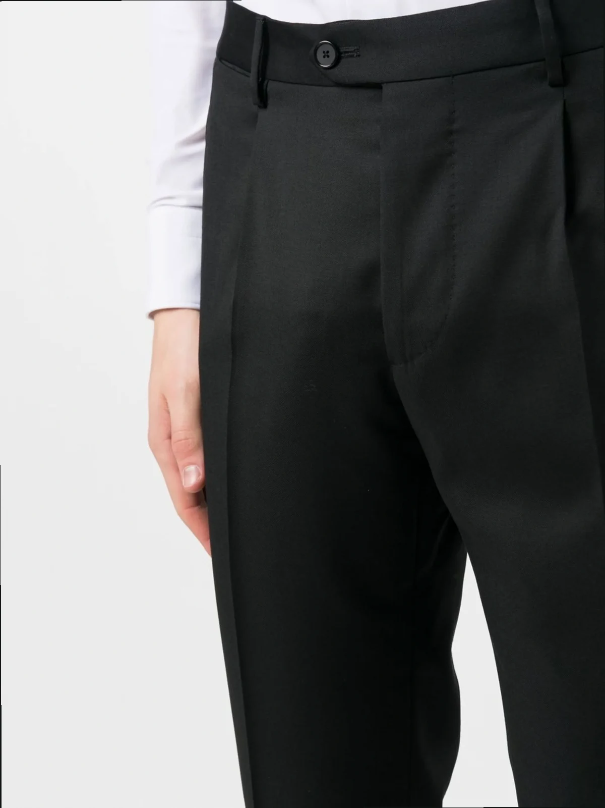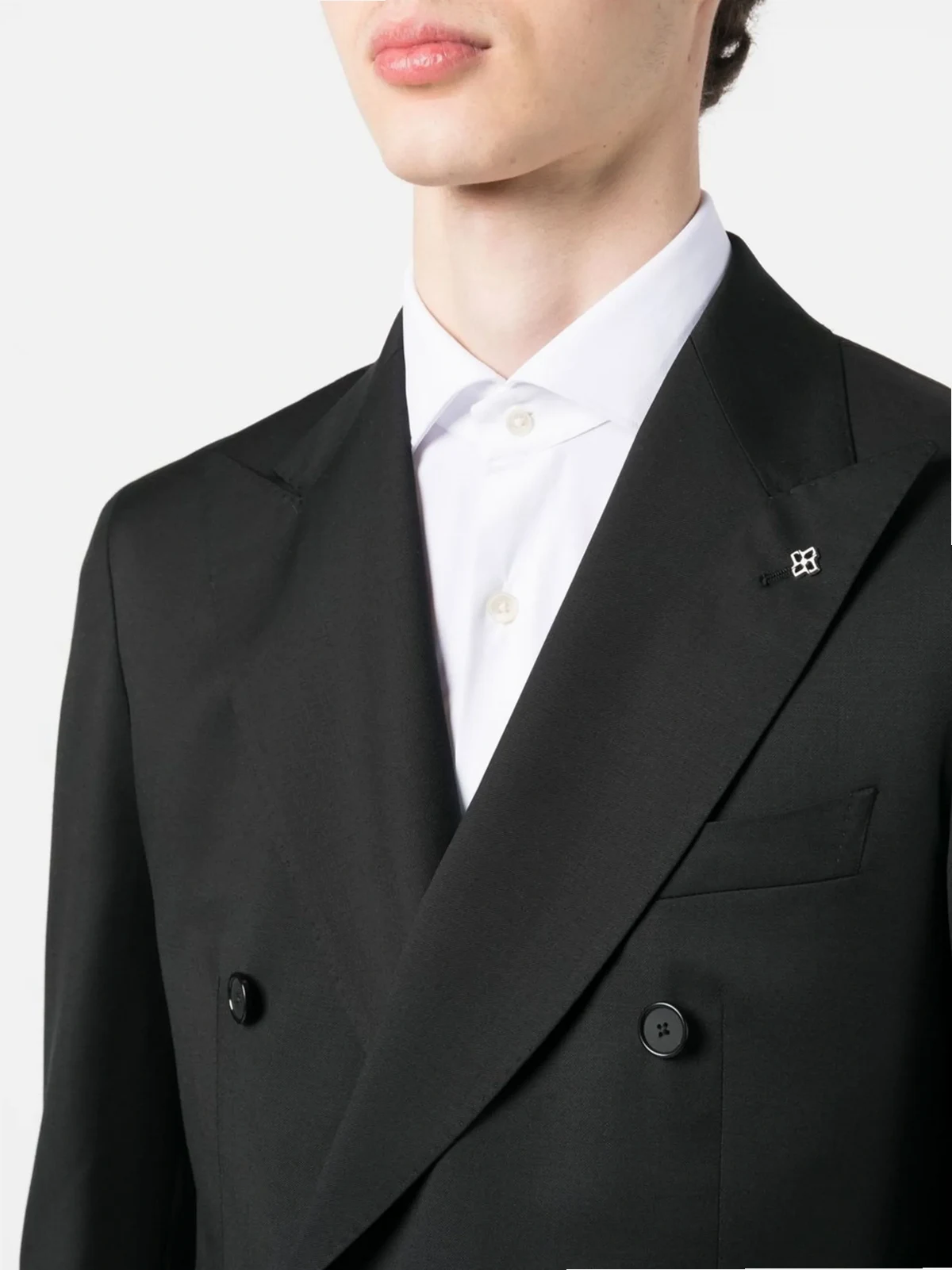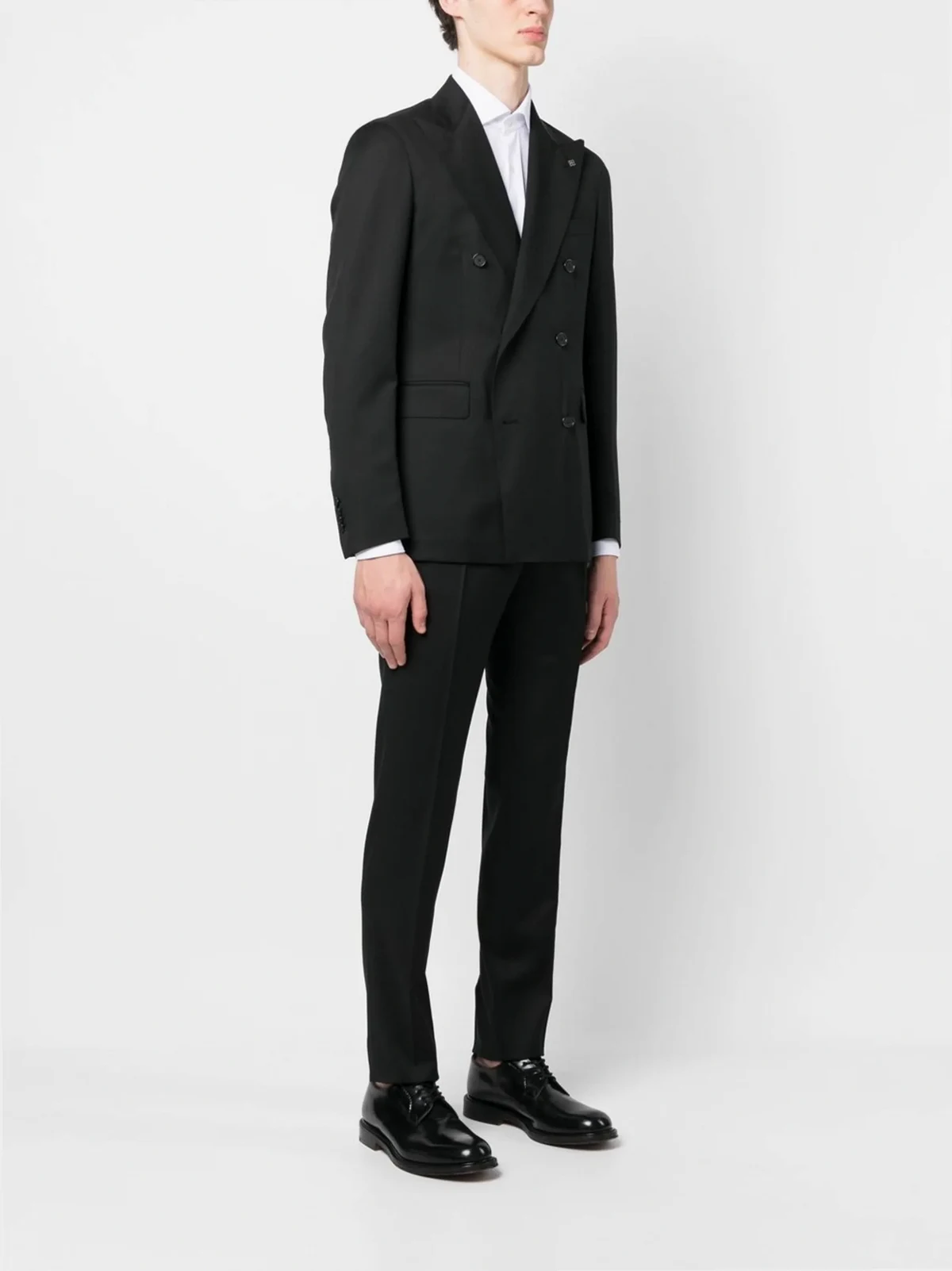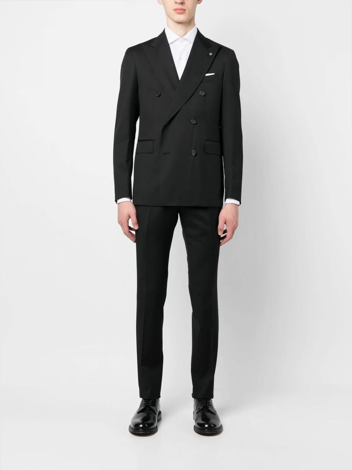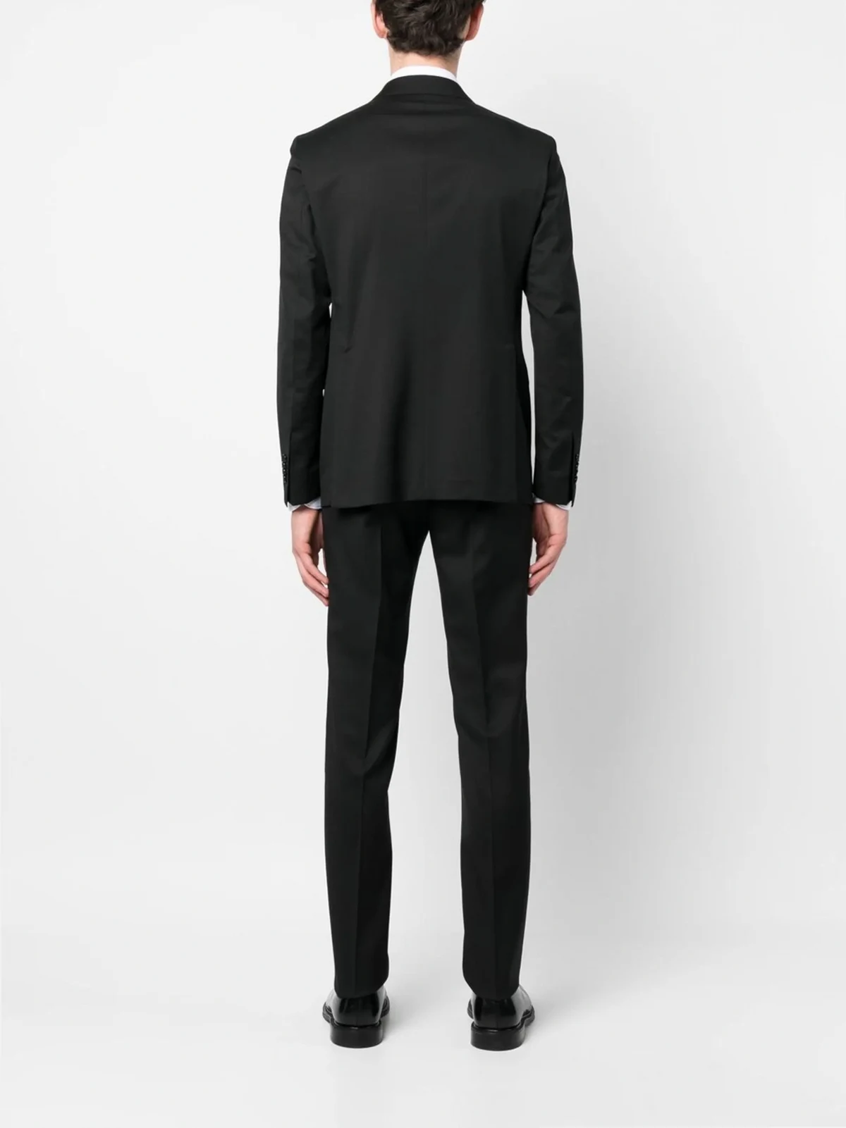 black virgin wool Jacket: peak lapels double-breasted button fastening buttoned-cuff sleeves chest welt pocket two front flap pockets Trousers: straight leg belt loops pressed crease concealed front button fastening two side inset pockets two rear button-fastening jetted pockets