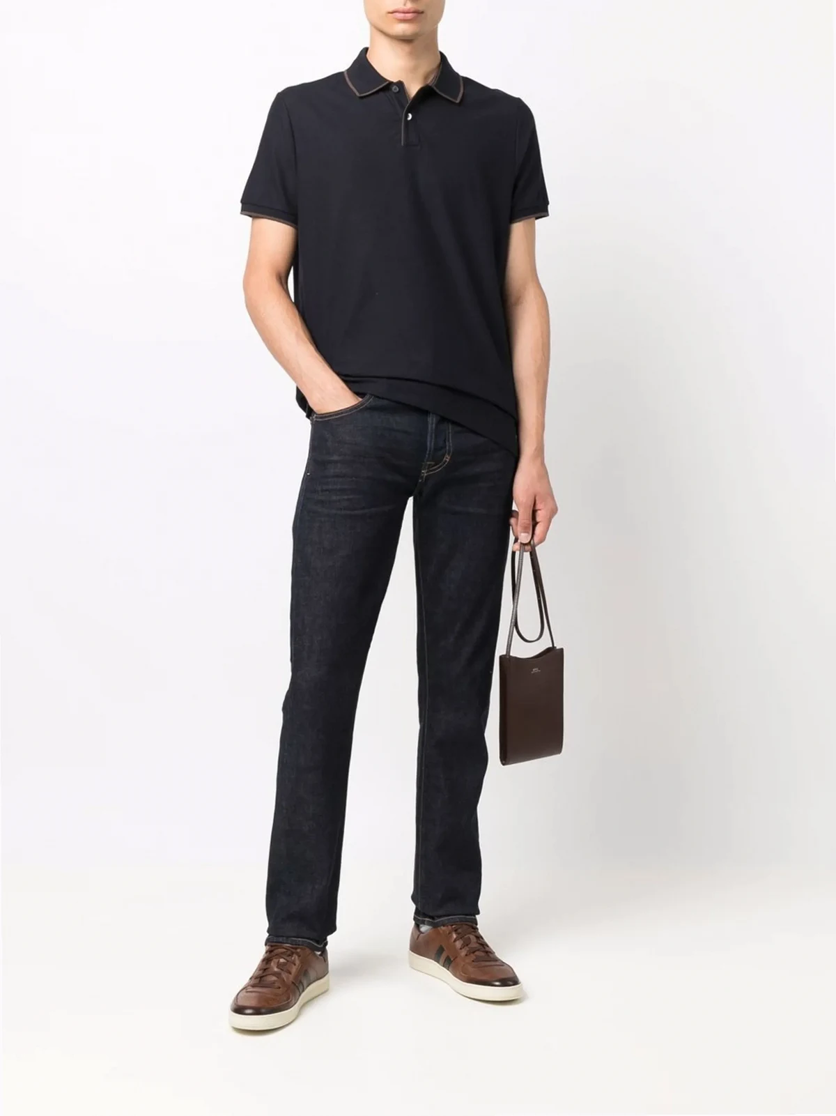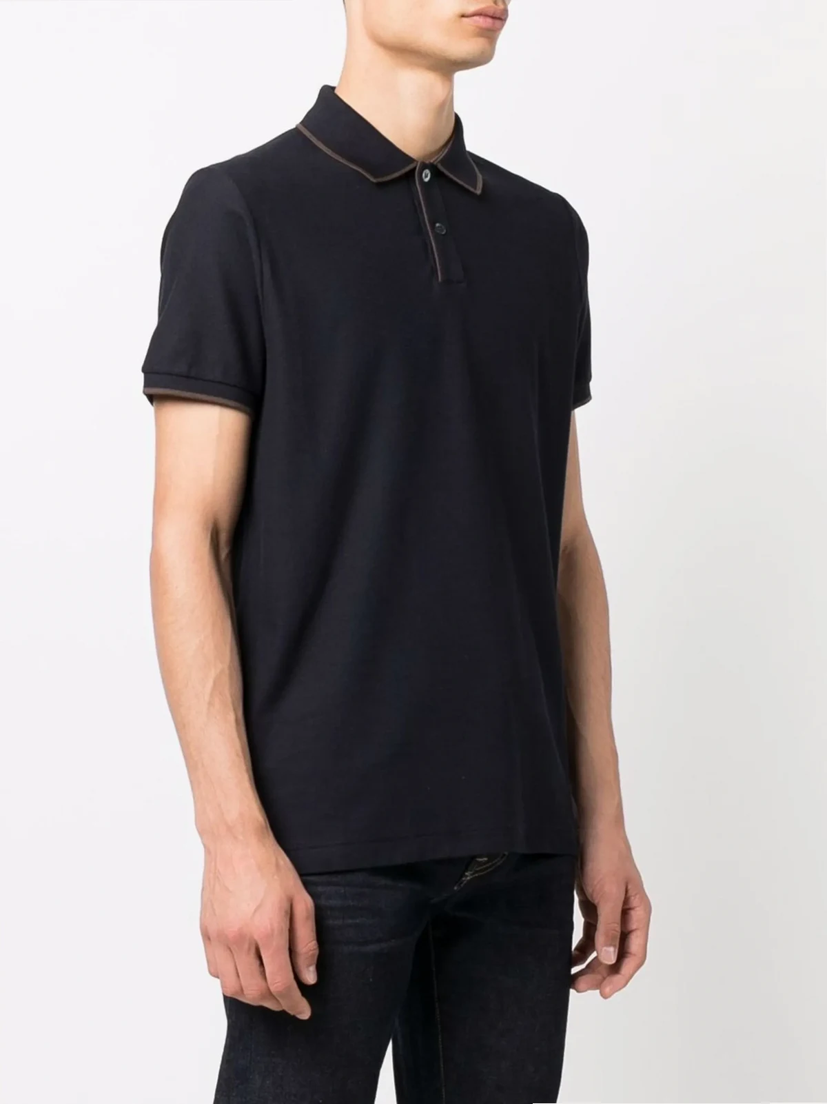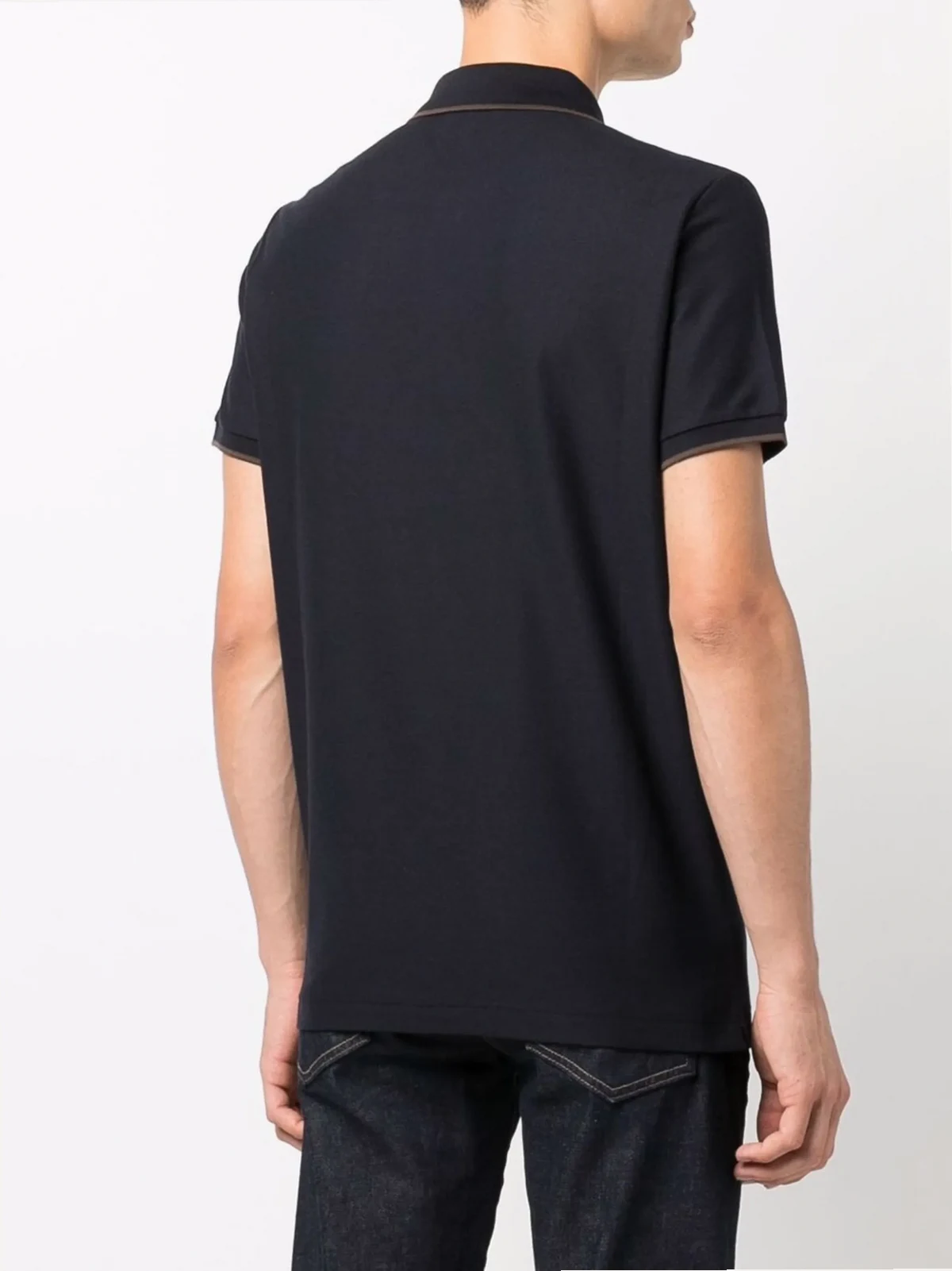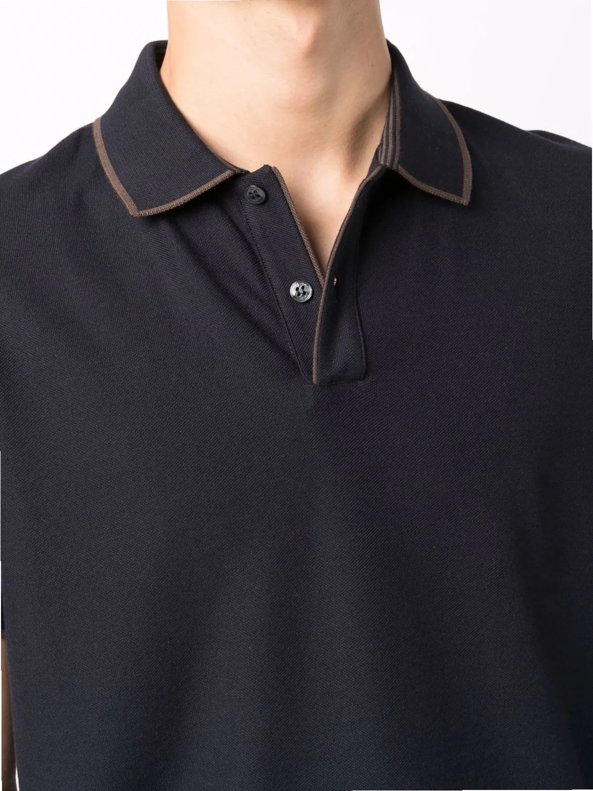 dark blue cotton-blend polo collar front button placket short sleeves straight hem