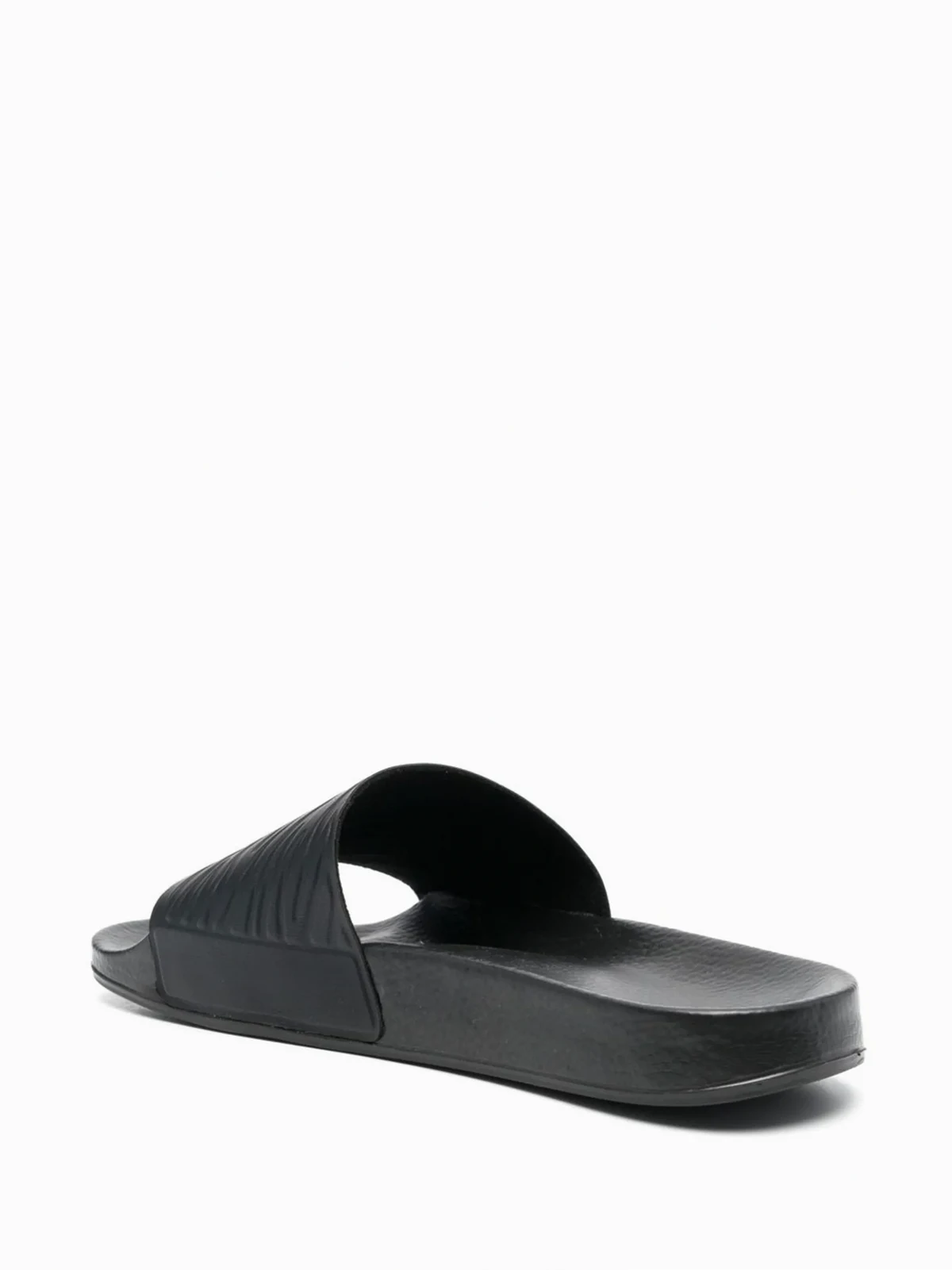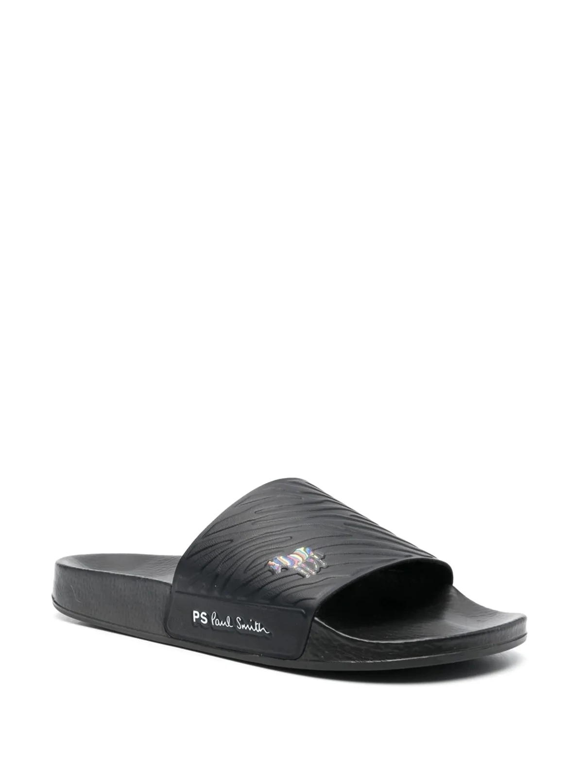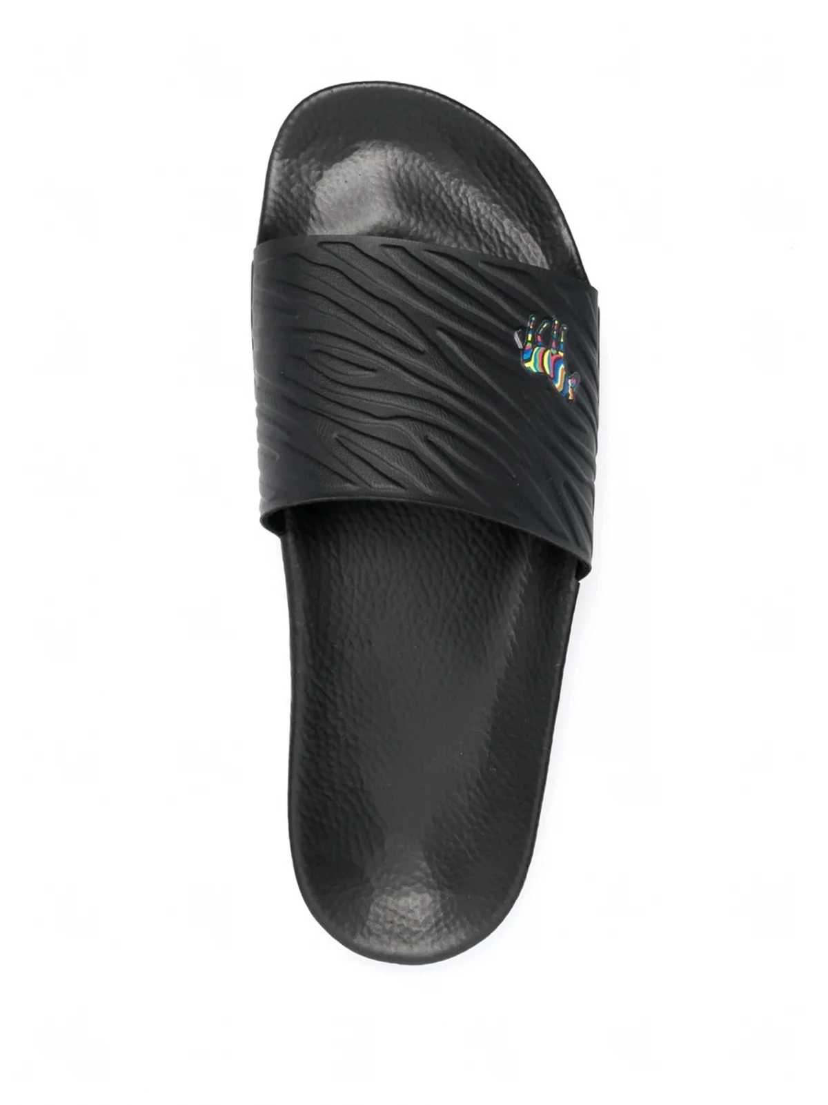 black signature Zebra motif zebra print debossed logo to the side open toe moulded footbed chunky rubber sole
