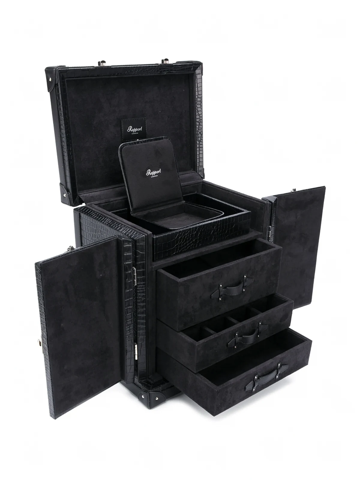 Watch connoisseur since 1898, Rapport London provides excellent offerings for your important timepieces. The Brompton Gentleman's Trunk watch case is crafted from soft crocodile-embossed leather, and secured with three silver-tone clasp locks for peace of mind. Inside homes three removable drawers and separated compartments, ready for your keepsakes.