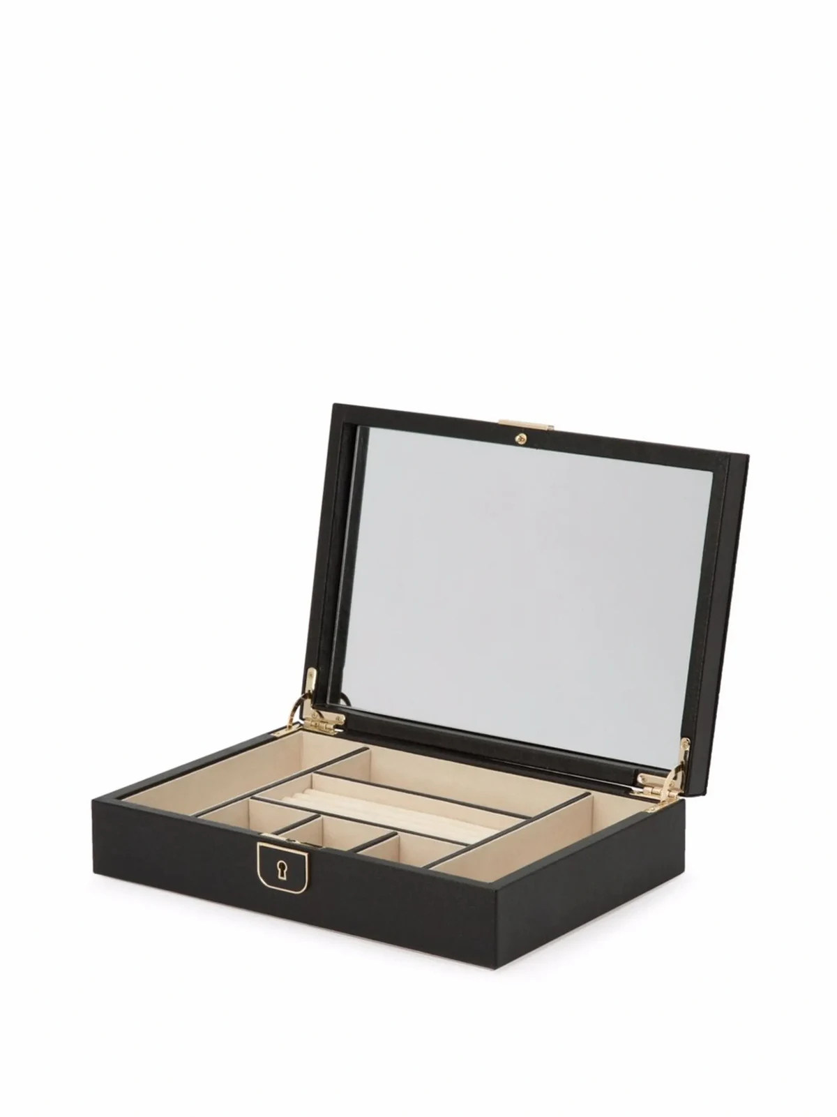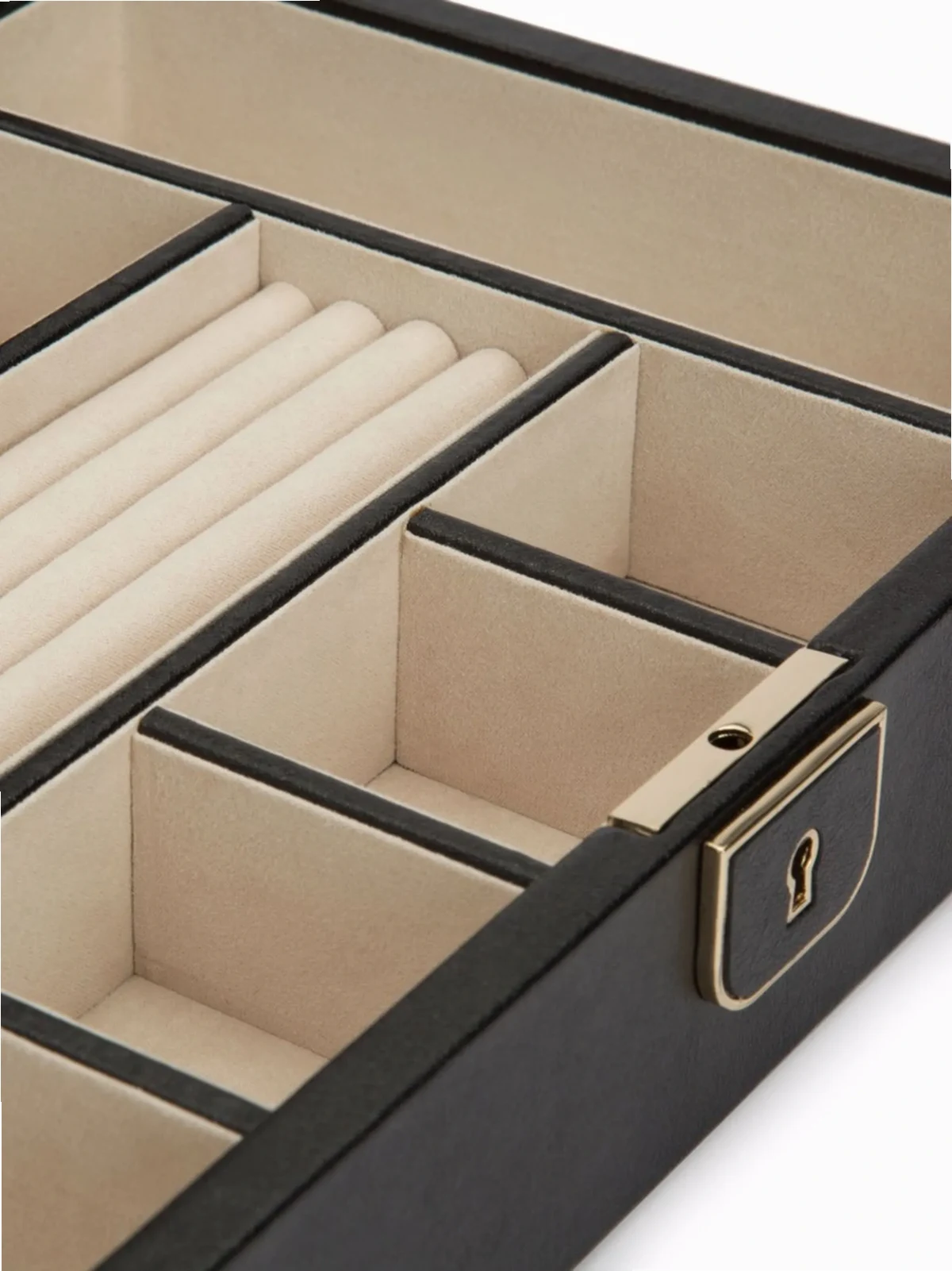 black leather 4 ring rolls 6 storage compartments full mirror LusterLoc™: Allows the fabric lining the inside of your jewelry cases to absorb the hostile gases known to cause tarnishing. Under typical storage conditions, it can prevent tarnishing for up to 35 years