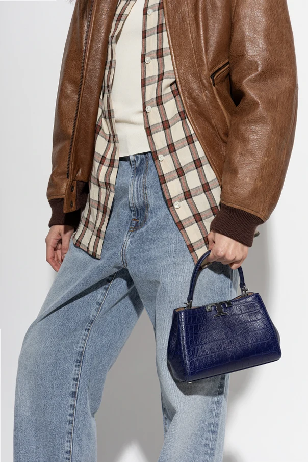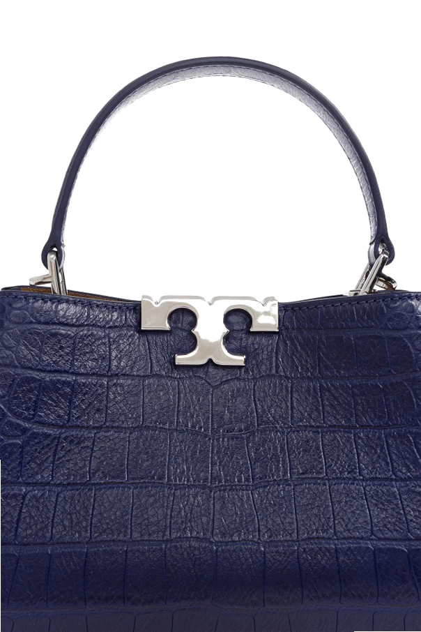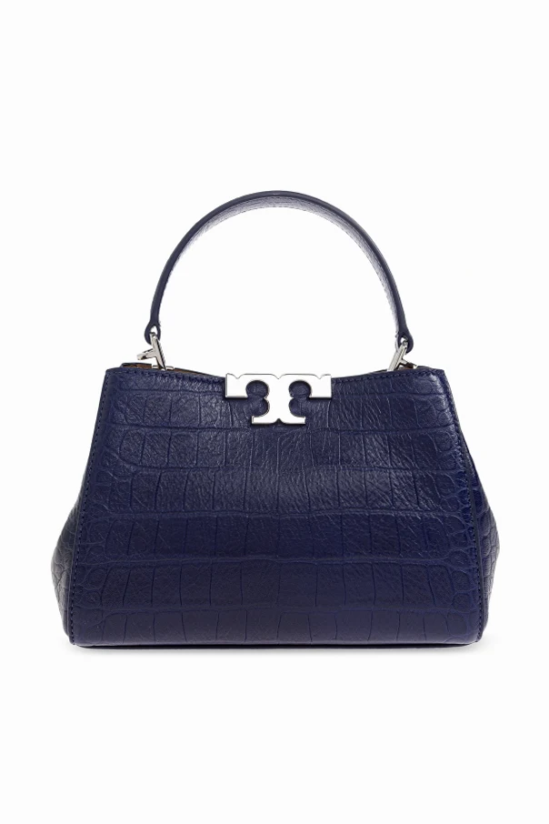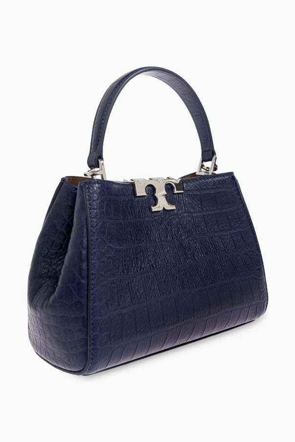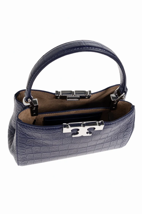 Immerse yourself in understated luxury with the Eleanor Mini Handbag by Tory Burch. This exquisite accessory is expertly crafted from deer leather embossed with an alluring crocodile pattern, setting a sophisticated tone with its deep navy blue hue and refined structure. The bag’s distinguished trapezoidal silhouette, reinforced by a firm construction, maintains its graceful form while offering a modern twist on timeless elegance.