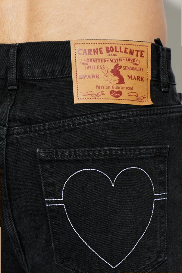 Expertly crafted from robust, high-quality cotton denim, each detail is carefully considered— from the refined metal button and traditional zip fly to the sleek belt loops. The classic four-pocket construction is enhanced by distinctive heart-shaped embroidery on the back pockets, offering a striking, artistic touch.
