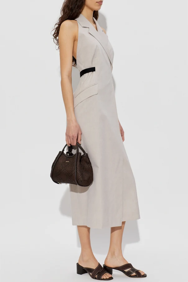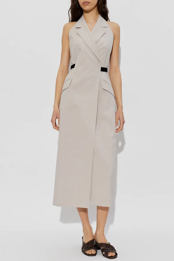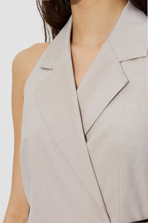The blazer-inspired bodice boasts a notched collar and commanding lapels, with a deep V-neckline and boldly exposed shoulders, introducing a contemporary twist. The distinctive halter neck ties elegantly at the nape, while the front remains beautifully structured and covered.