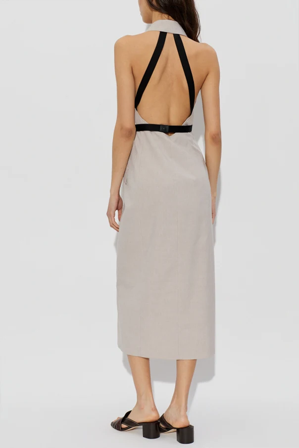 Exposed halter-back with sleek, adjustable black bands