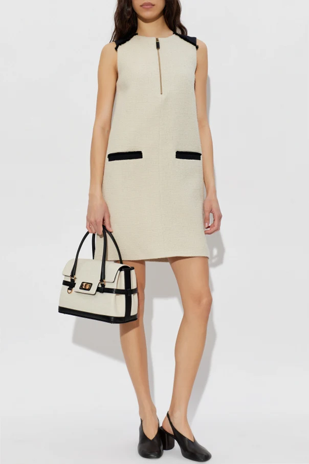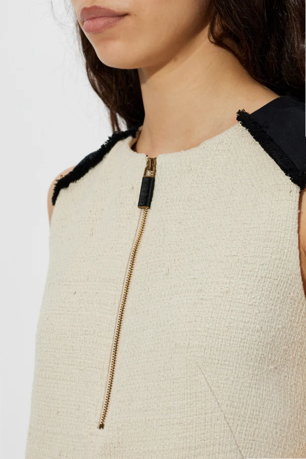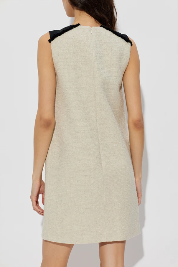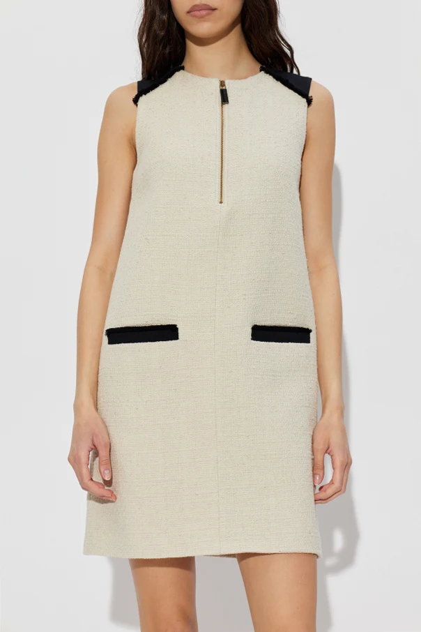 Expertly crafted from a richly textured boucle-tweed fabric, the dress promises an opulent tactile appeal. Wide, satin-finish black accents bring distinguished definition to the shoulders, while striking frayed edges lend an avant-garde flourish. The front boasts two prominent horizontal flap pockets, each trimmed with bold, black piping for a look that balances structure and artistry.