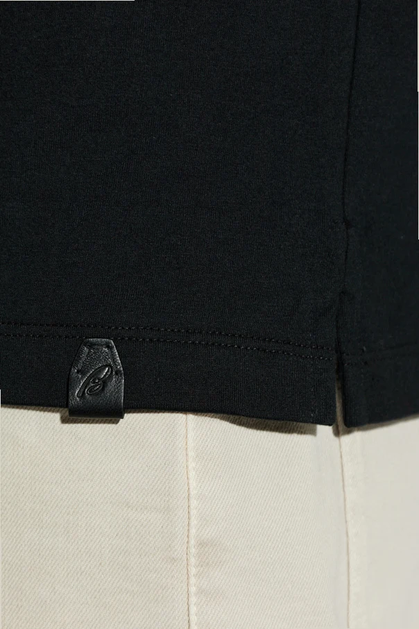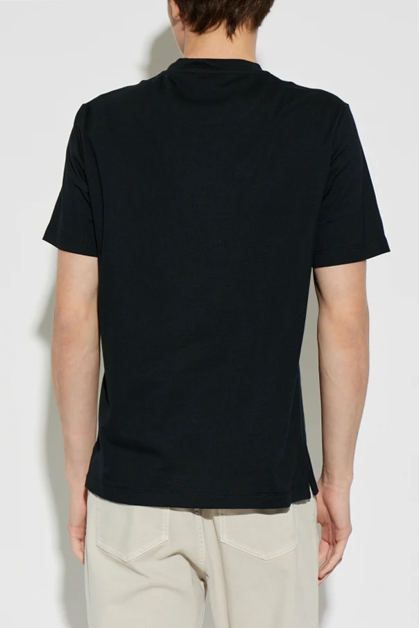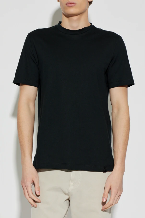 Experience refined simplicity with this Black Crew Neck T-shirt from Brioni. Meticulously crafted from premium, densely woven cotton, this shirt provides an exquisitely smooth and matte finish. The classic, tailored silhouette gently contours the body, complemented by subtly relaxed sleeves that end mid-bicep and a precisely straight hem for a clean, timeless look.