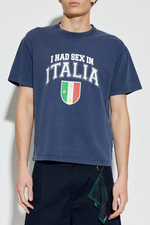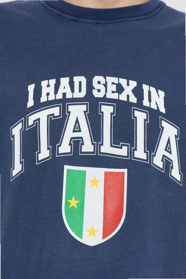Crafted from premium cotton fabric , it promises supreme softness and remarkable comfort for everyday wear. The bold, collegiate-inspired front print— "I HAD SEX IN ITALIA" in crisp white—imbues the shirt with a sense of playful irreverence. Below the statement, a shield motif subtly references the Italian flag, accented by vivid vertical stripes and delicate yellow stars, setting it apart as a conversation piece.
