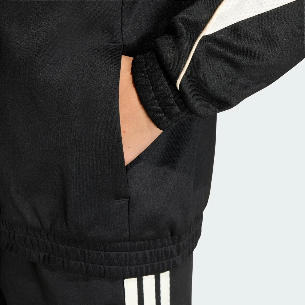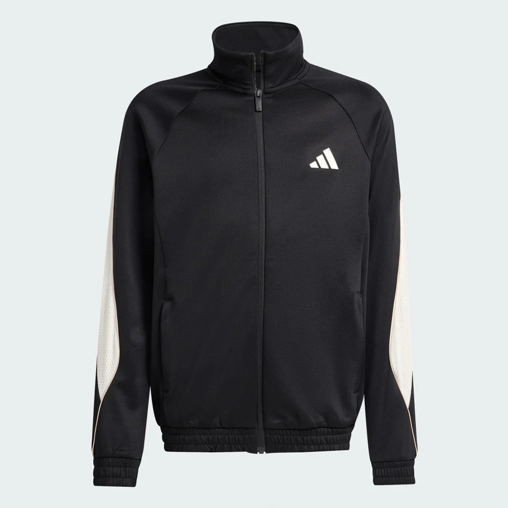 They can bring US sports culture to their wardrobe with the Stadium Track Jacket, a piece that celebrates the passion and creativity of the youth. It adds classic sportswear touches to a contemporary shape.Crafted from thicker interlock fabric, this jacket gives plenty of comfort and durability. The colourblock mesh panel on the sleeves adds an extra sporty touch, with satin piping giving sleekness. Practical side pockets offer convenience and the elasticised waistband and sleeve cuffs provide a snug fit. With a centre front full zip, this jacket is super easy to wear.This piece is a wardrobe must-have, whether they're going out to train or play or embarking on a casual outing. It even comes with 3 Bar branding on the chest for a signature adidas finishing touch.