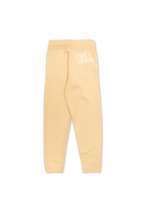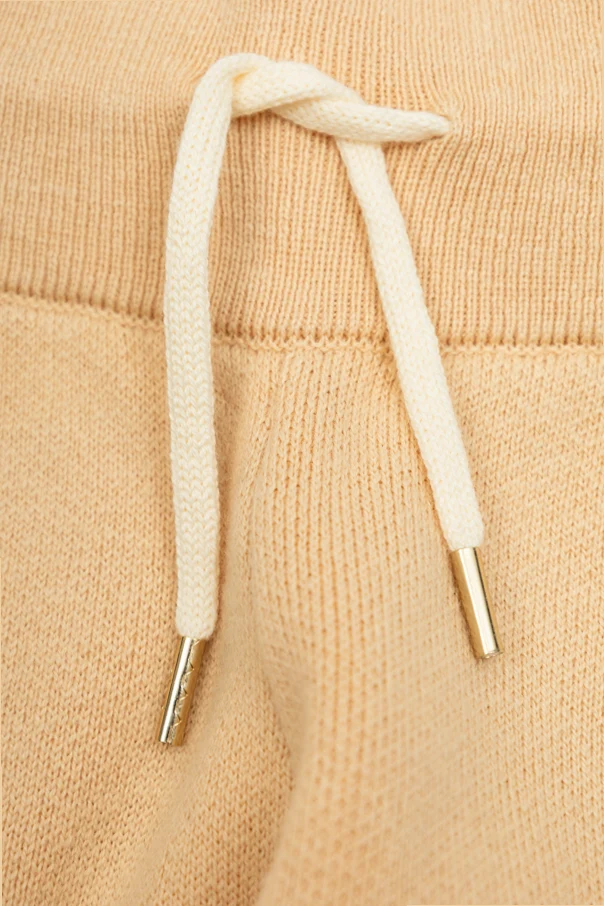 Experience refined comfort with these exclusive beige jogger trousers by Chloé Kids . The elegantly tapered silhouette, finished with ribbed cuffs and an elasticated drawstring waistband, merges timeless sophistication with contemporary ease. Finely knitted from a premium blend of natural fibers, these trousers offer a soft yet substantial feel, elevating all-day wear for young trendsetters.