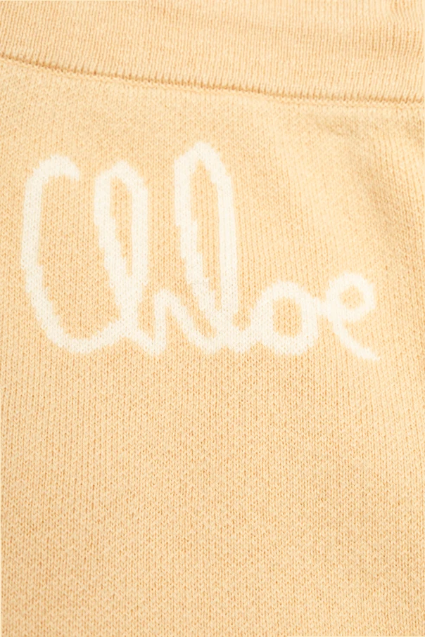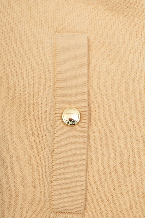 A subtle minimalist design is enriched by exquisite detailing—dainty golden buttons and a distinctive, hand-lettered Chloé logo emblazoned on the back, marking unmistakable designer prestige. This versatile piece, rendered in a classic beige palette, epitomizes understated luxury and modern flair.