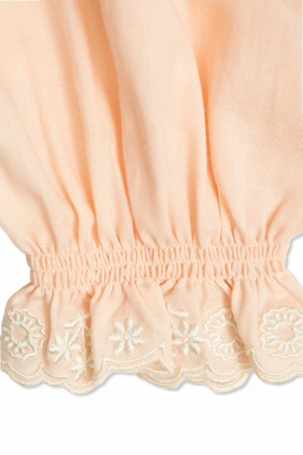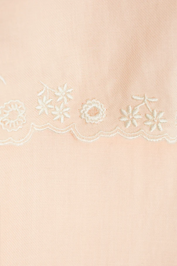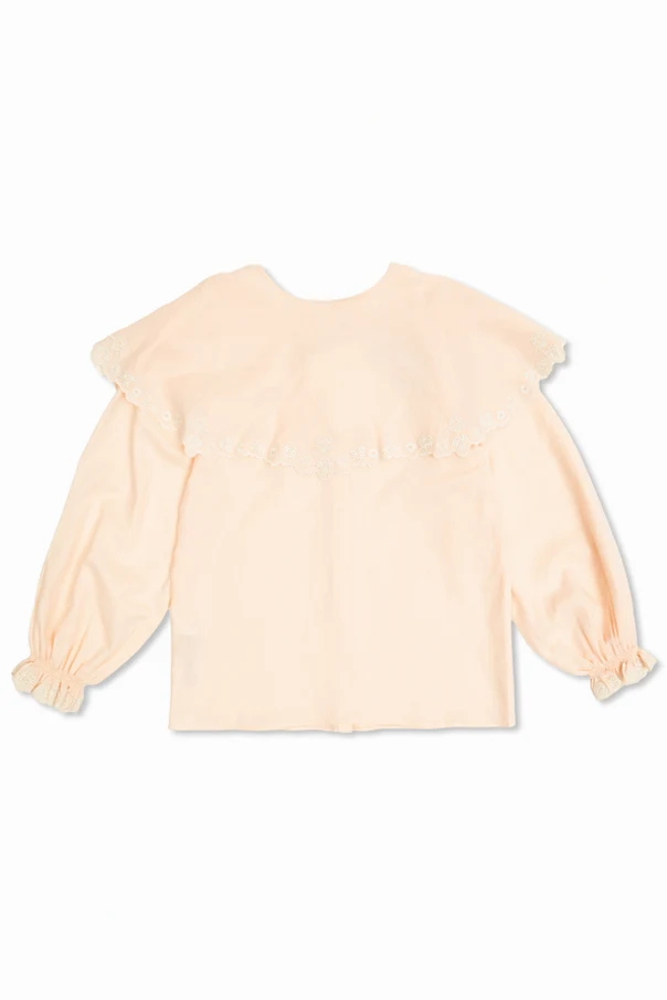 Gracefully embodying timeless charm, this wide-collar shirt by Chloé Kids elevates classic children’s fashion. Crafted from a soft, lightweight cotton fabric, the piece promises delicate comfort and breathability—perfect for every season. Its defining feature, an exquisitely ruffled wide collar extending to the shoulders, is adorned with intricate white floral embroidery, beautifully echoed on the elasticized cuffs of the long sleeves.