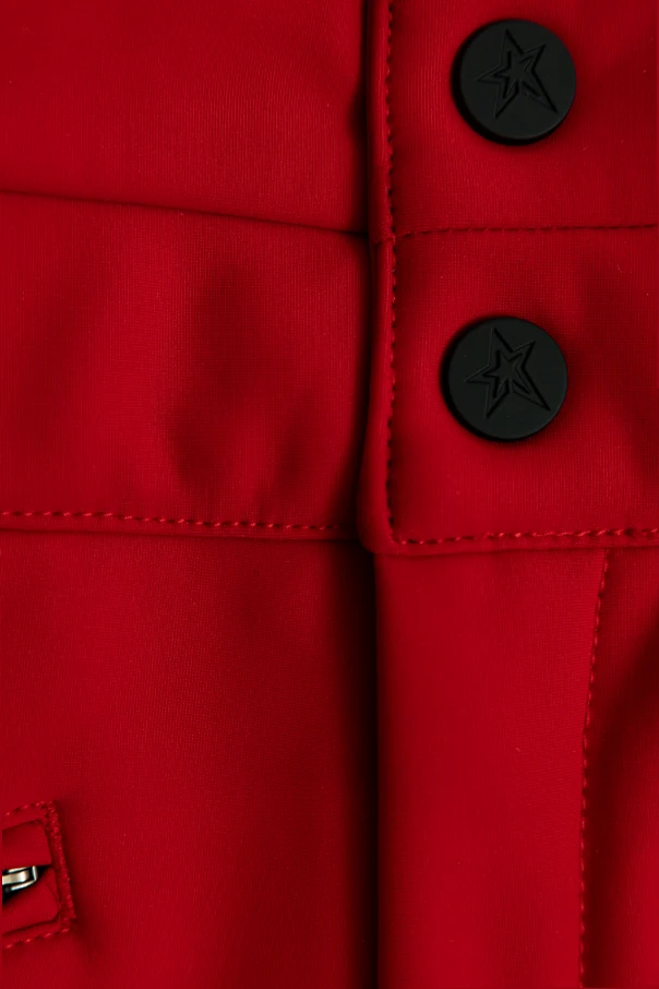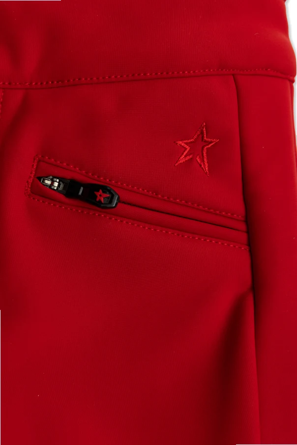 A slightly flared silhouette with contoured stitching and expertly tailored darts elevates the athletic appeal, while vibrant red hues evoke energy and confidence. Discreet, star-accented zipper pulls and buttons, along with a delicate embroidered star above the zippered front pockets, underscore the singularity of this piece. An elasticated black back panel discreetly enhances comfort and fit, providing freedom of movement in every adventure.
