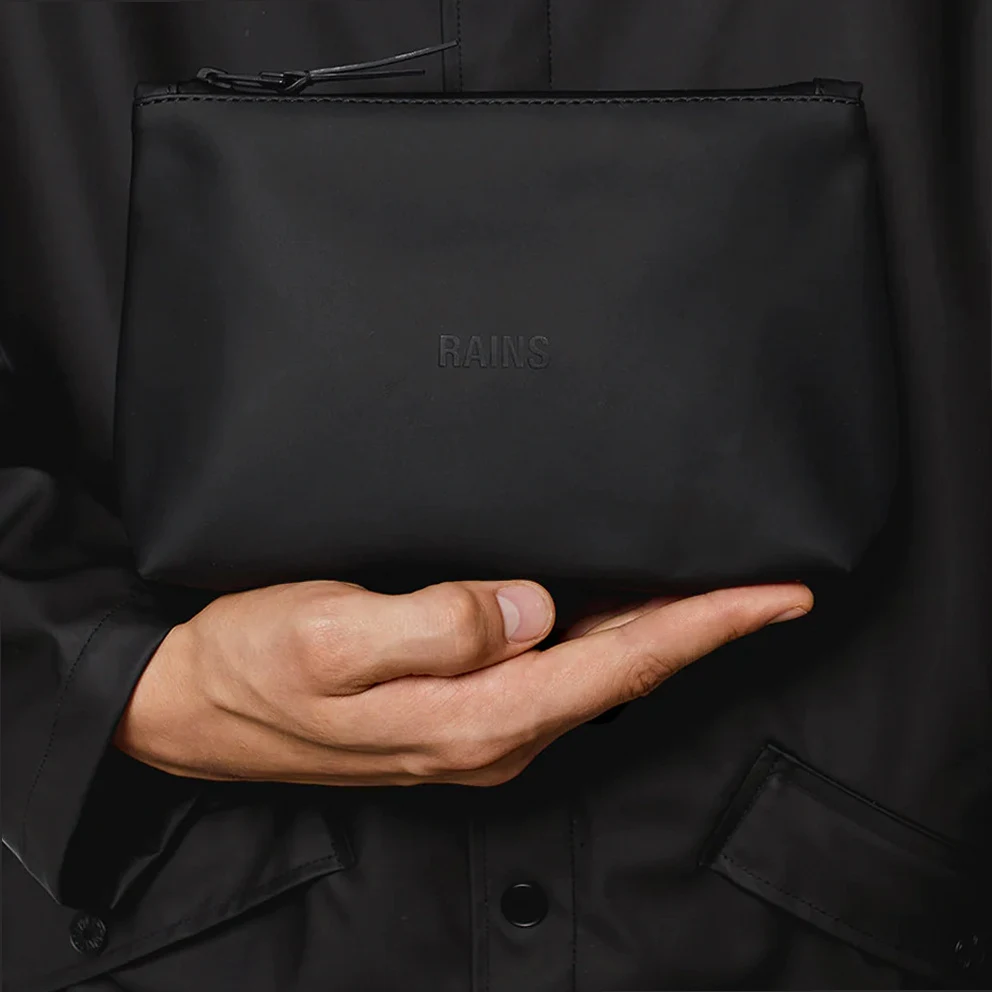The ideal cosmetic kit is the Rains Cosmetic Bag. A compact Rains purse designed to hold small accessories and beauty essentials. The design is characterized by its minimal silhouette, gentle curves at the base and clean seams at its opening. The Rains Cosmetic Bag is cut from Rains' signature waterproof PU fabric, designed for strength, durability and a soft feel. The Rains toiletry bag is finished with an embossed brand logo and a TPU zipper.