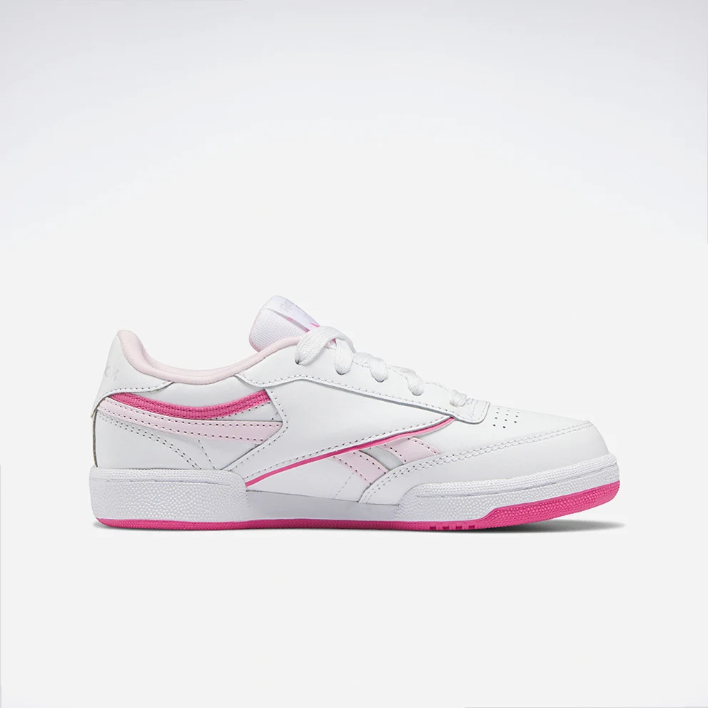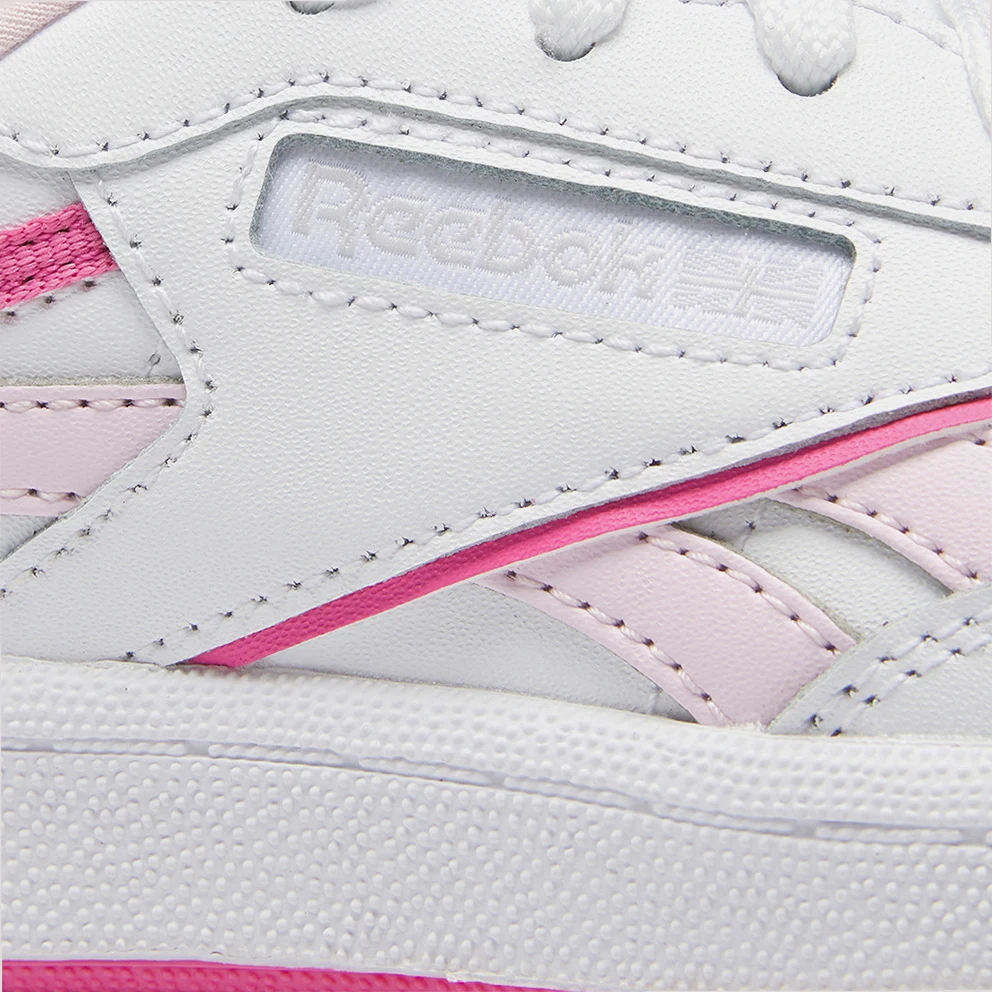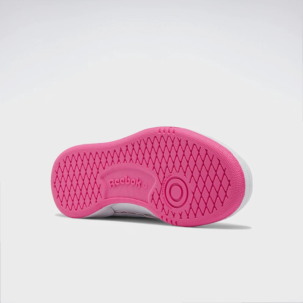 Colour your little one's look with these kids' Reebok shoes. A vibrant side stripe design contrasts with the white leather upper to bring a pop of colour to their look. The Union Jack and a Starcrest logo put the finishing touches on this retro-inspired classic.