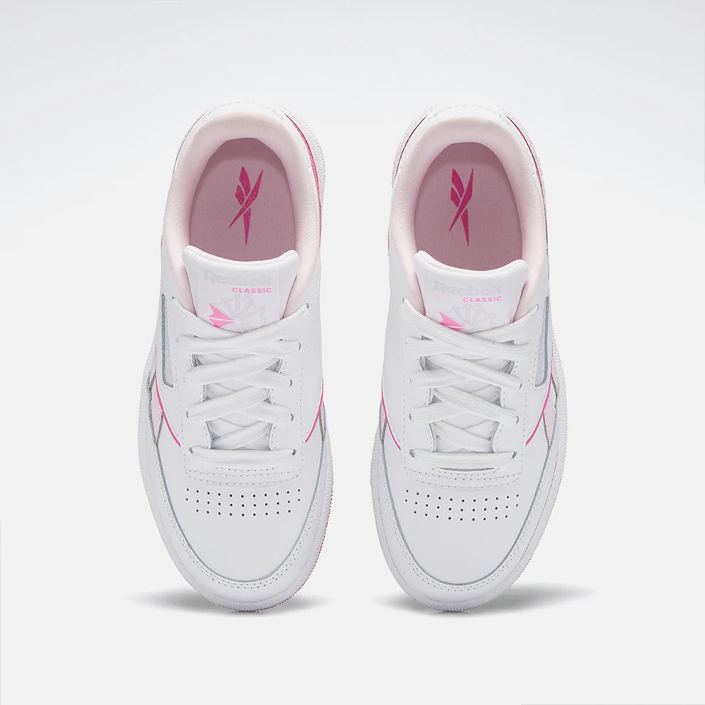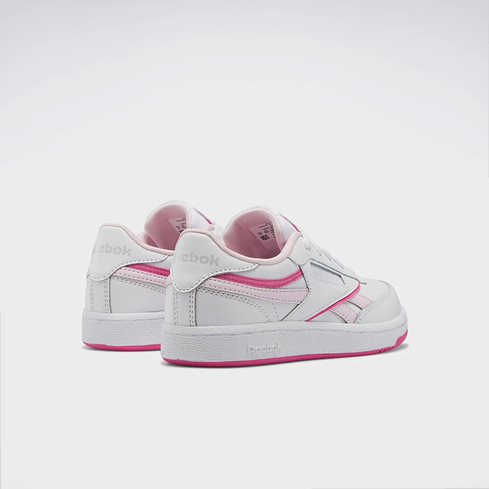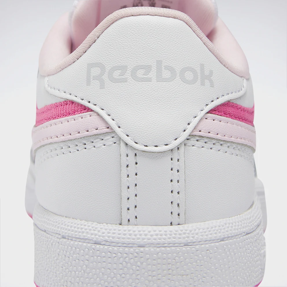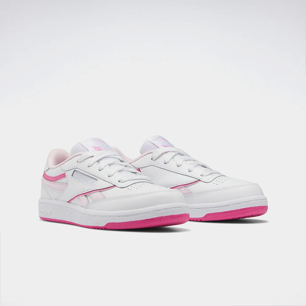 Colour your little one's look with these kids' Reebok shoes. A vibrant side stripe design contrasts with the white leather upper to bring a pop of colour to their look. The Union Jack and a Starcrest logo put the finishing touches on this retro-inspired classic.