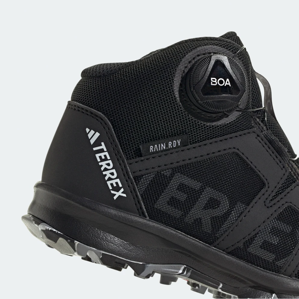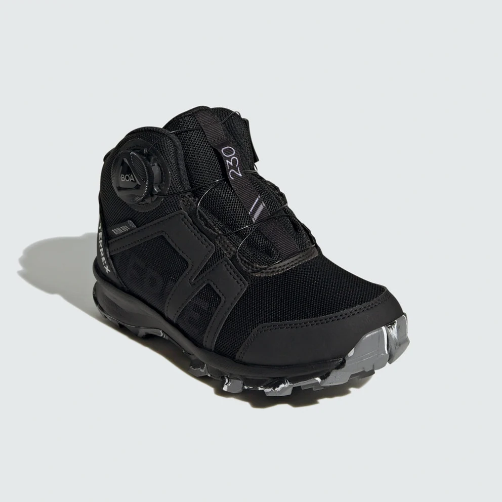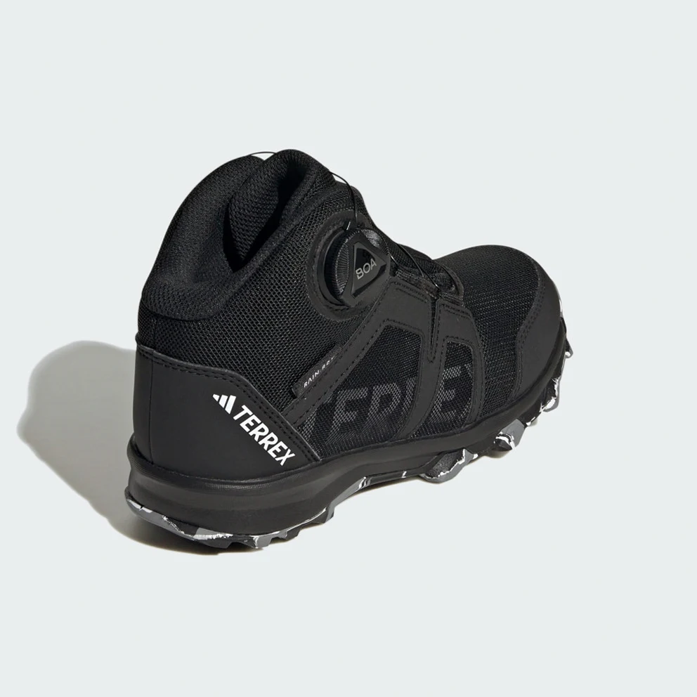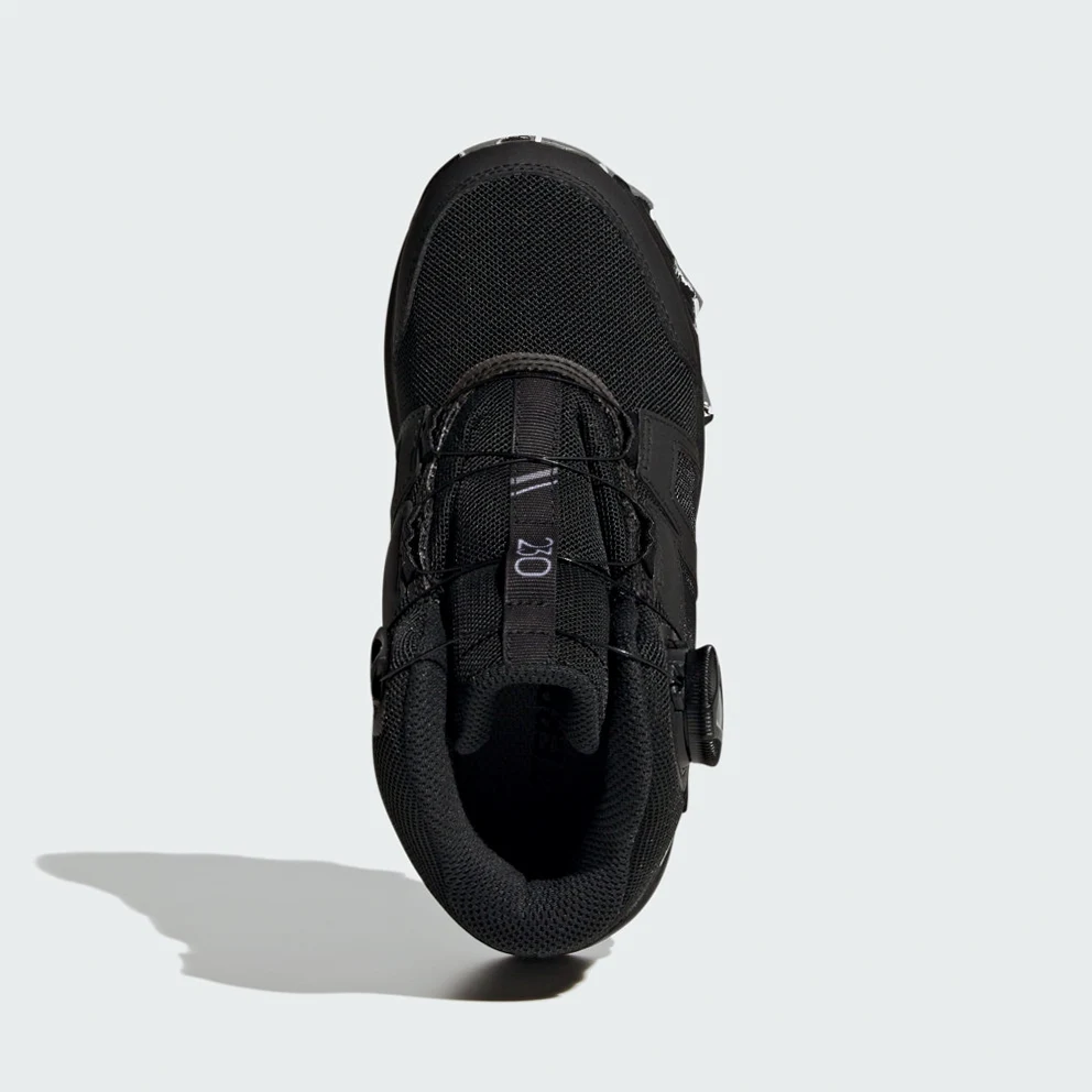Get kids ready for wet weather and rough terrain. When the weather takes a turn for the wet, these kids' adidas hiking shoes keep their feet dry. RAIN.RDY seals out mud and water so kids can hike, play and explore in comfort. The BOA® Fit System makes it super easy to tighten and adjust the fit. A lightweight EVA midsole takes the edge off of rocky terrain, while a Traxion rubber outsole helps kids stay sure-footed on adventures. Made with a series of recycled materials, this upper features at least 50% recycled content. This product represents just one of adidas' solutions to help end plastic waste.