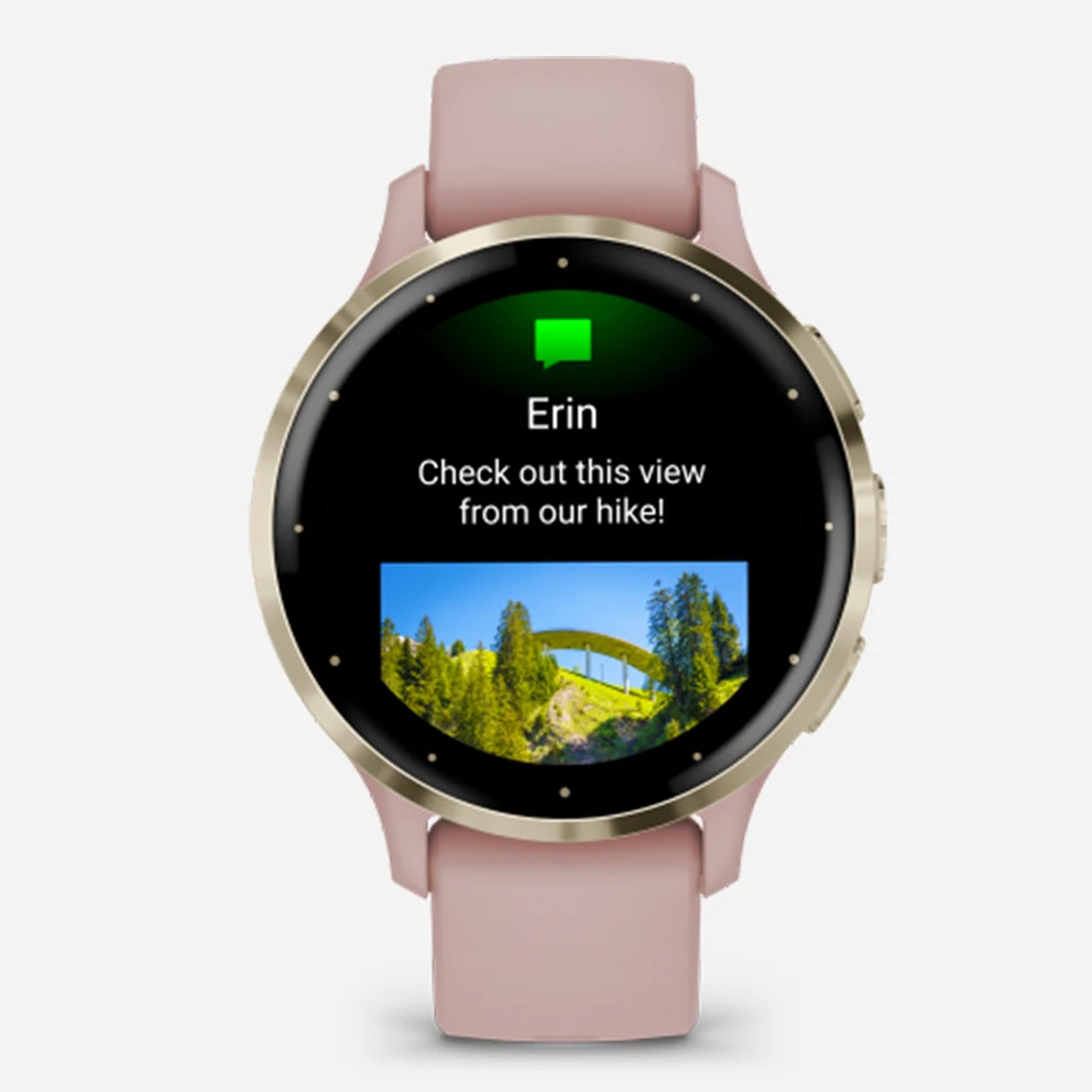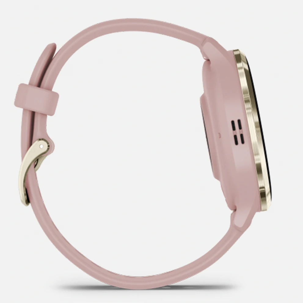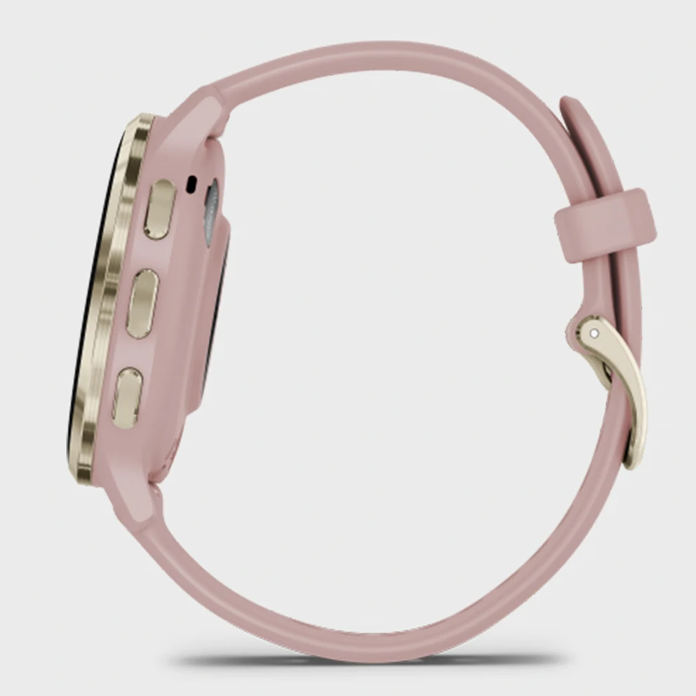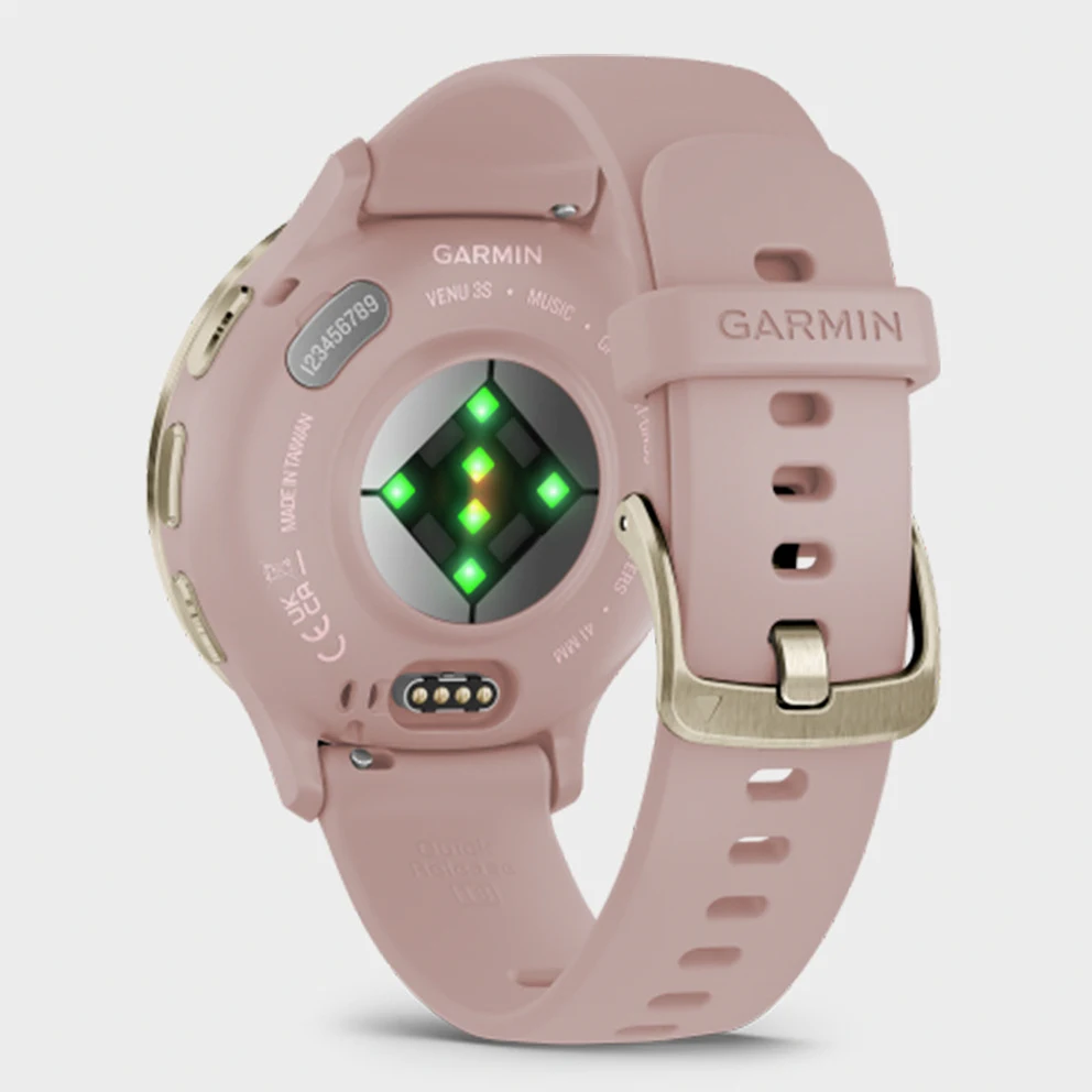 The Garmin Venu 3S is a sleek, small-sized multisport GPS smartwatch (41 mm) with a Soft Gold stainless steel bezel, Dust Rose case, and silicone strap. It features an AMOLED display, innovative health features, and extended battery life — designed to take you from your workout to everyday life.