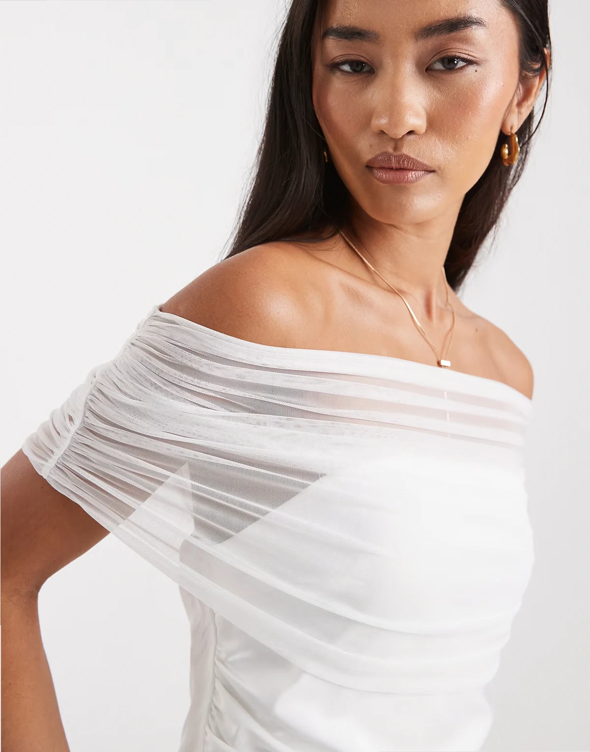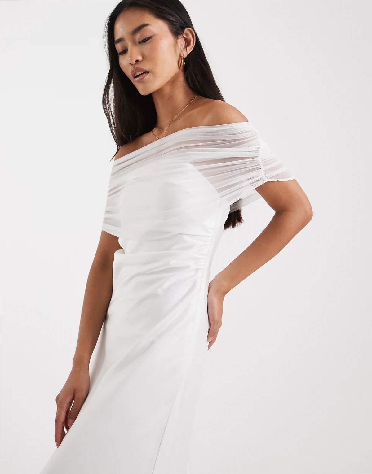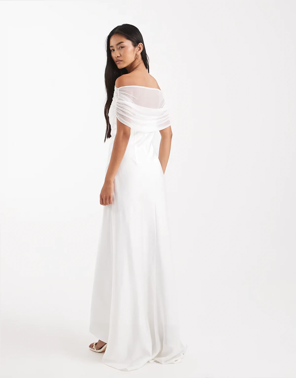 Bridal off the shoulder mesh high low hem maxi dress in white