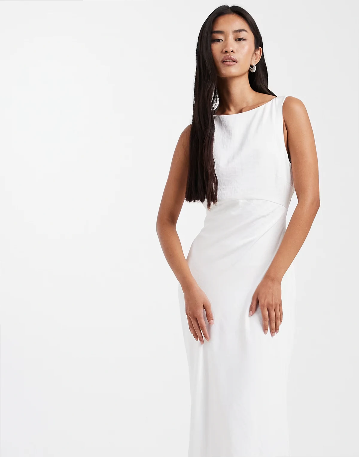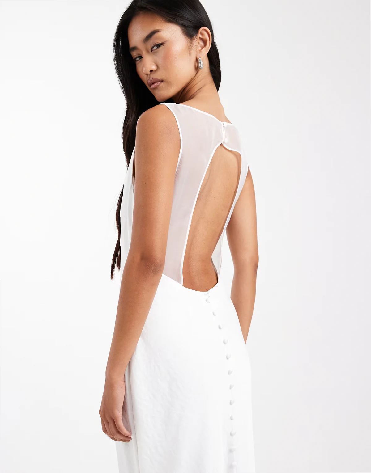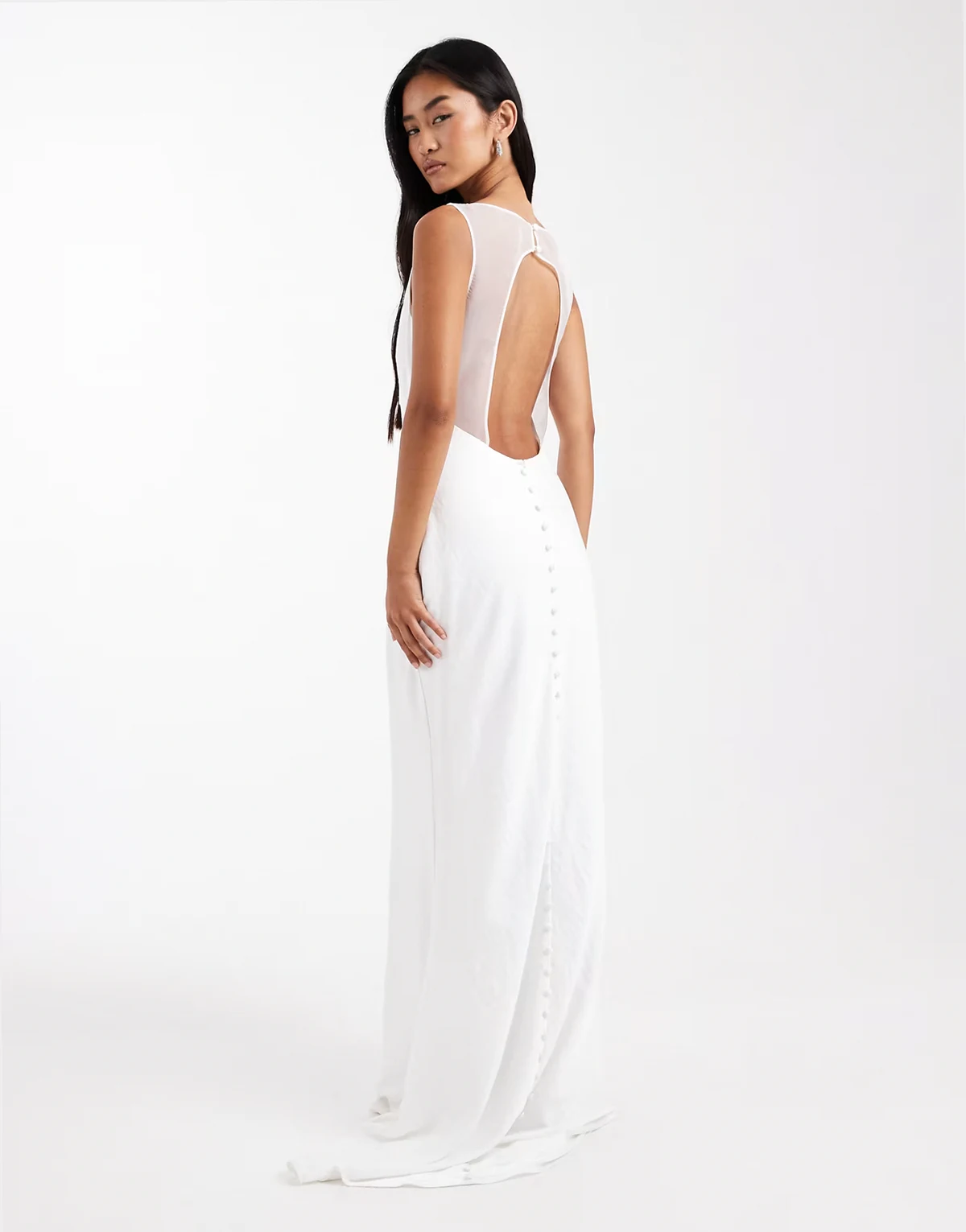 Bridal satin maxi dress with mesh keyhole back and button detail in white