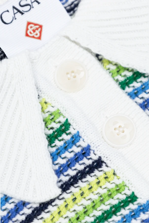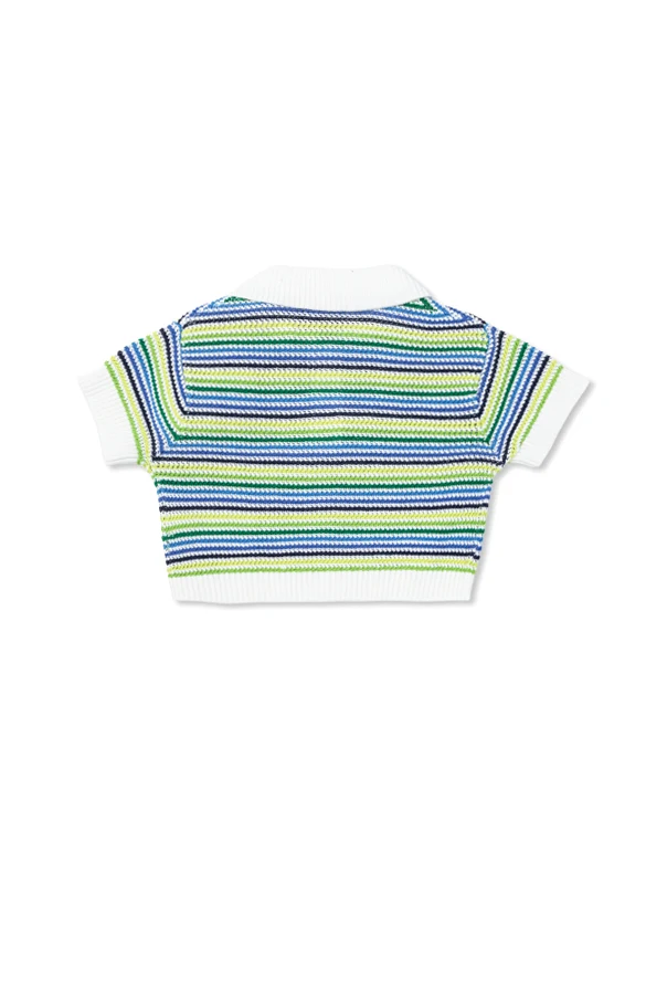 Discover the Casablanca Kids Logo Patch Polo , the epitome of sophistication tailored for the young trendsetter. Exquisitely crafted from sumptuous, high-quality cotton knit, this polo offers a remarkable blend of comfort, breathability, and refined softness—perfectly suited for delicate skin. The short, tailored cut presents a modern silhouette, while the striking horizontal stripes in green, yellow, blue, white, and navy create an unmistakably vibrant aesthetic.