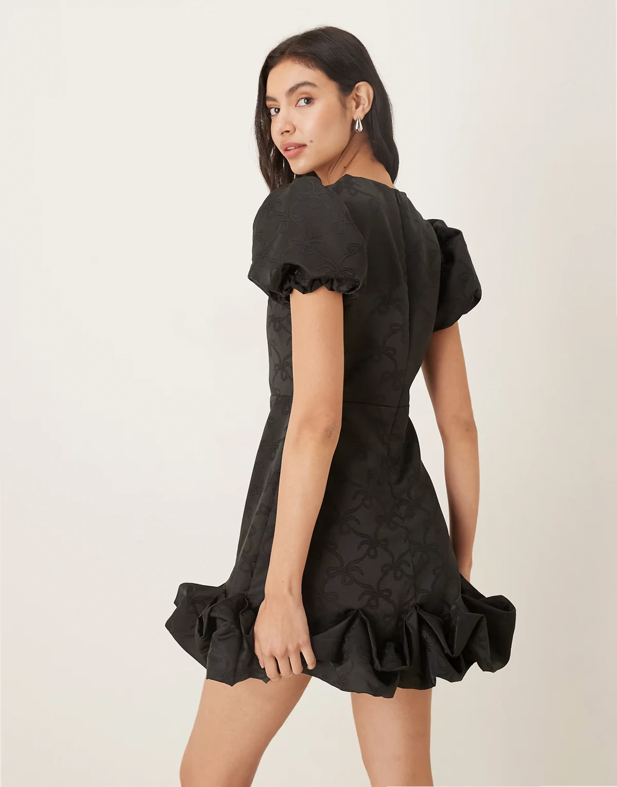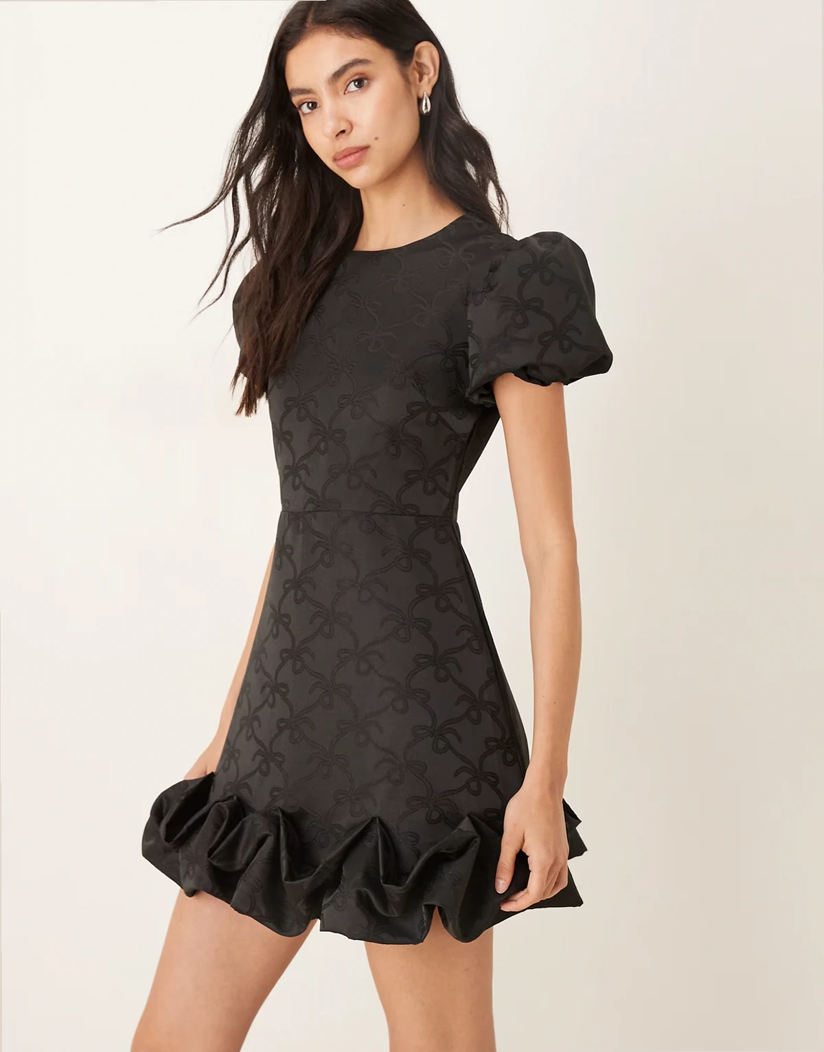 puff sleeve ruffle hem mini dress in black bow print